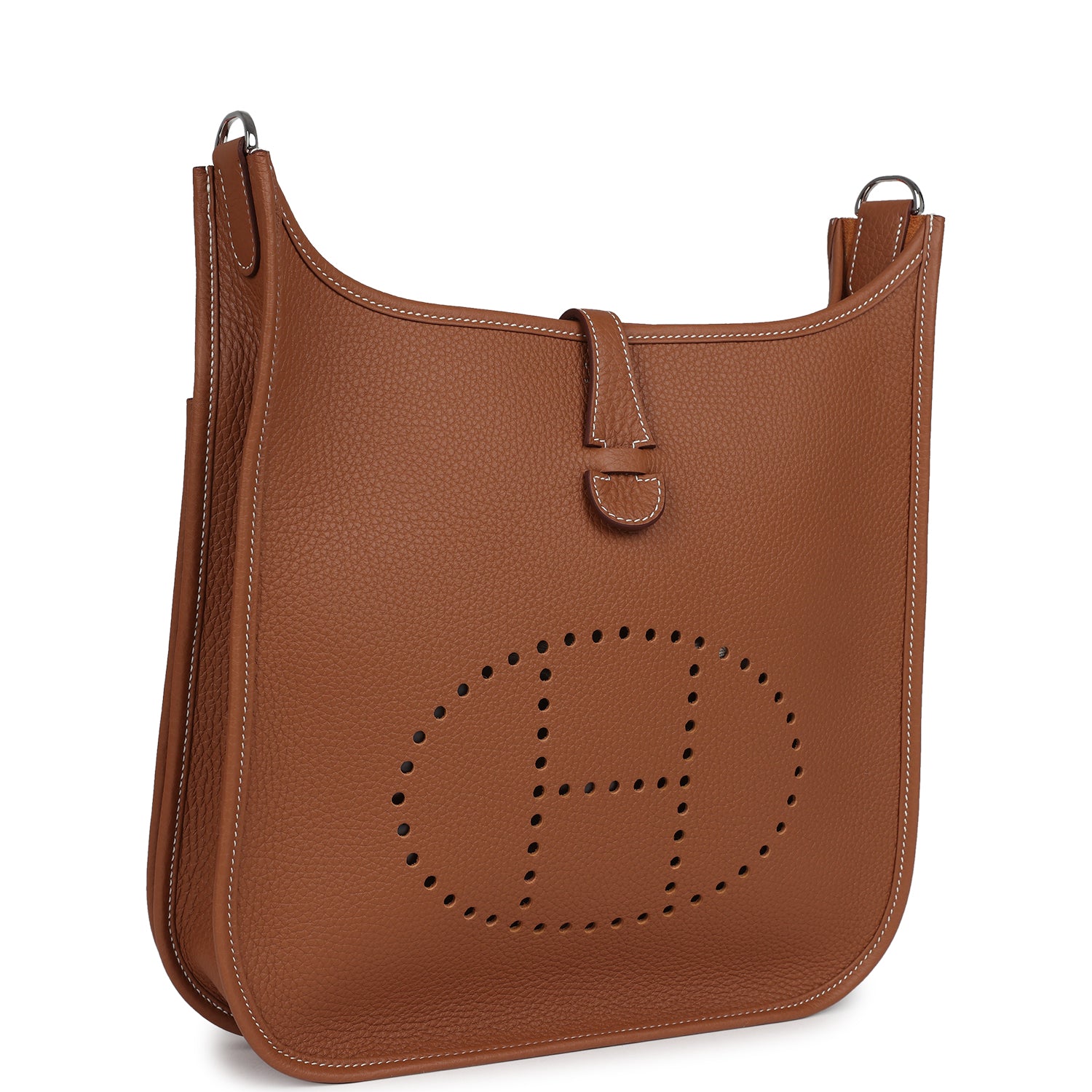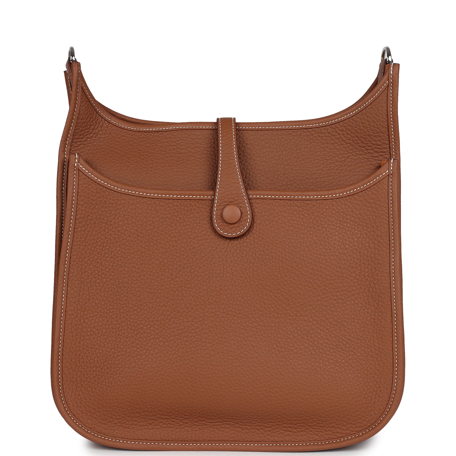 Evelyne is in Gold clemence leather with palladium hardware and has contrast stitching, pull tab top closure and Gold removable canvas and leather shoulder/crossbody strap.
