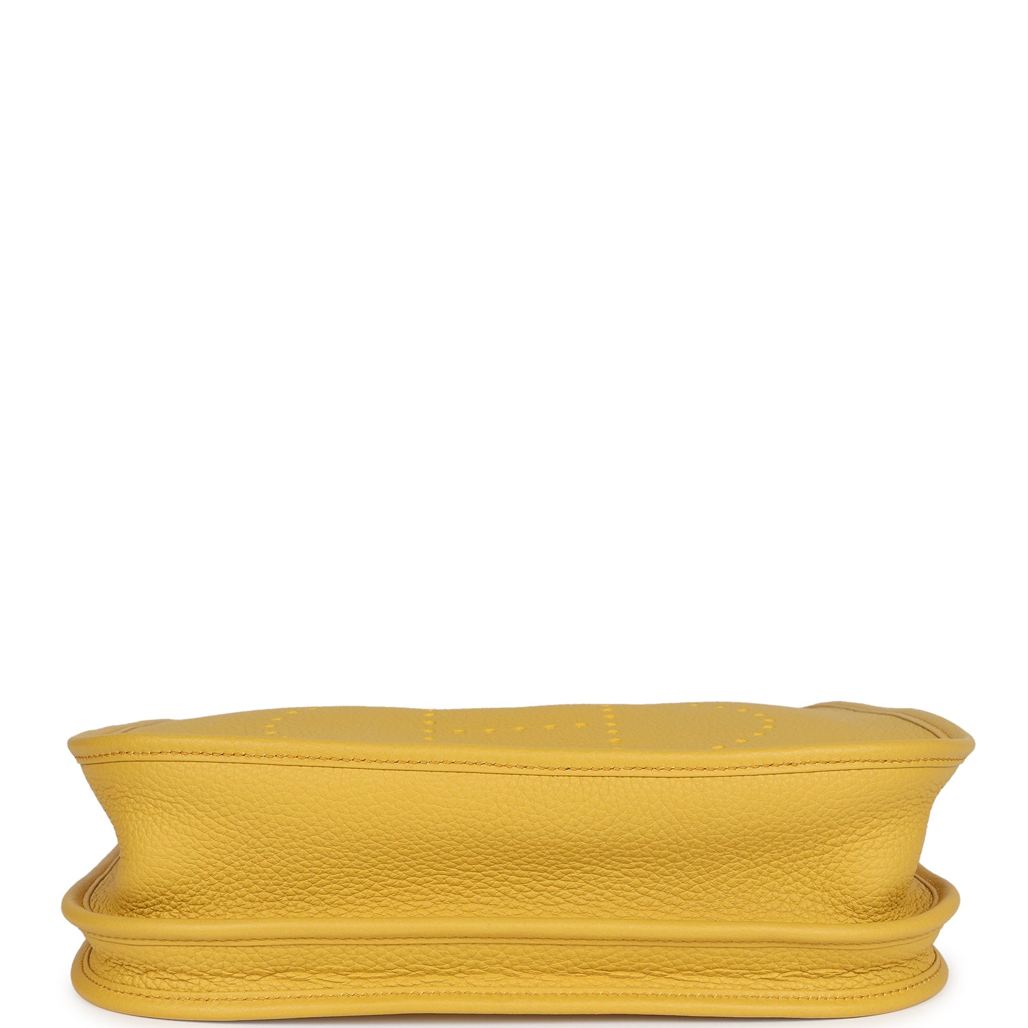 Evelyne is in Sun clemence leather with palladium hardware and has tonal stitching, pull tab top closure and removable canvas and leather shoulder/crossbody strap.