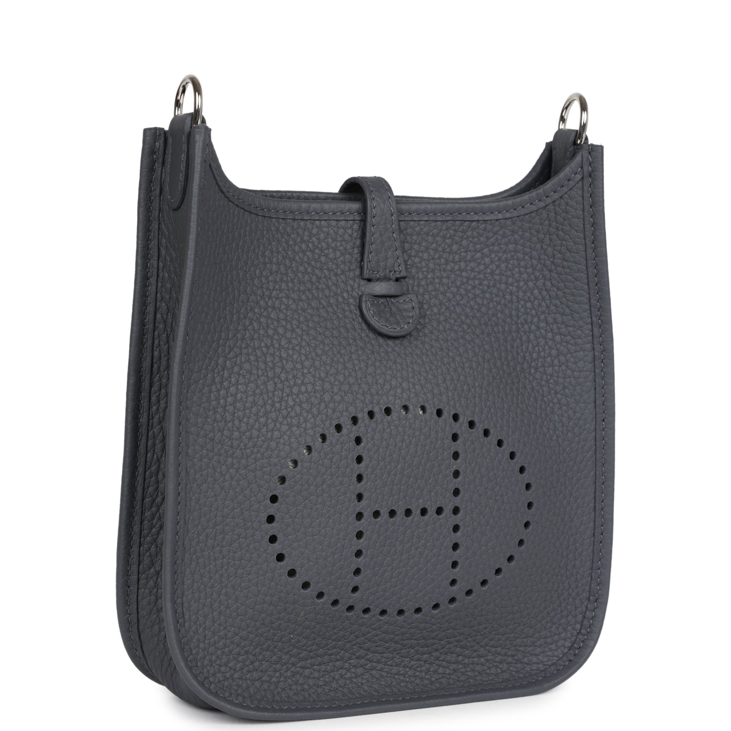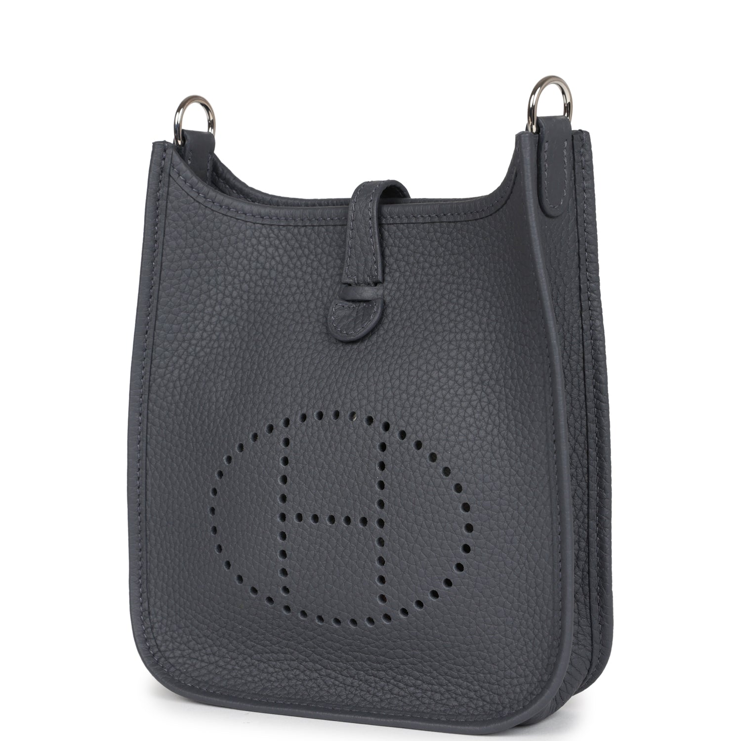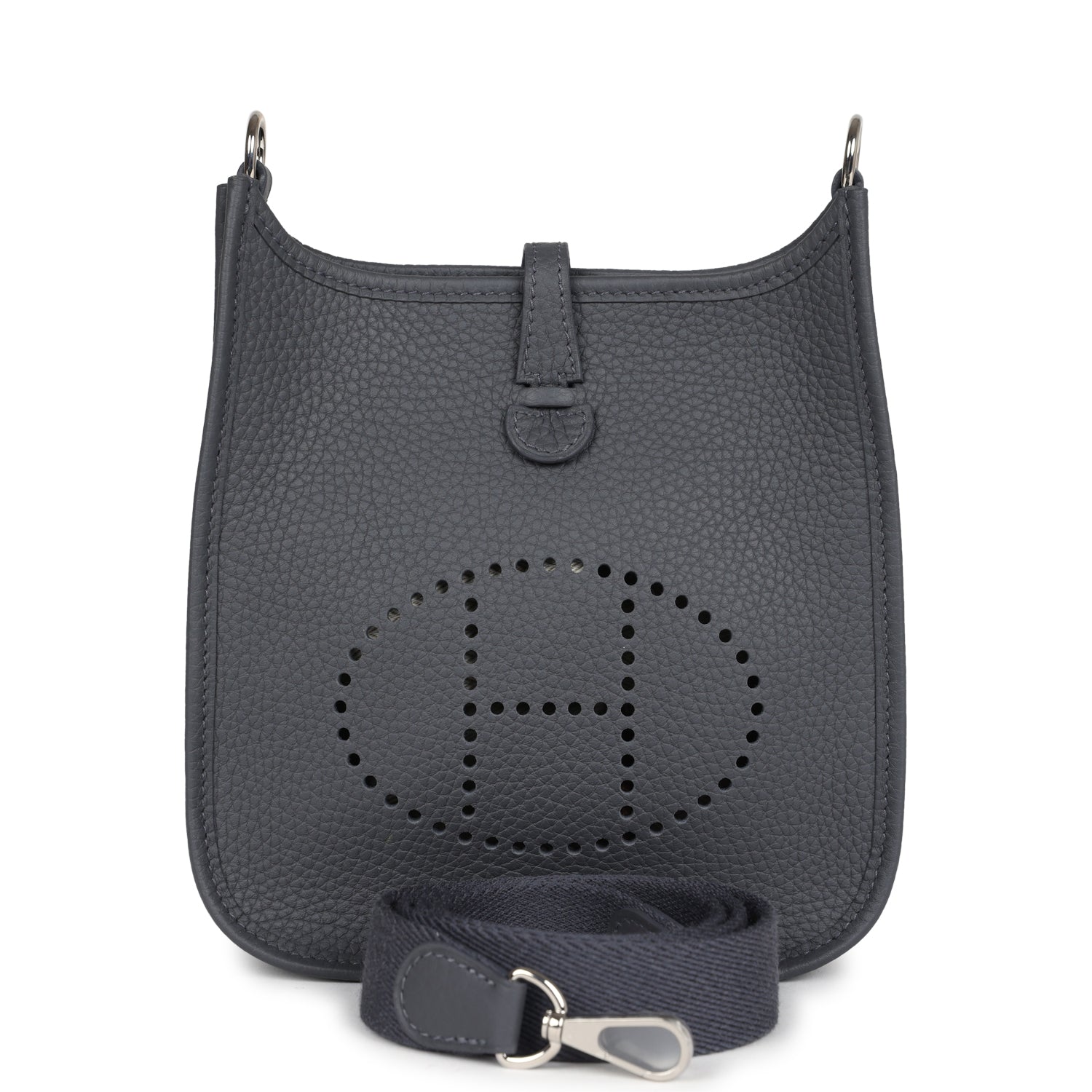 Evelyne TPM Ardoise clemence leather with palladium hardware, leather messenger bag with tonal stitching, large perforated H in circle (front), pull tab snap closure, and a removable wooly/canvas shoulder/crossbody strap.