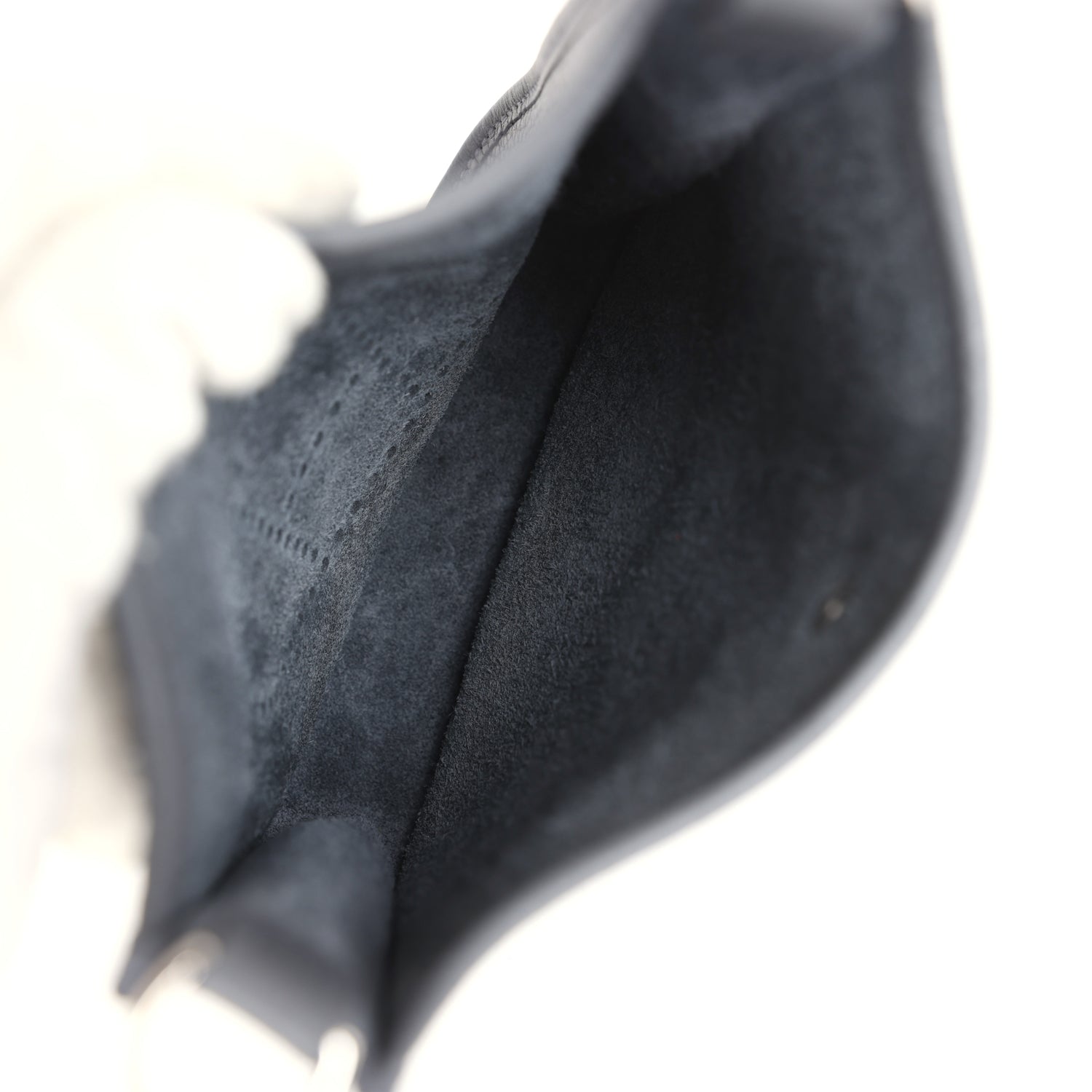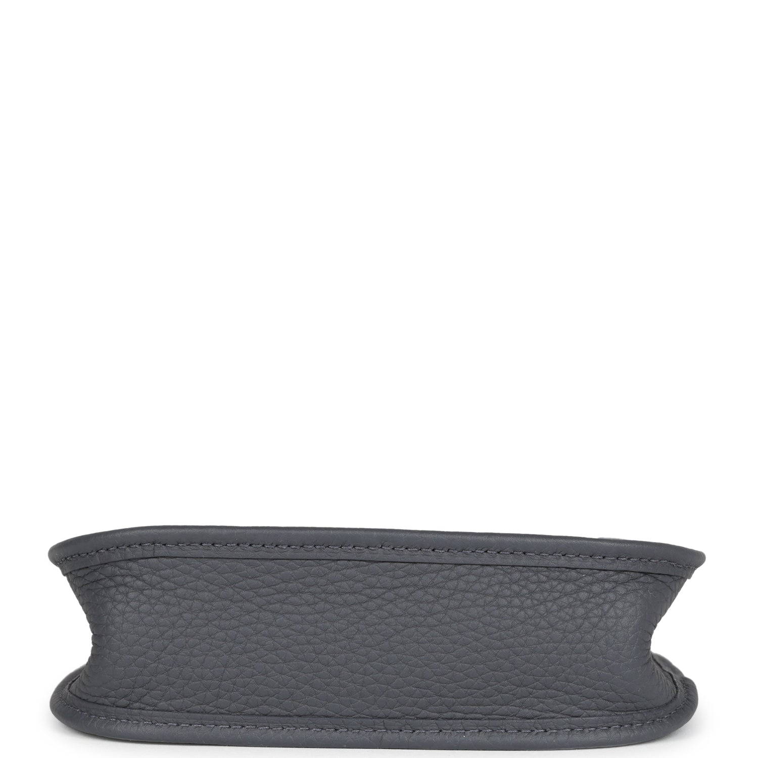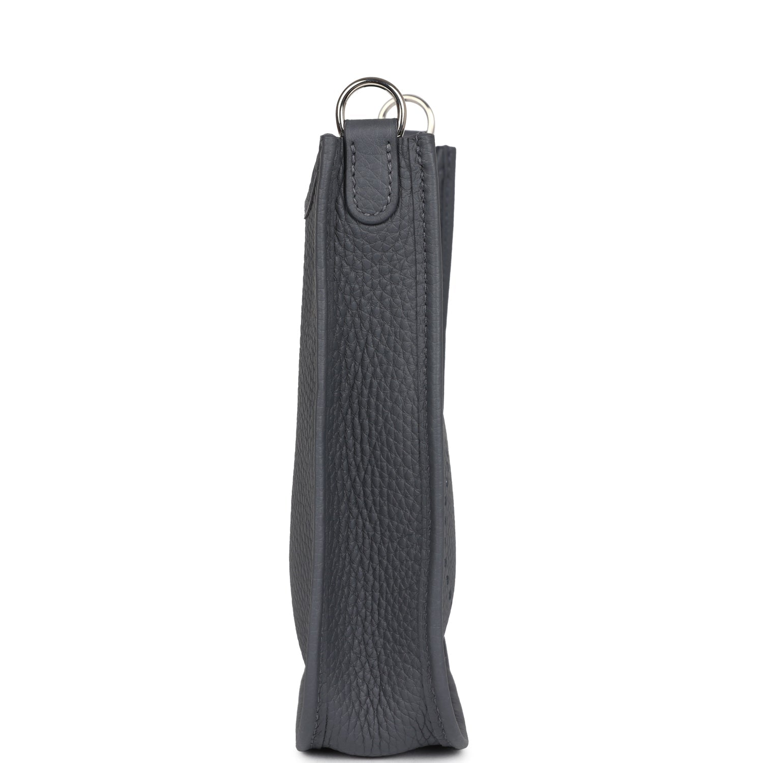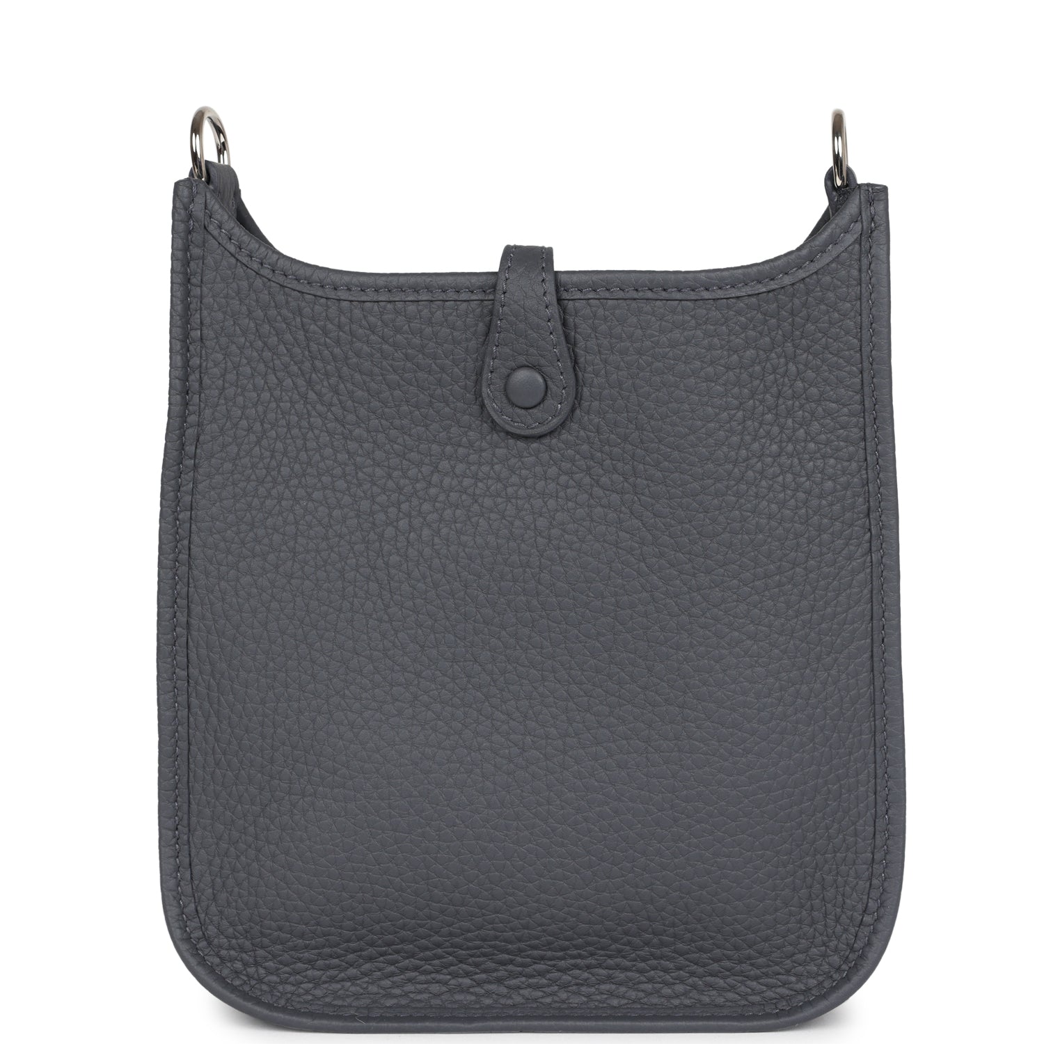 Evelyne TPM Ardoise clemence leather with palladium hardware, leather messenger bag with tonal stitching, large perforated H in circle (front), pull tab snap closure, and a removable wooly/canvas shoulder/crossbody strap.