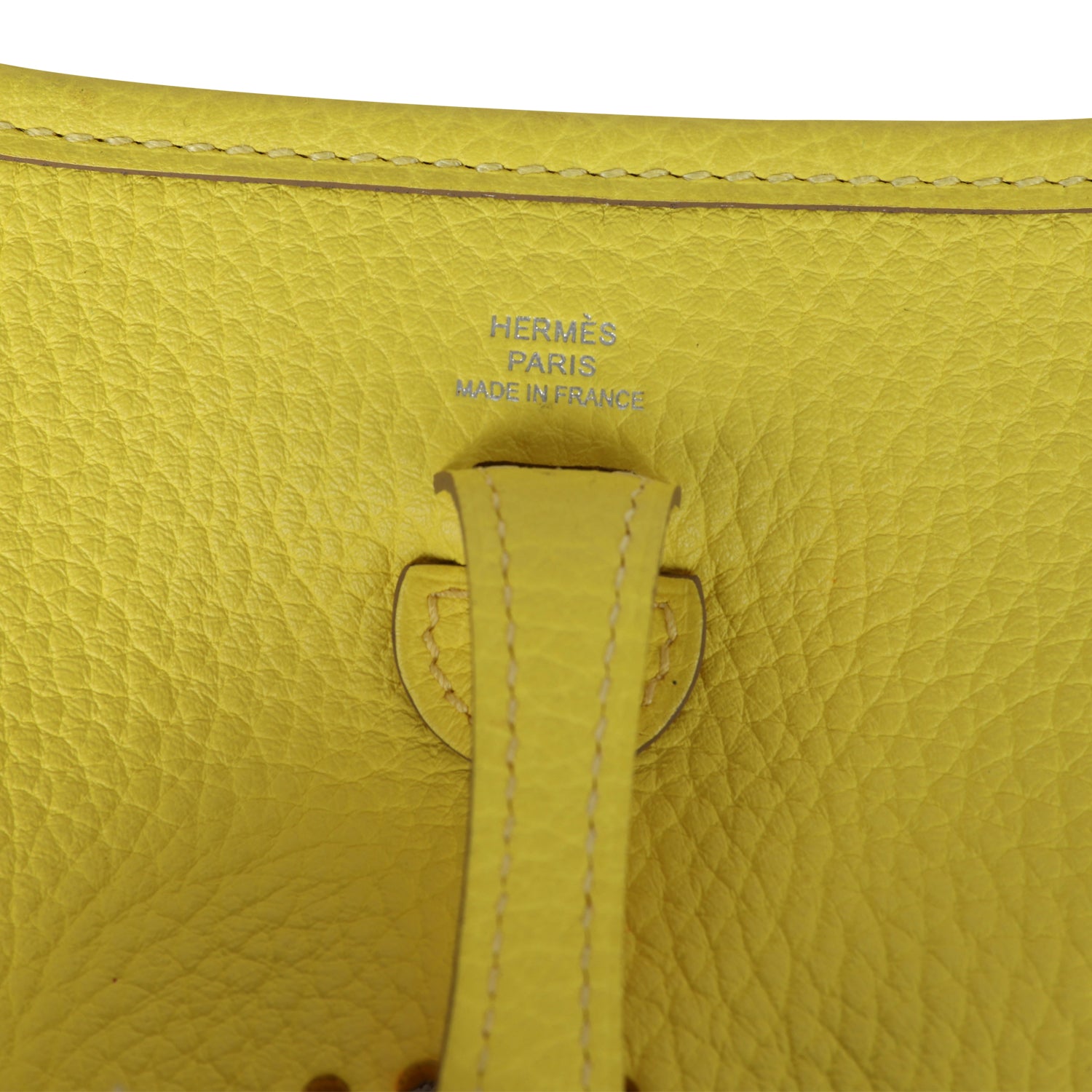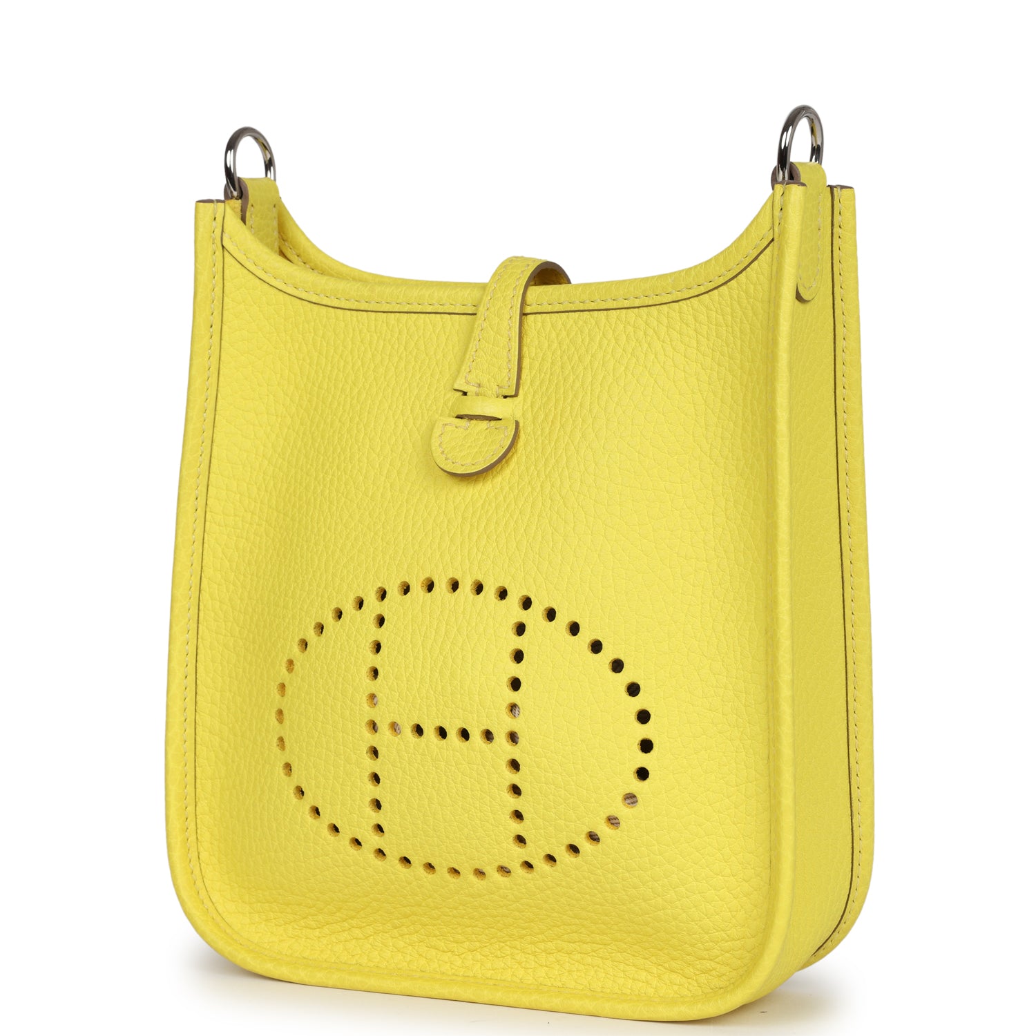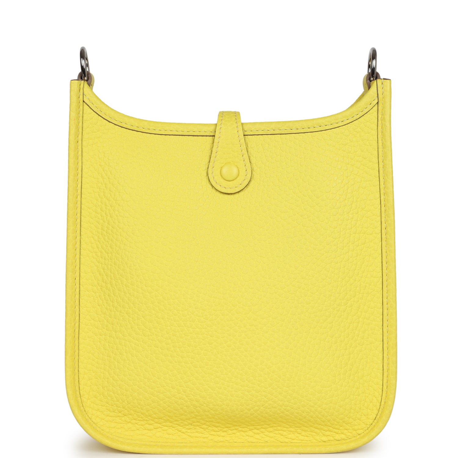 Evelyne TPM is in Lime clemence leather with palladium hardware and features tonal stitching stitching, pull tab top closure and a quadrille removable canvas and leather shoulder/crossbody strap.