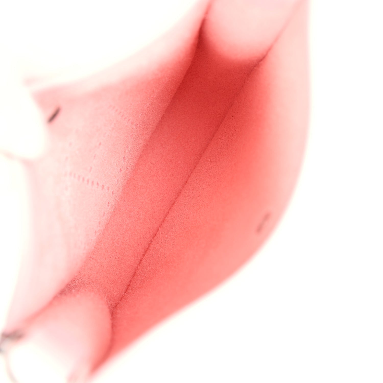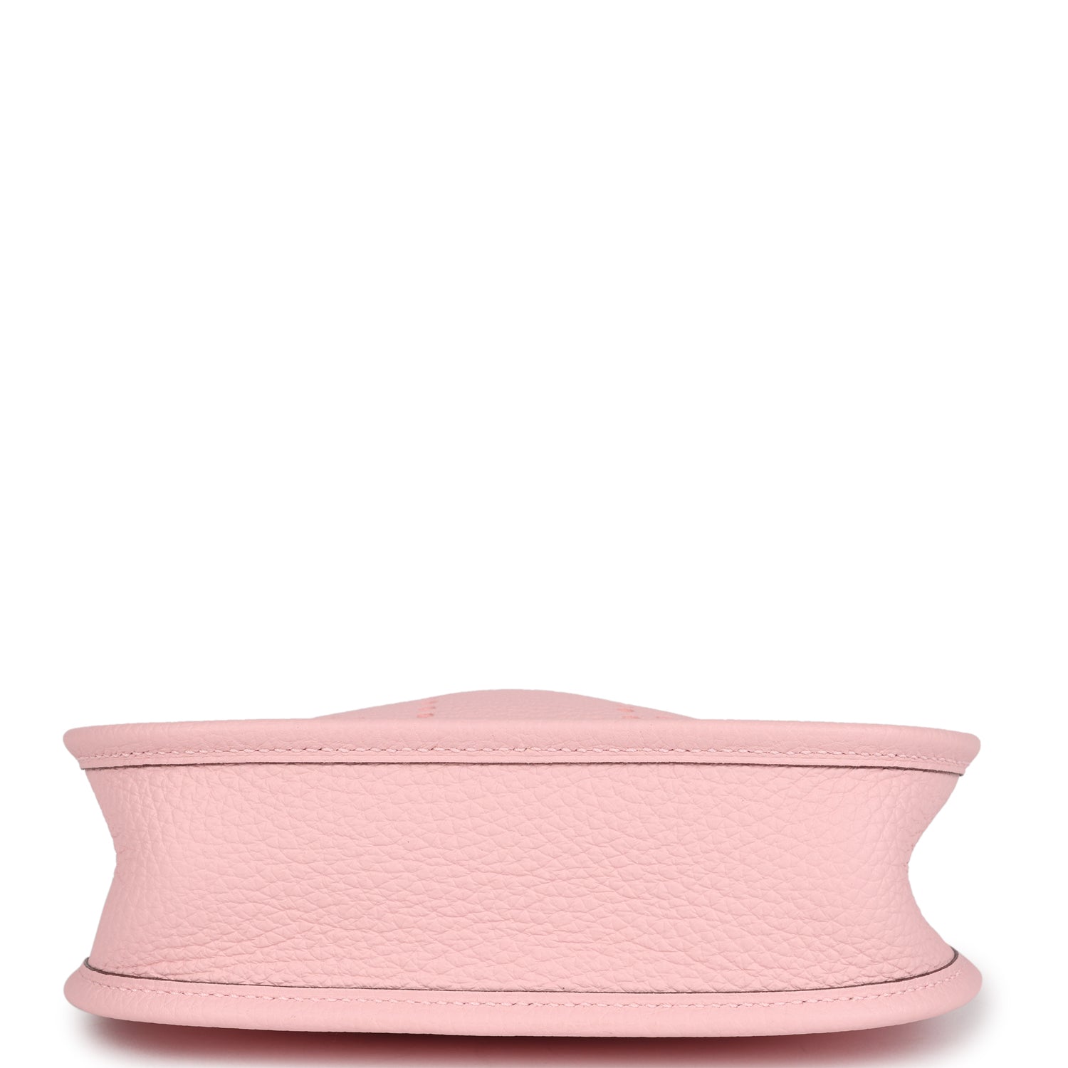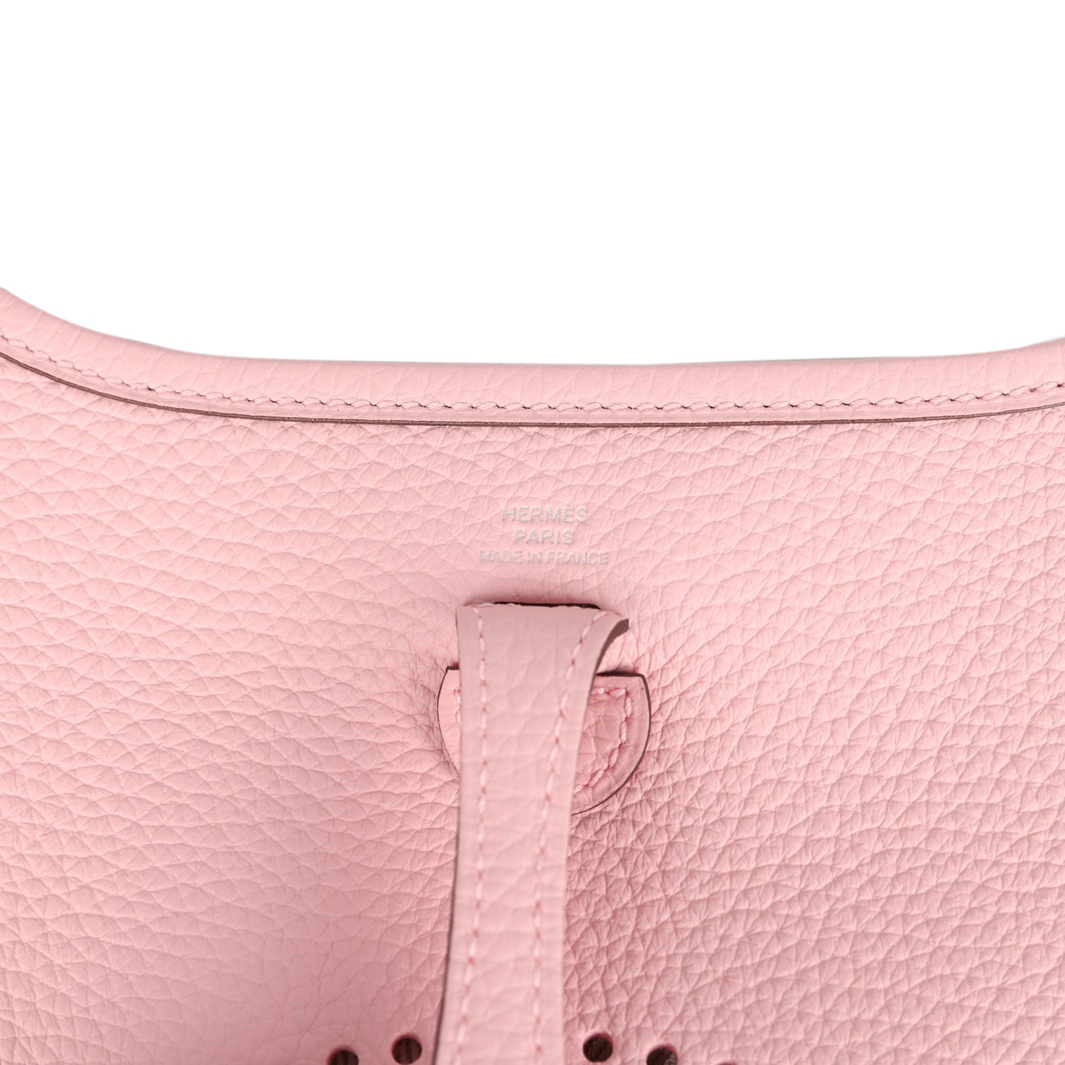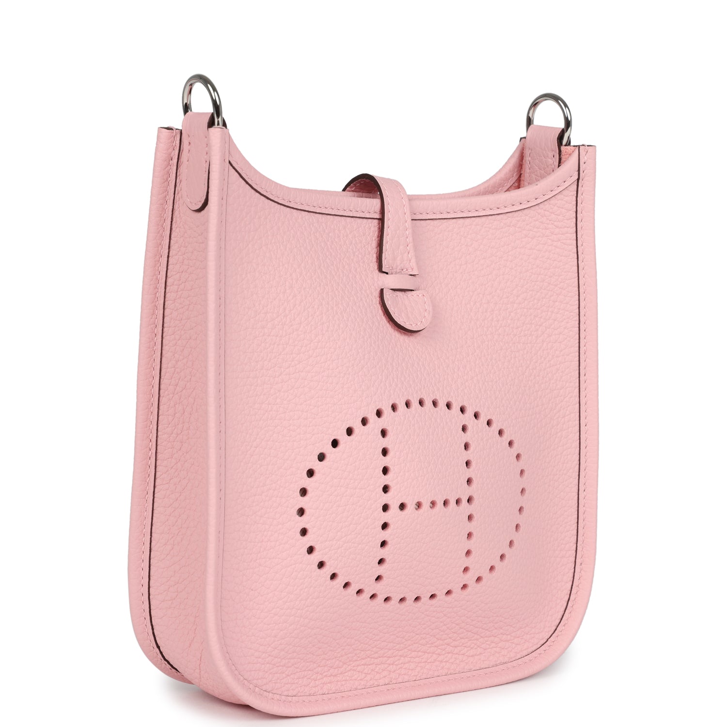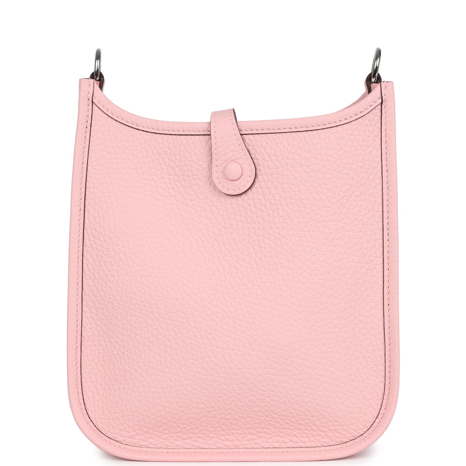 Evelyne TPM is in Rose Sakura clemence leather with palladium hardware and features tonal stitching stitching, pull tab top closure and a removable canvas and leather shoulder/crossbody strap.