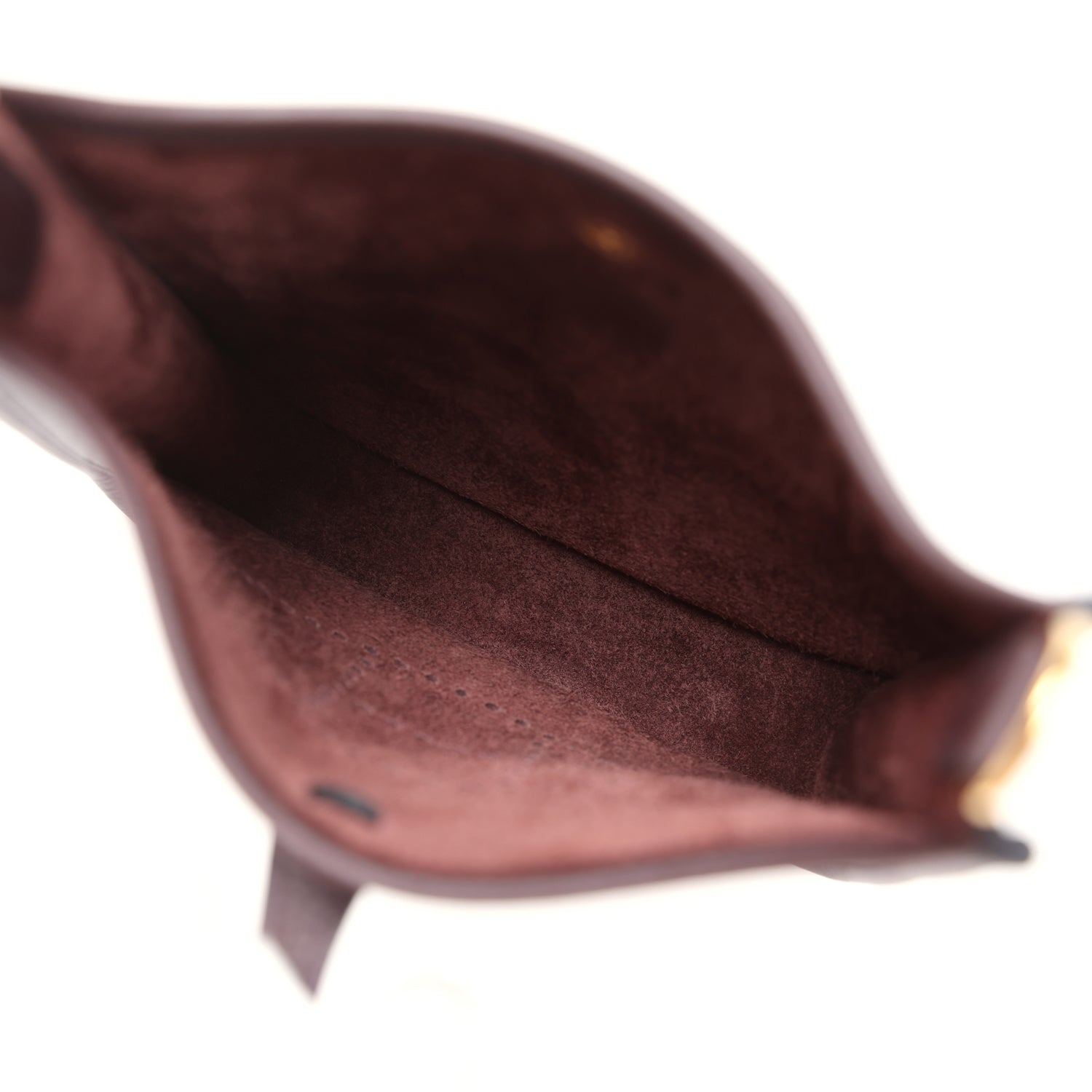 Evelyne TPM is in Rouge Sellier clemence leather with gold hardware, tonal stitching large perforated H in circle (front), pull tab snap closure and a removable Rouge Sellier wooly/canvas shoulder/crossbody strap.