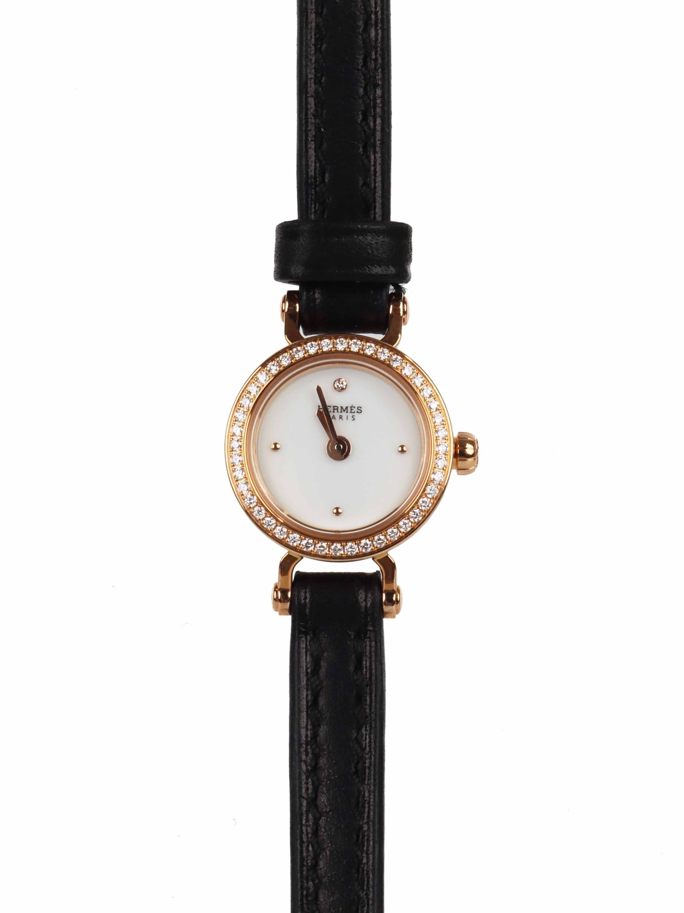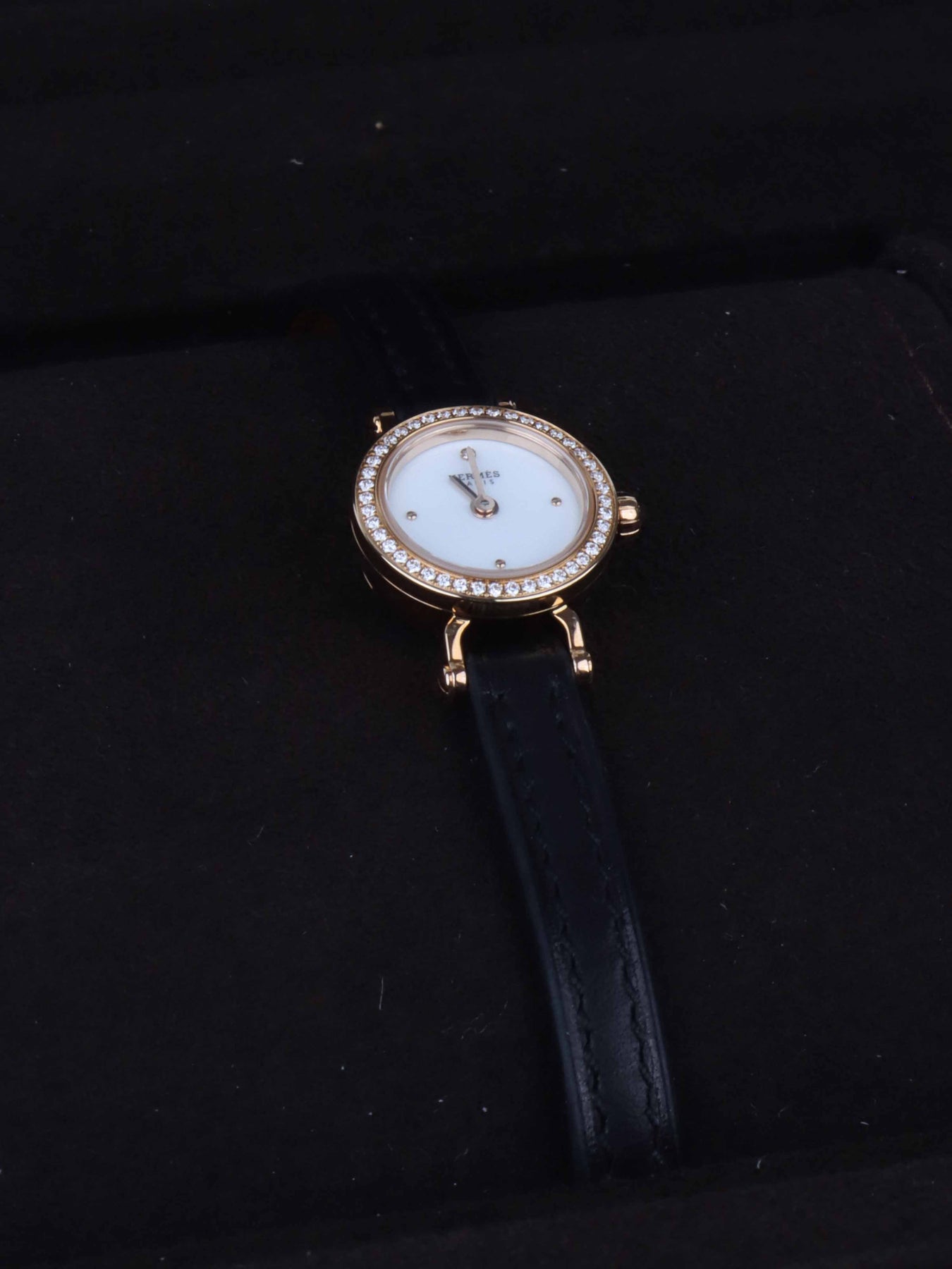 Description : Elegant and chic Hermes Faubourg watch; Diamond-set rose gold case, 15 mm diameter, 44 diamonds (0.1 ct). Condition: Brand new