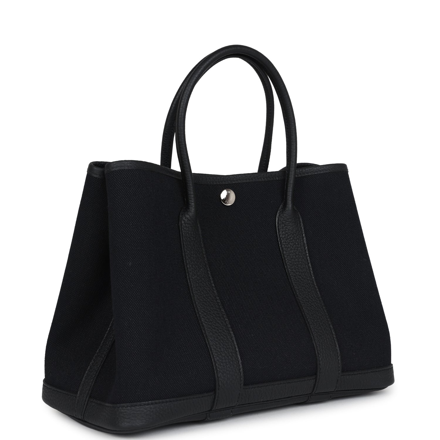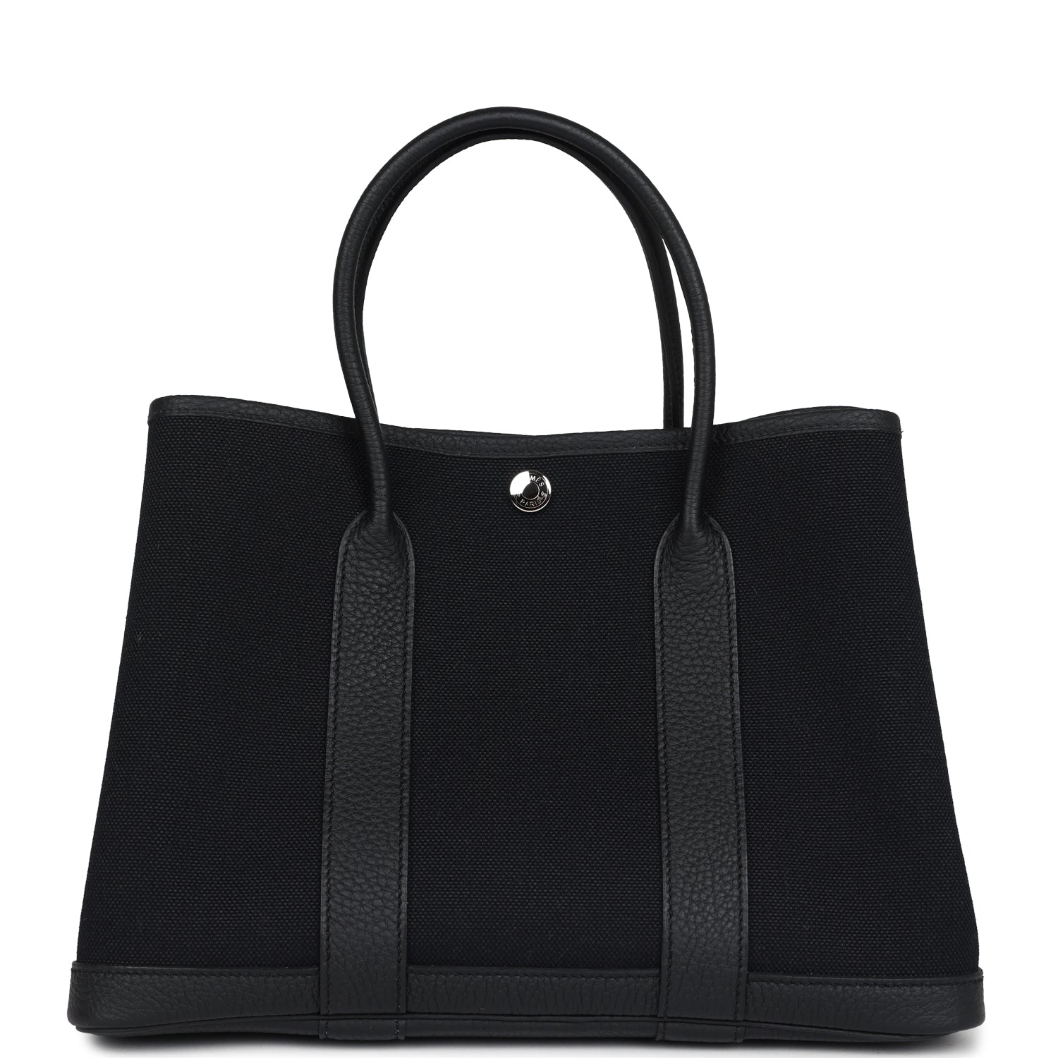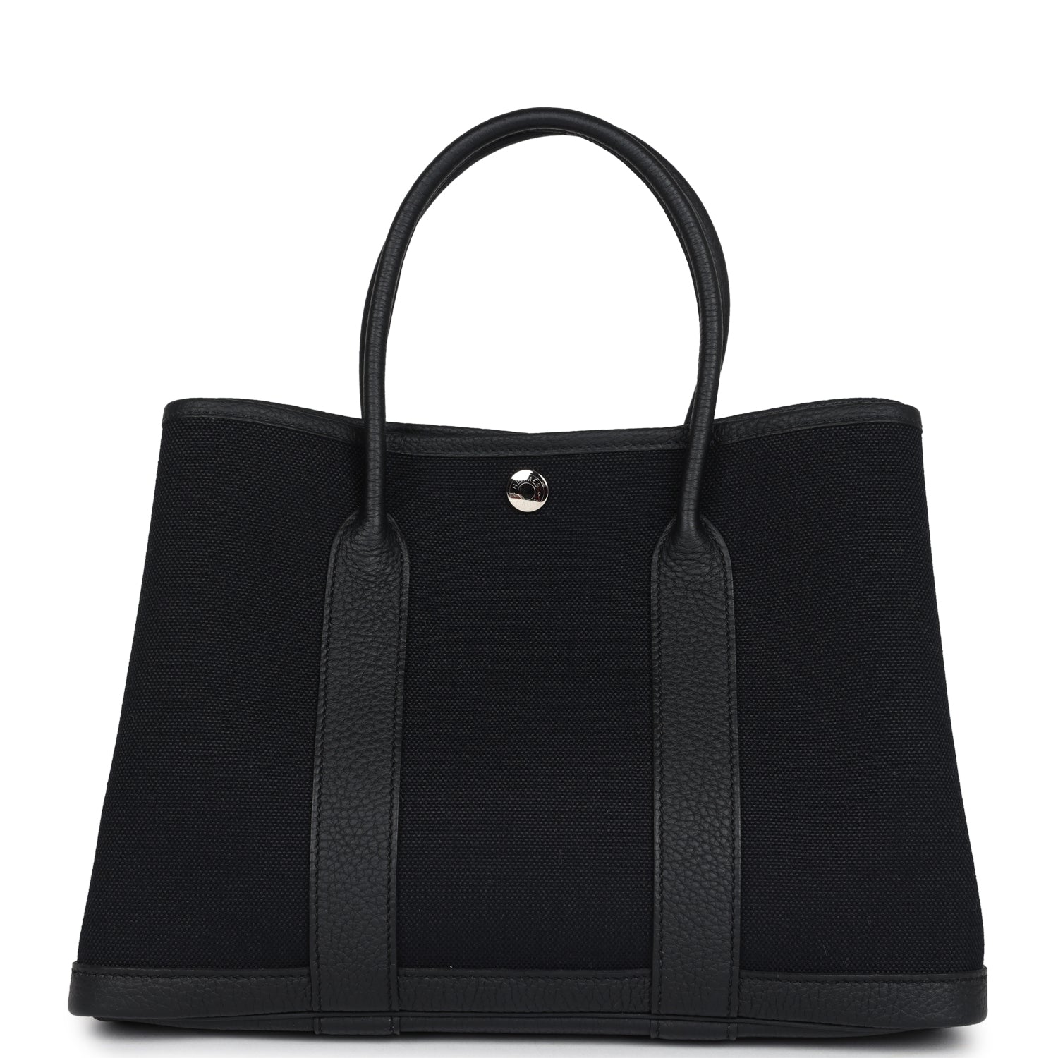 This Hermès Garden Party is in Black Toile H canvas and Negonda leather with palladium hardware, and features tonal stitching, one engraved palladium front snap closure with two snap closures on side to adjust bag width. This bag features two leather top handles.