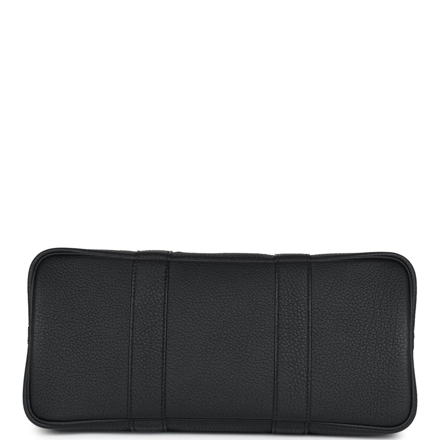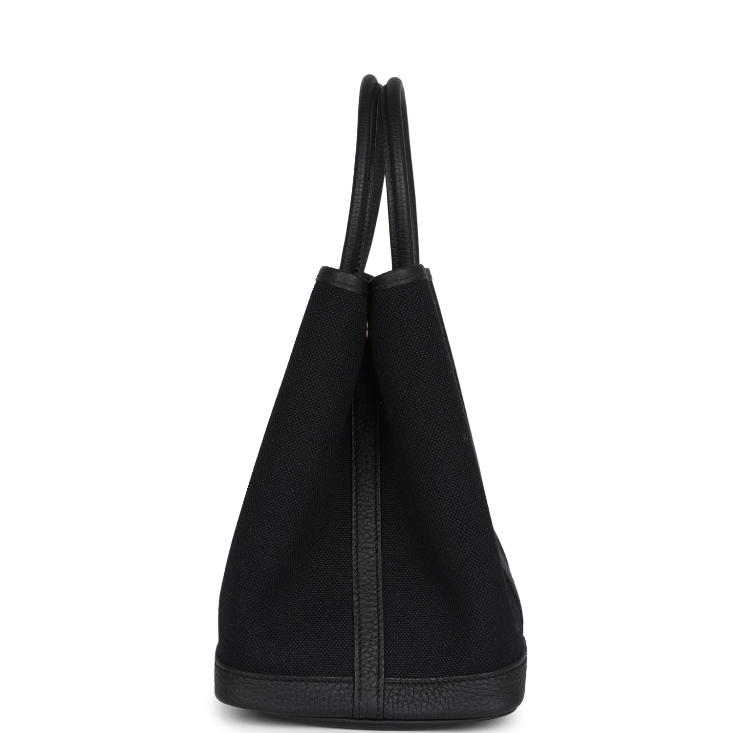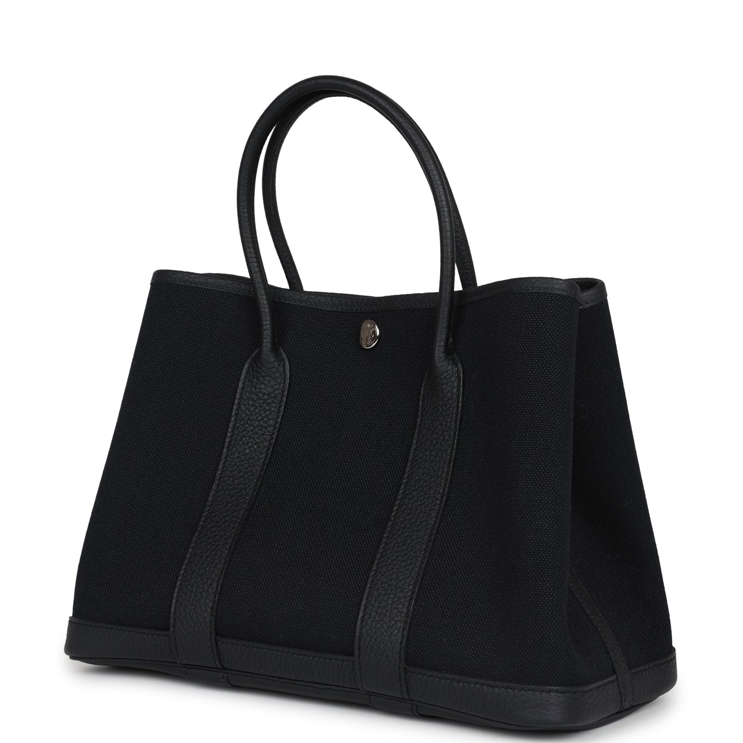 This Hermès Garden Party is in Black Toile H canvas and Negonda leather with palladium hardware, and features tonal stitching, one engraved palladium front snap closure with two snap closures on side to adjust bag width. This bag features two leather top handles.