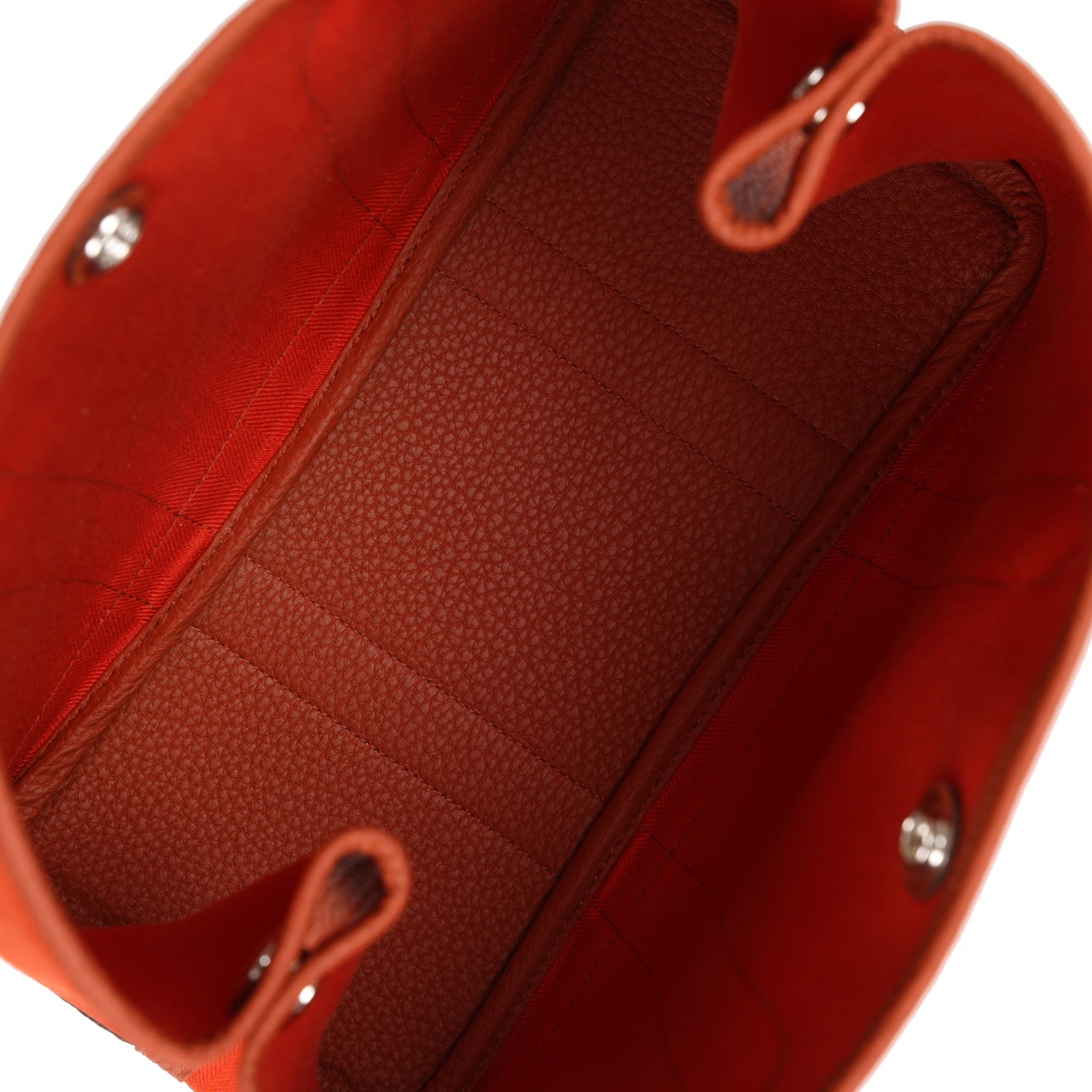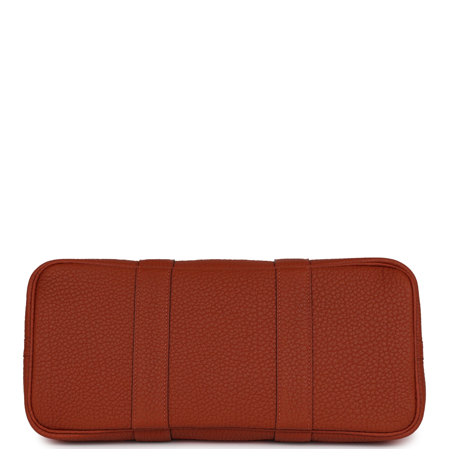 This Garden Party 30 is in Terre Battue and Cuivre with classic toile herringbone lining, engraved clou de selle front snap closure, two snap closures to adjust the bags width, two top handles.