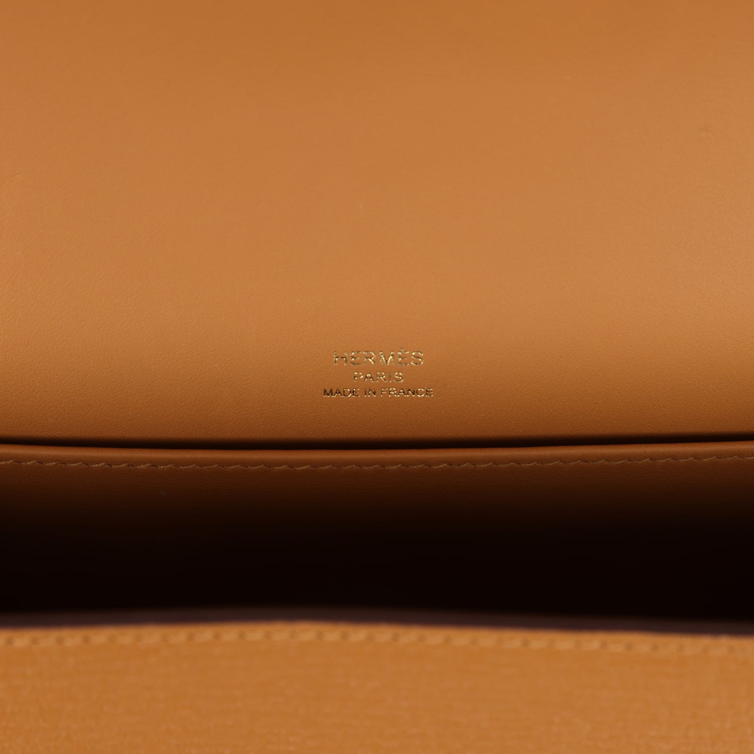 The interior is lined with Caramel leather with one slip pocket on the back wall and two slip pockets on the front wall.