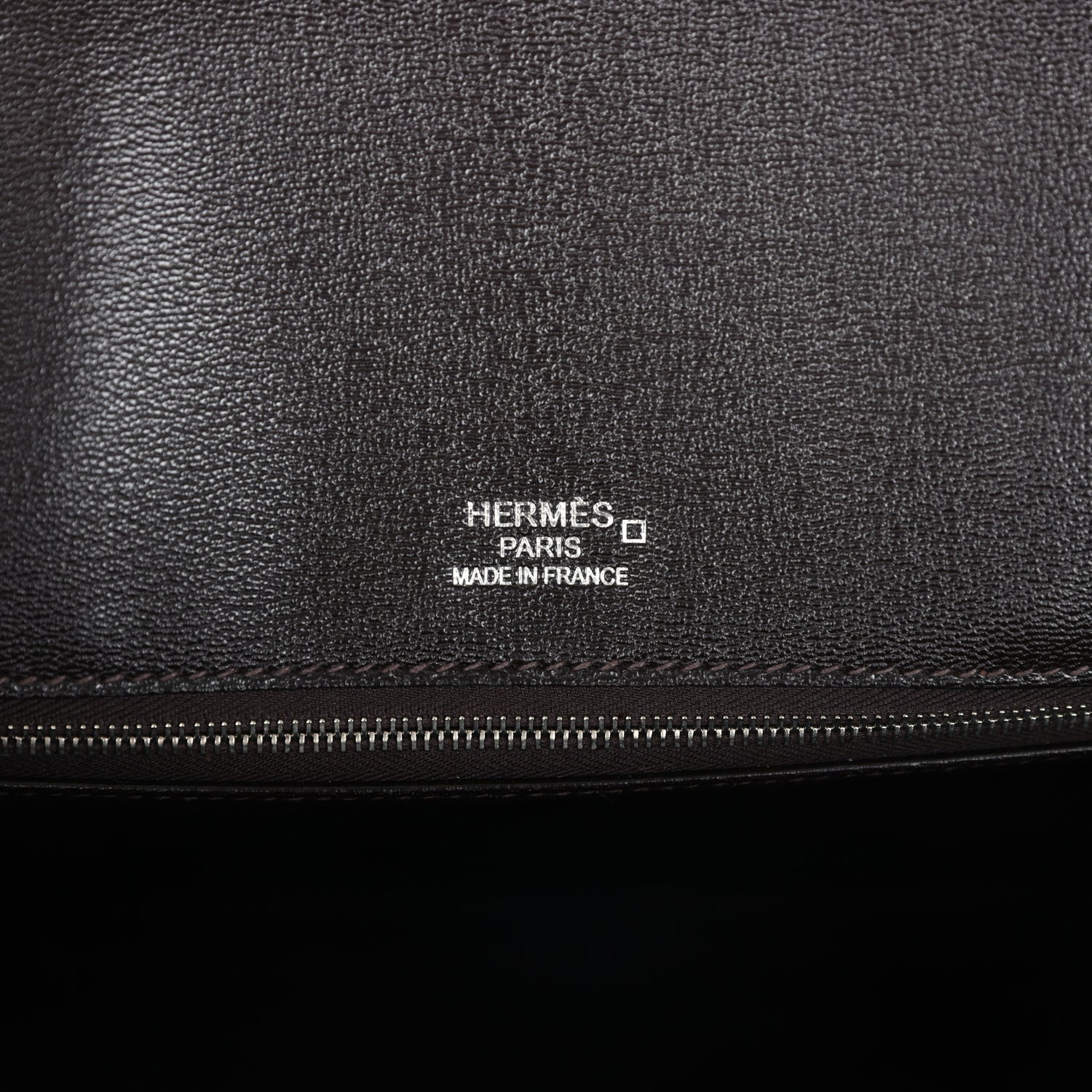The interior is lined with Ebene chevre leather and has one zip pocket with Hermes engraved pull; pocket on opposite side.