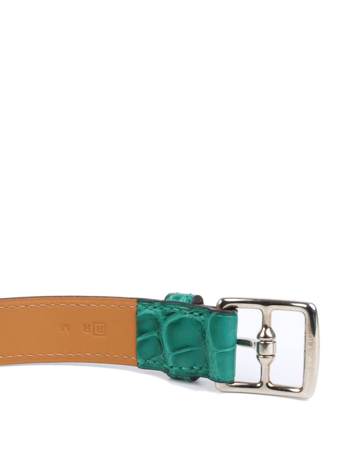 Description : This stylish alligator leather belt-style bracelet comes in a stunning "malachite" green, finished with palladium hardware. In as-new condition.