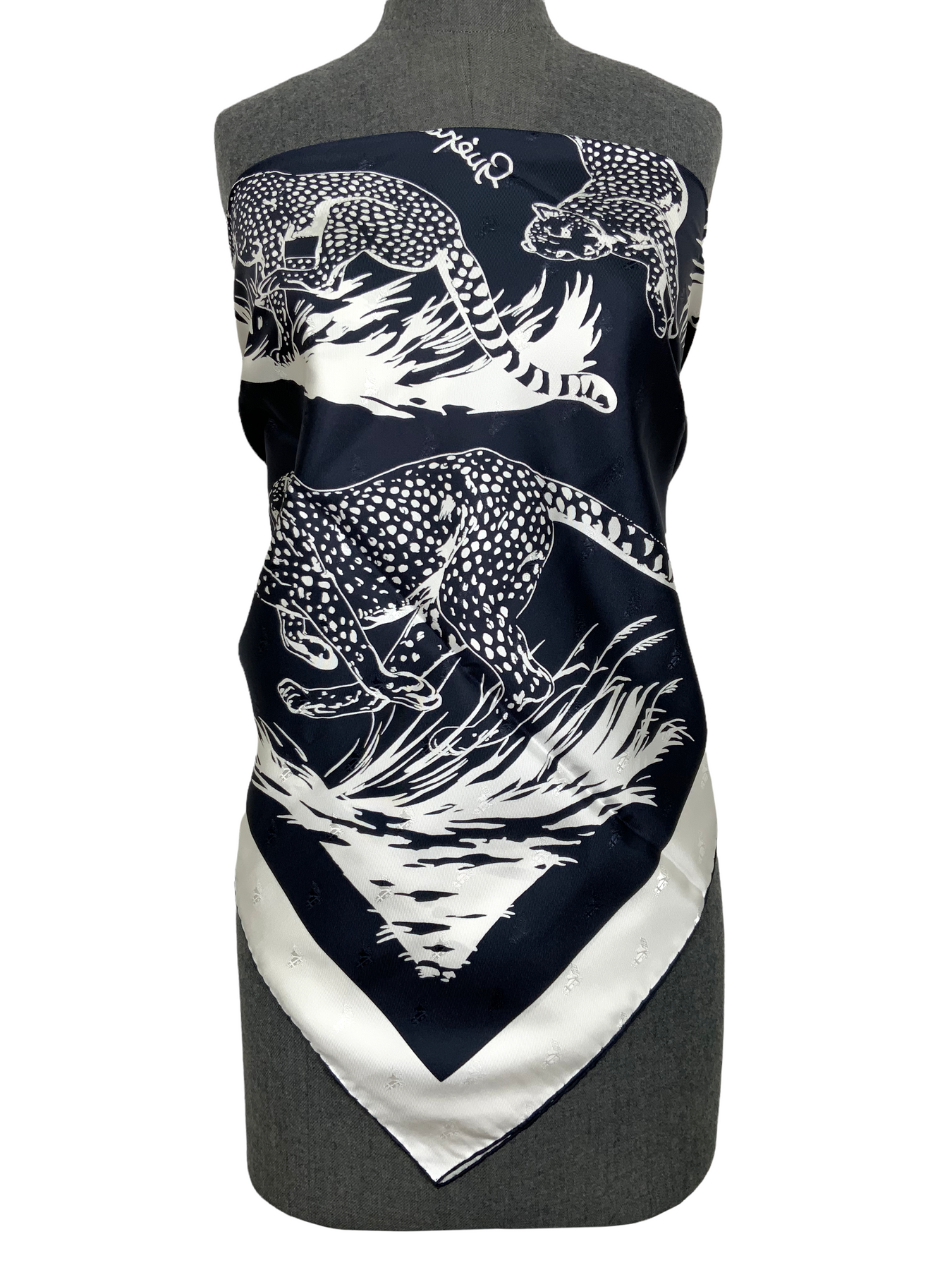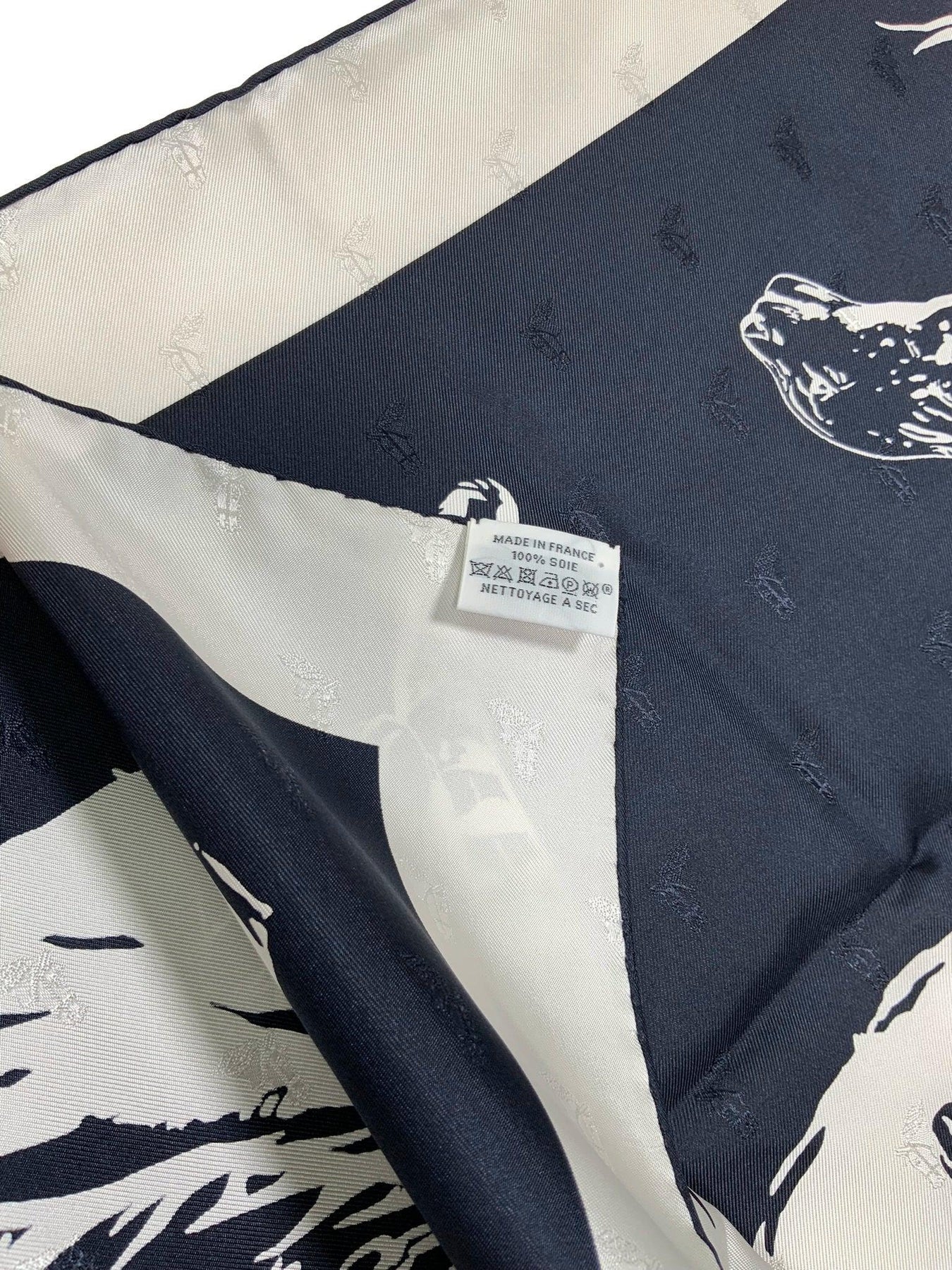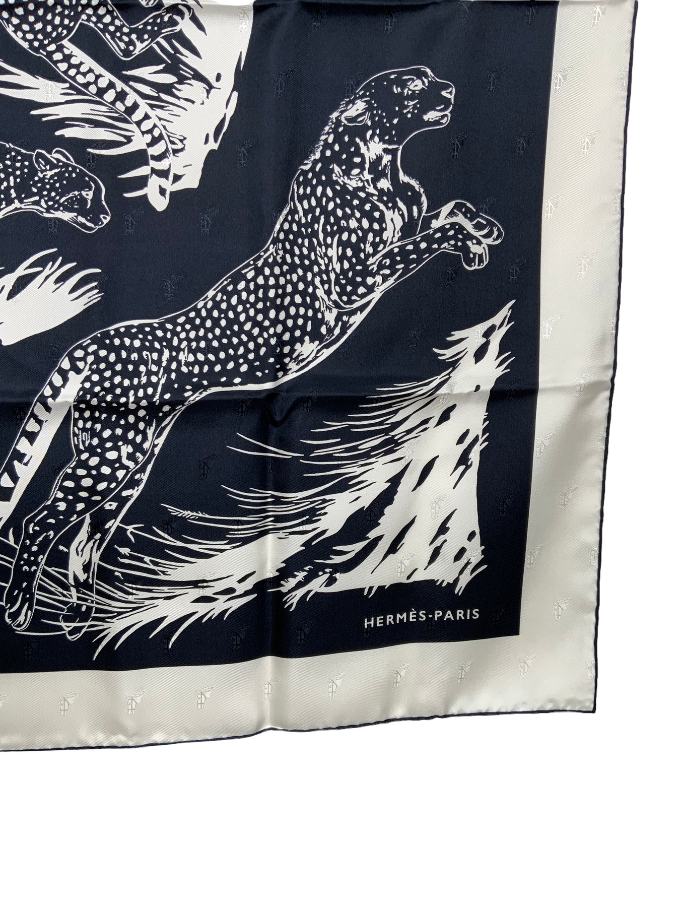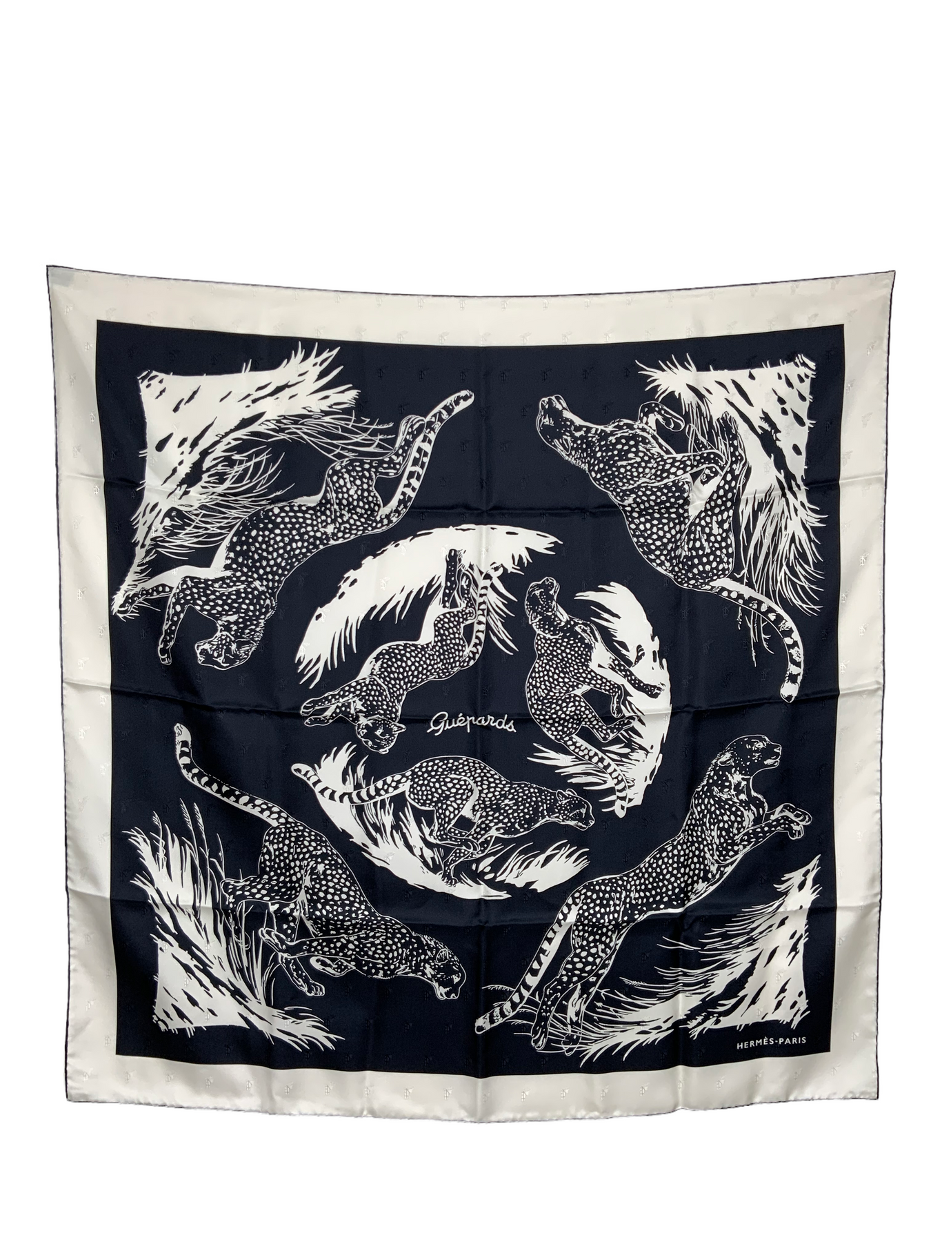 We the ity of this Hermes Guepards Silk Jacquard Scarf 90  designed by Robert Dallet which was first issued back in 2007 and depicts images of cheetahs in action. It features beautiful hues of black and white with black hand-rolled edges. This gorgeous scarf has become extremely popular for collectors as they have stopped producing jacquard scarves.