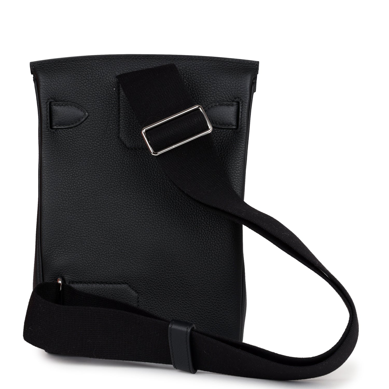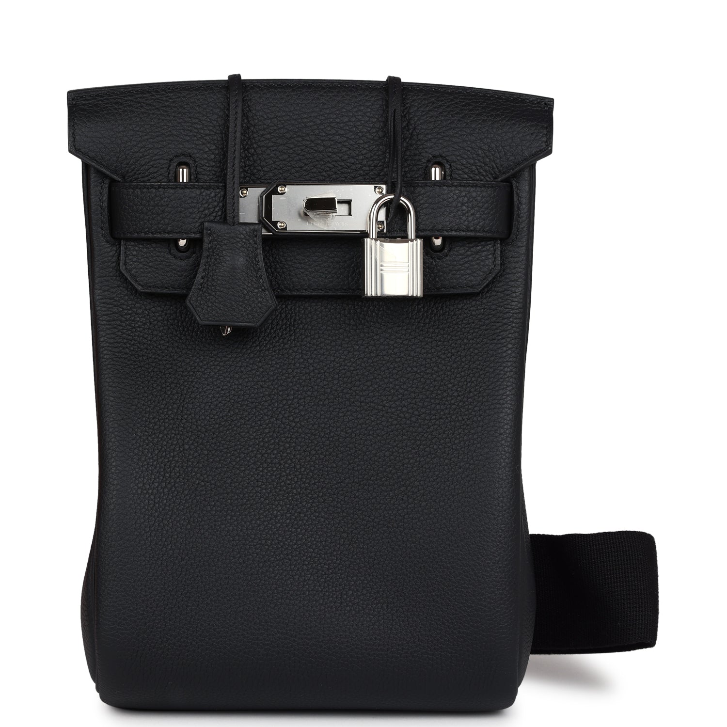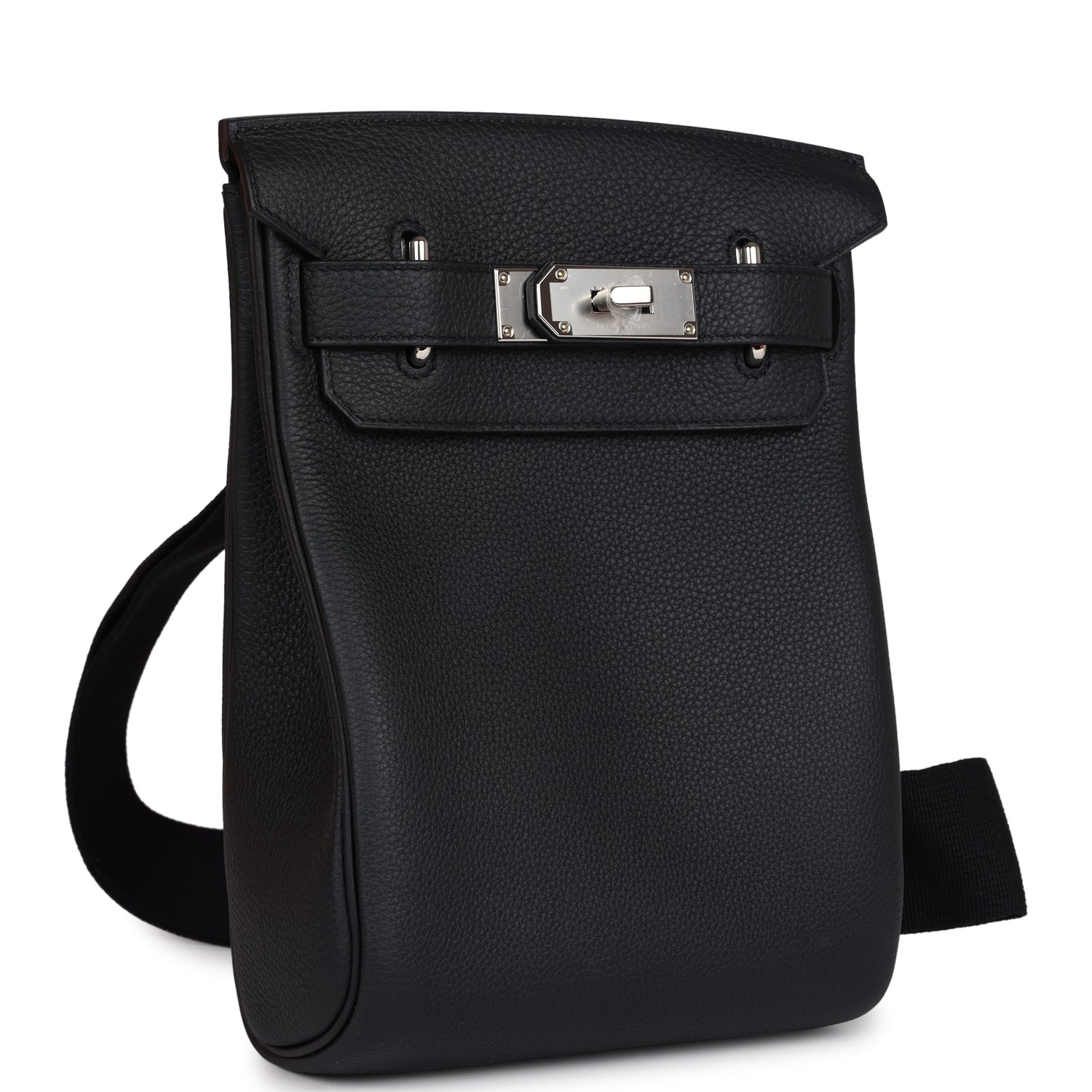HAC A Dos PM Backpack is in Black togo leather with palladium hardware and has tonal stitching, two straps with front toggle closure, and an adjustable shoulder strap.