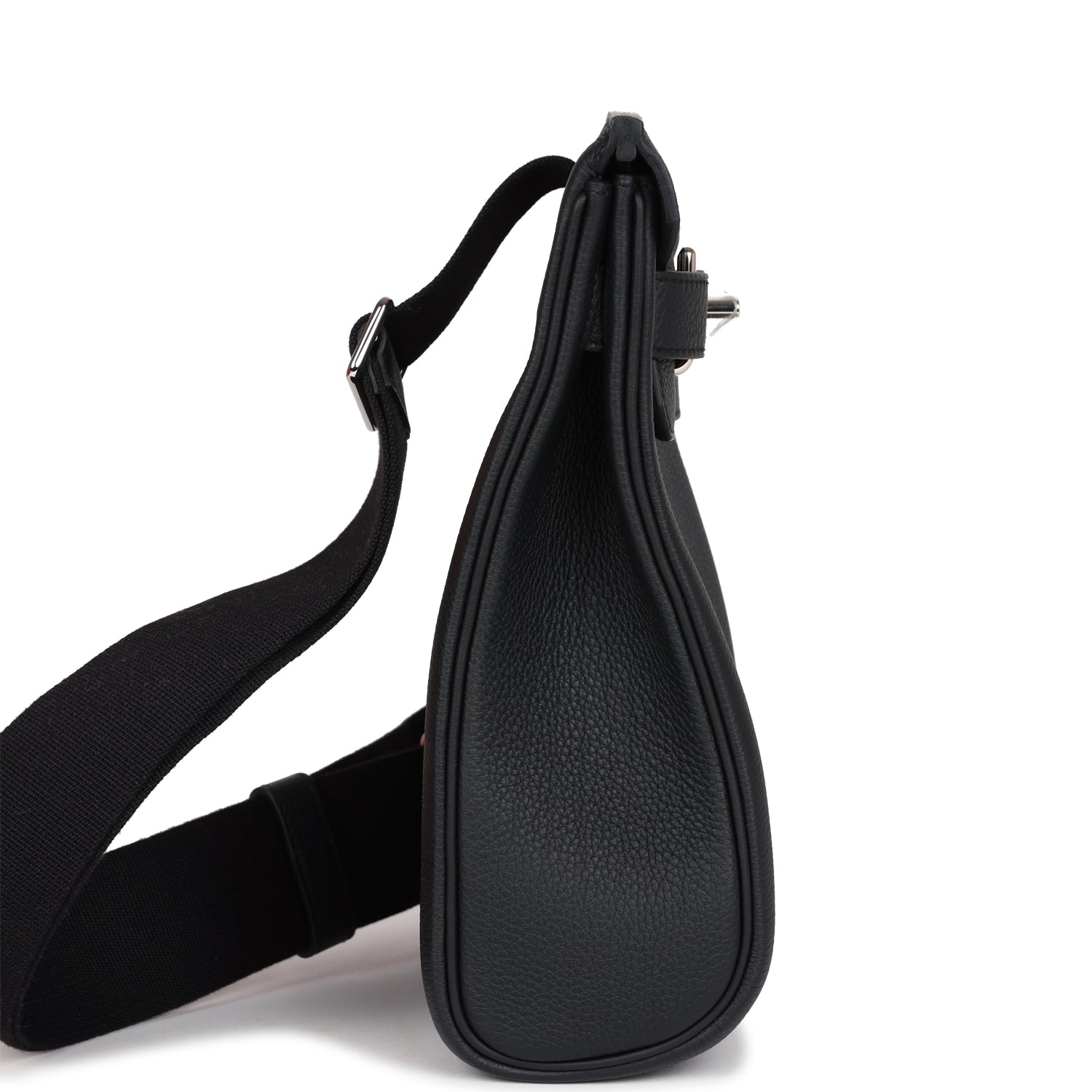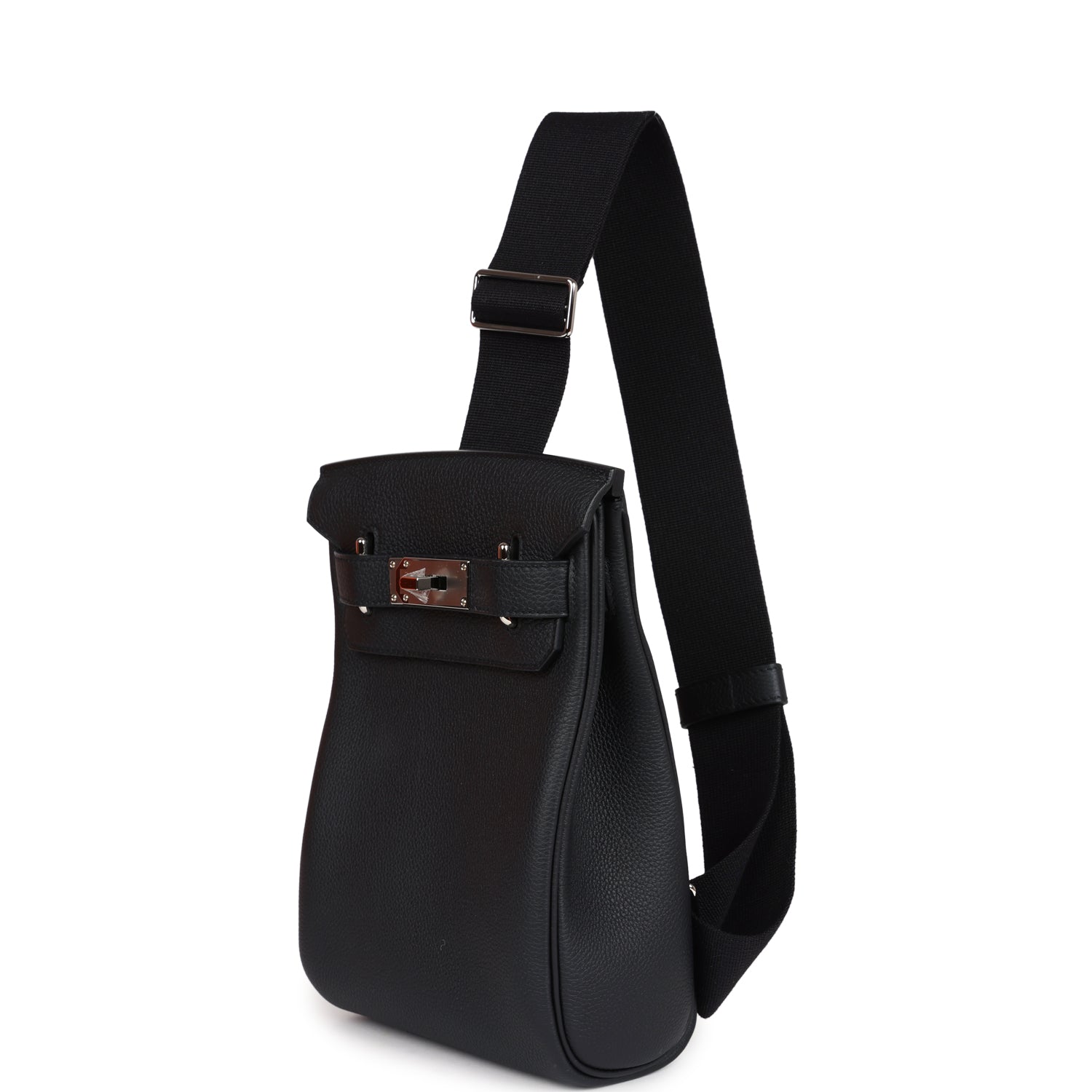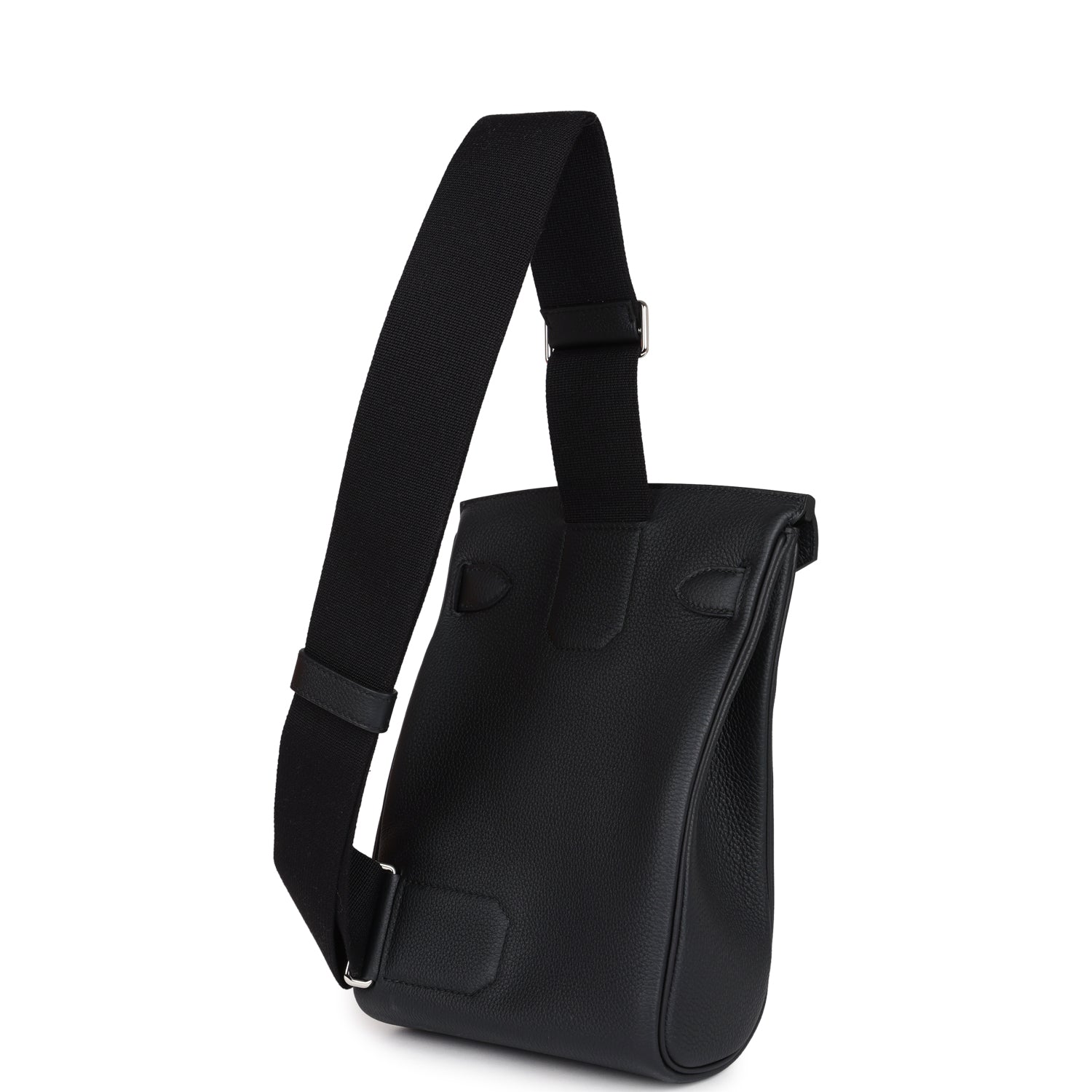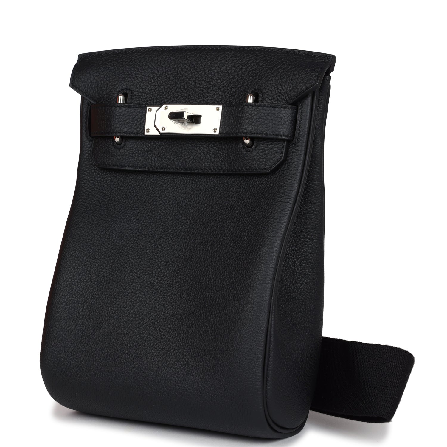 HAC A Dos PM Backpack is in Black togo leather with palladium hardware and has tonal stitching, two straps with front toggle closure, and an adjustable shoulder strap.