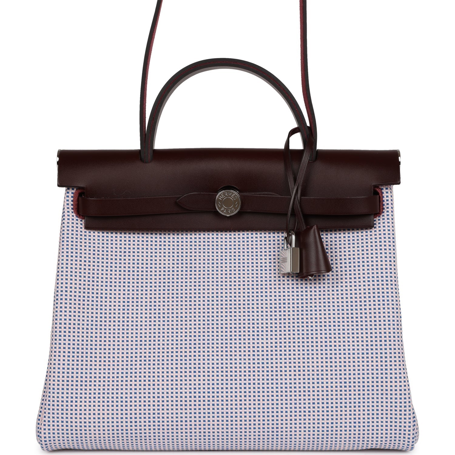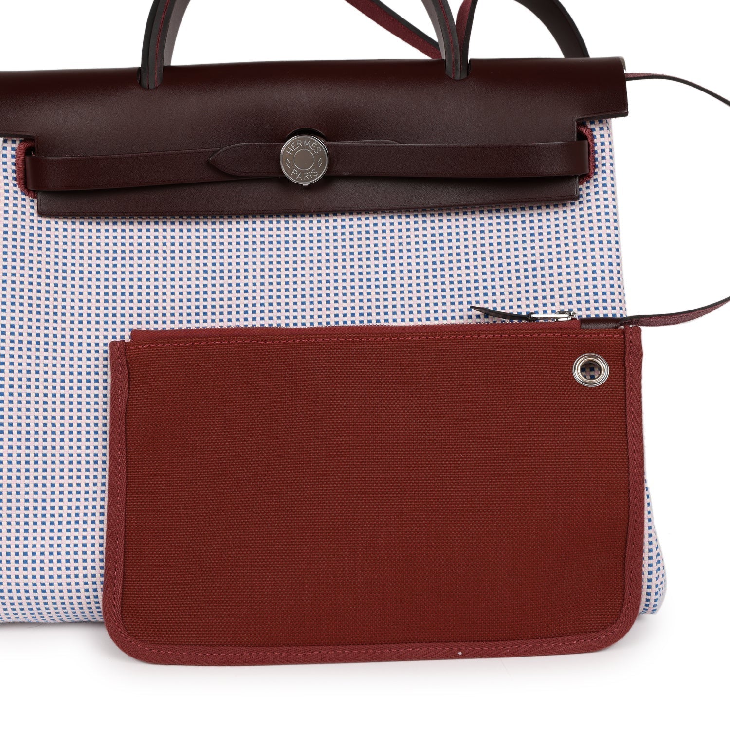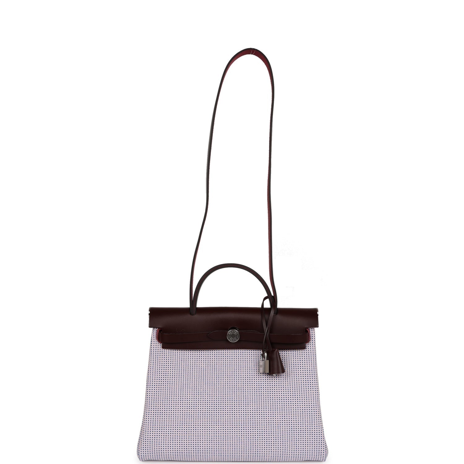 This Herbag 31 is of Rouge Sellier Vache Hunter and Mauve, Bleu Bill, Rouge Sellier, Ecru Criss Viking Toile with palladium hardware, has tonal stitching, clou de selle closure, top handle and shoulder strap in hunter leather, clochette, interior zip pouch and zip pocket on back of bag.