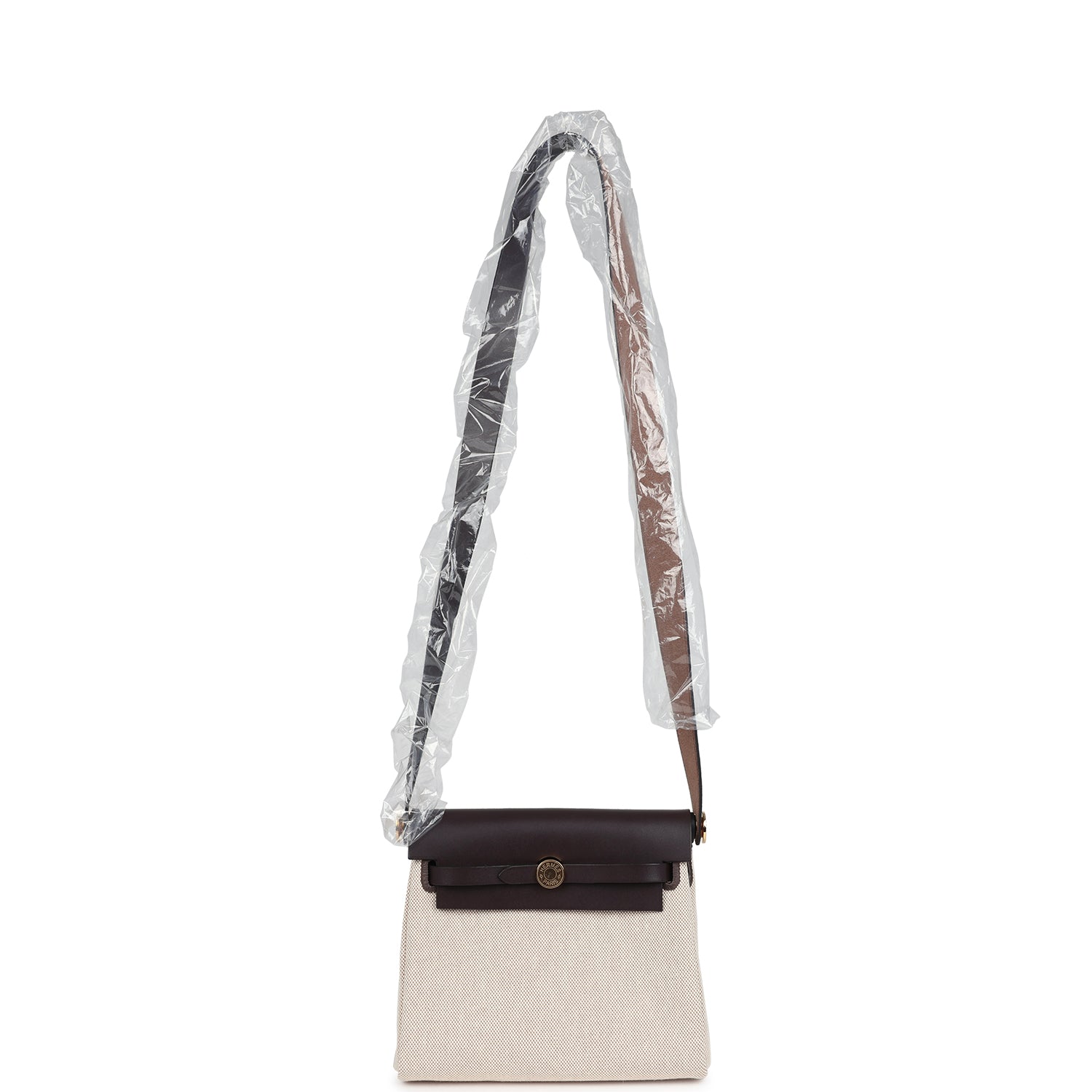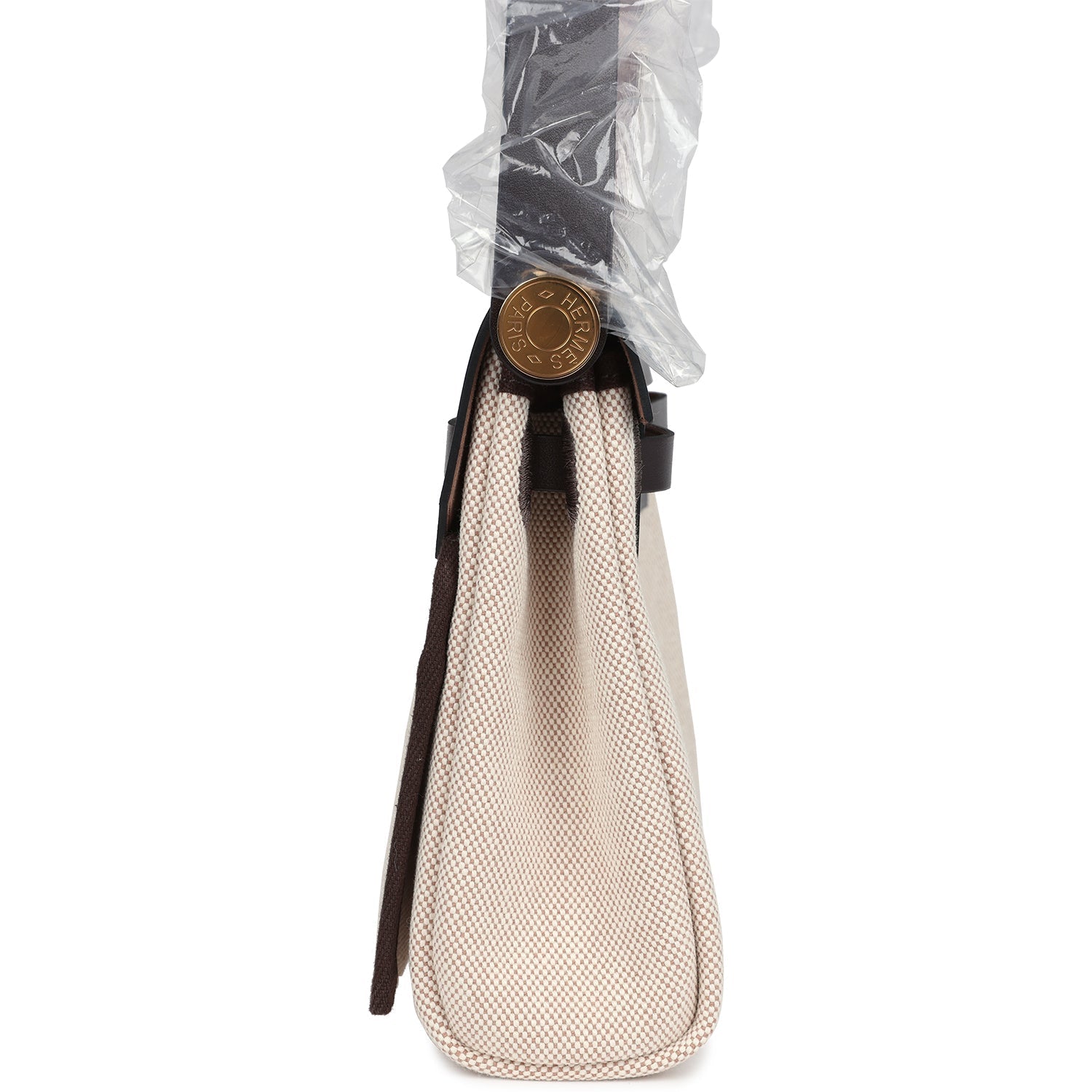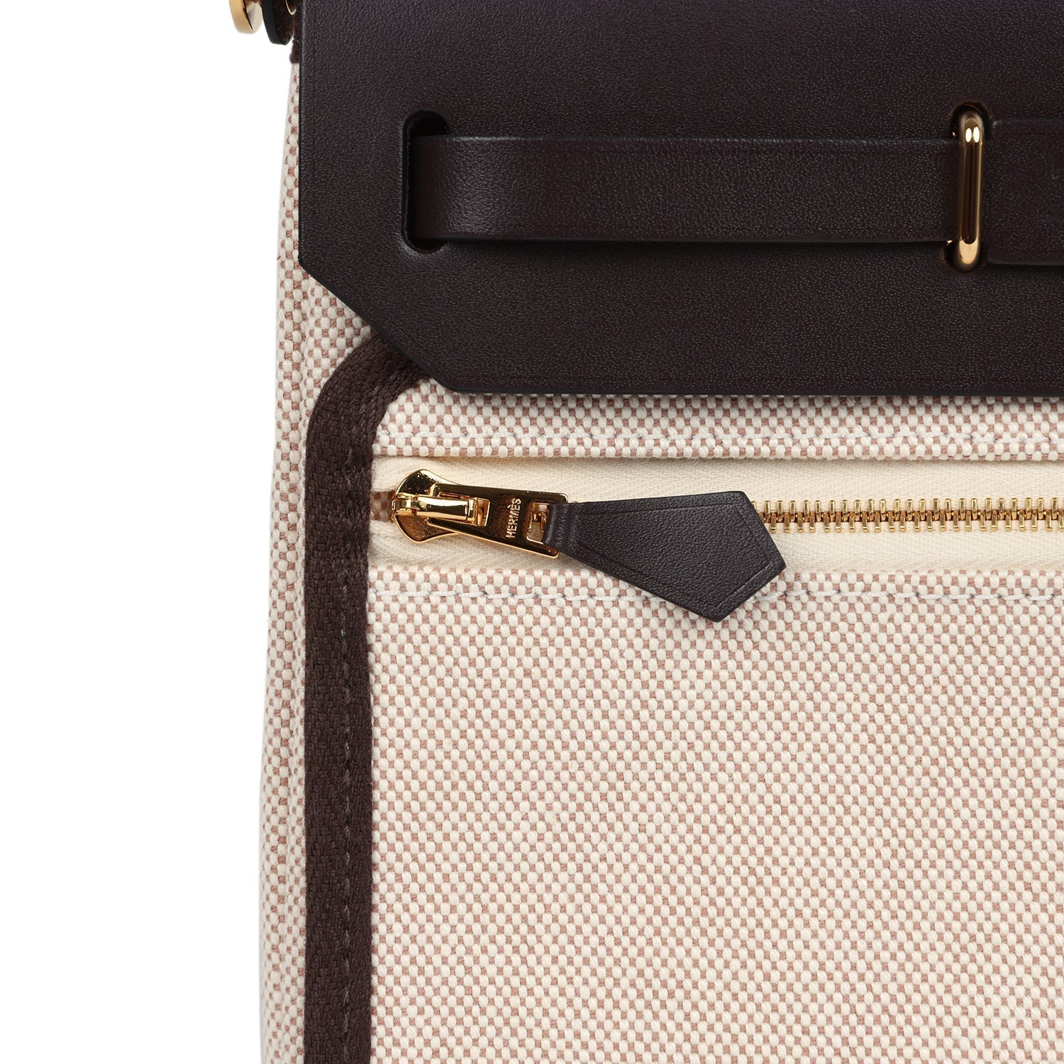 This Hermes Herbag Zip 20 Mini Ecru and Beige Toile H canvas and Ebene Vache Hunter with gold hardware has tonal stitching, front flap, two straps with center clou de selle closure, back zip pocket and Ebene shoulder strap.