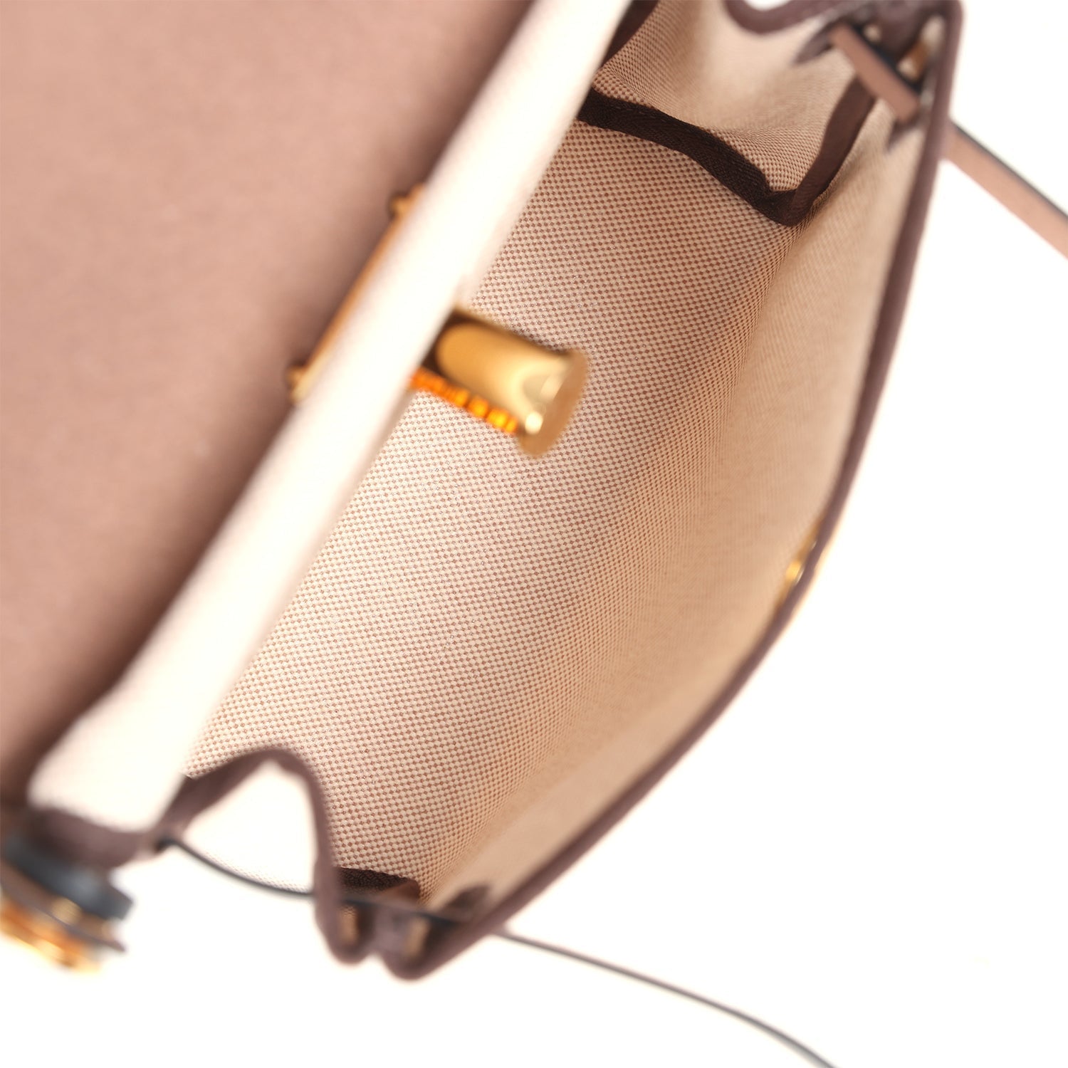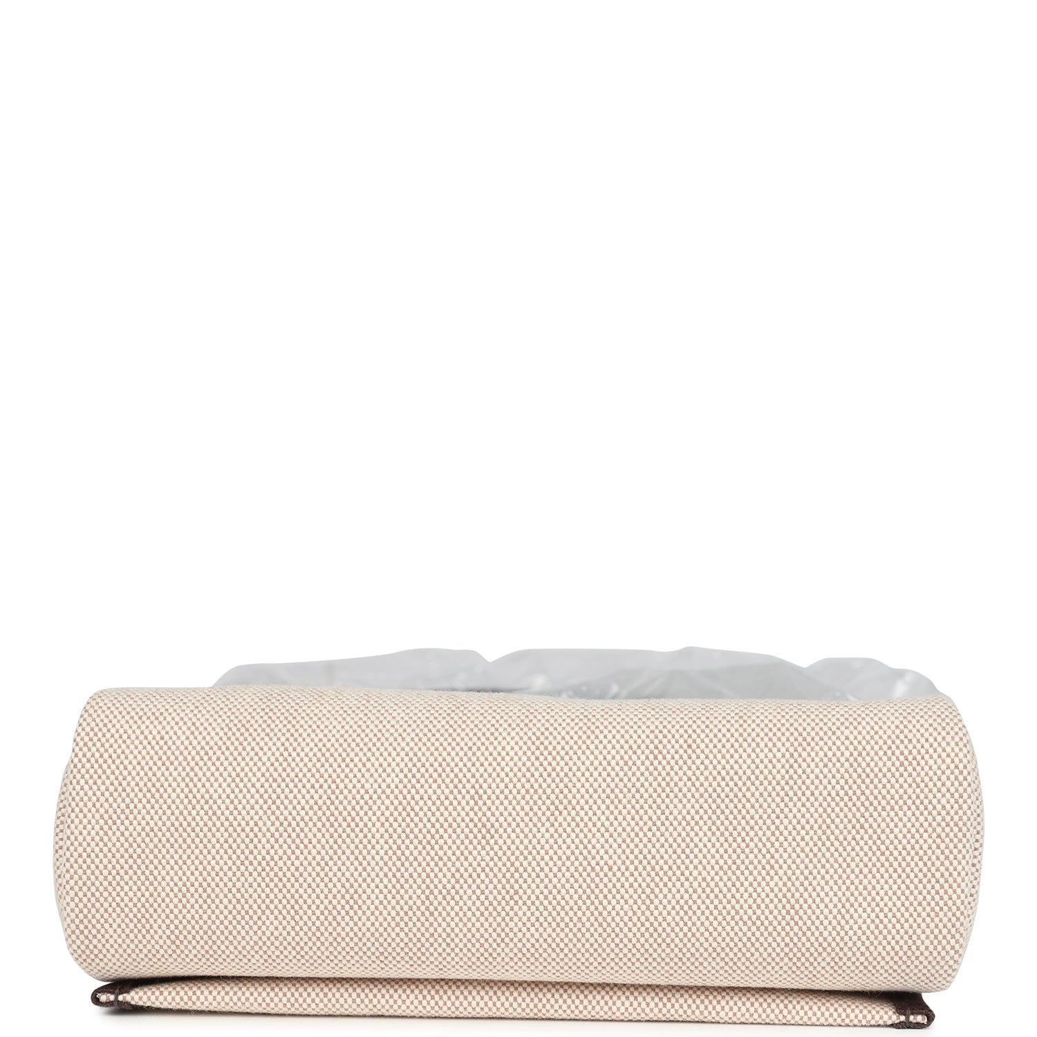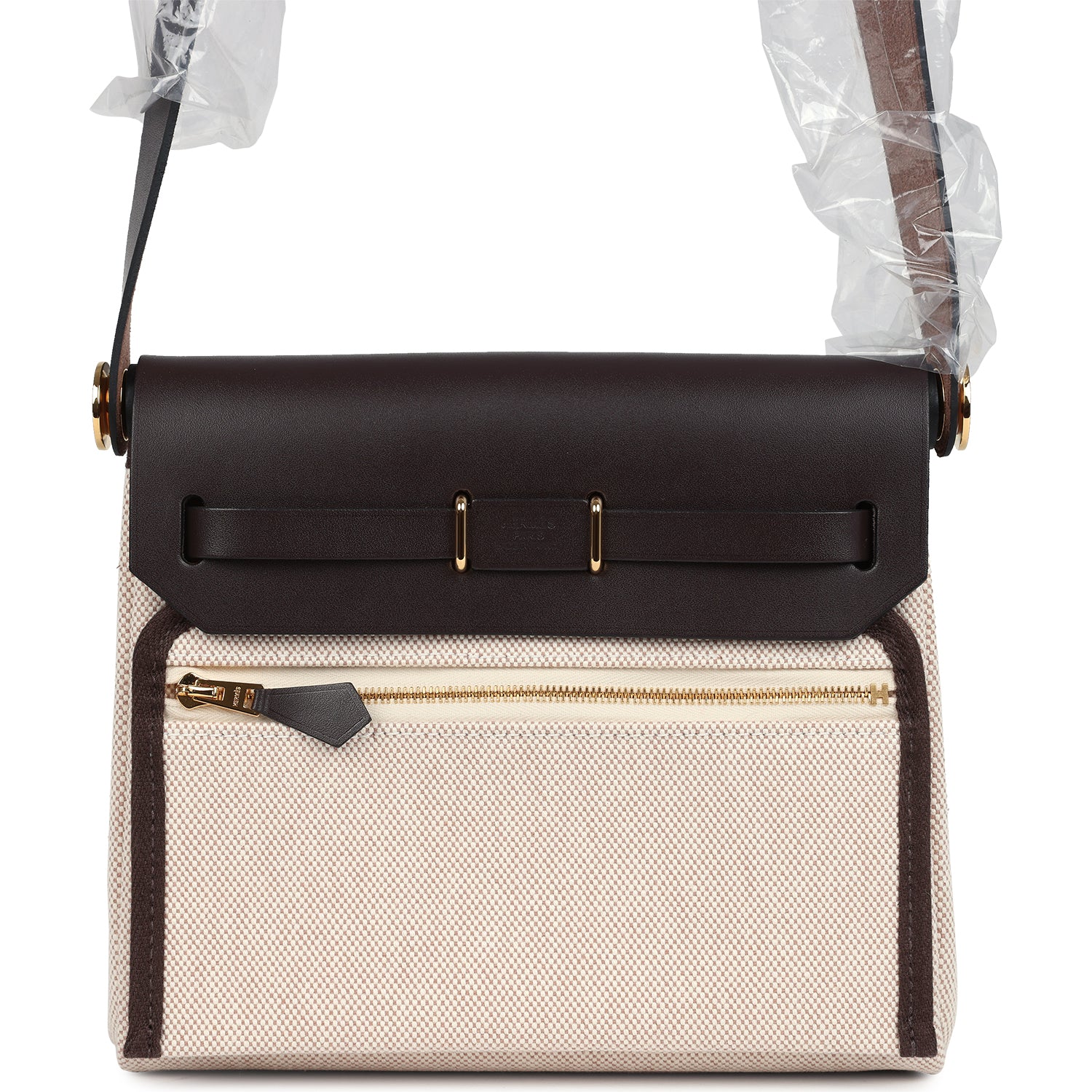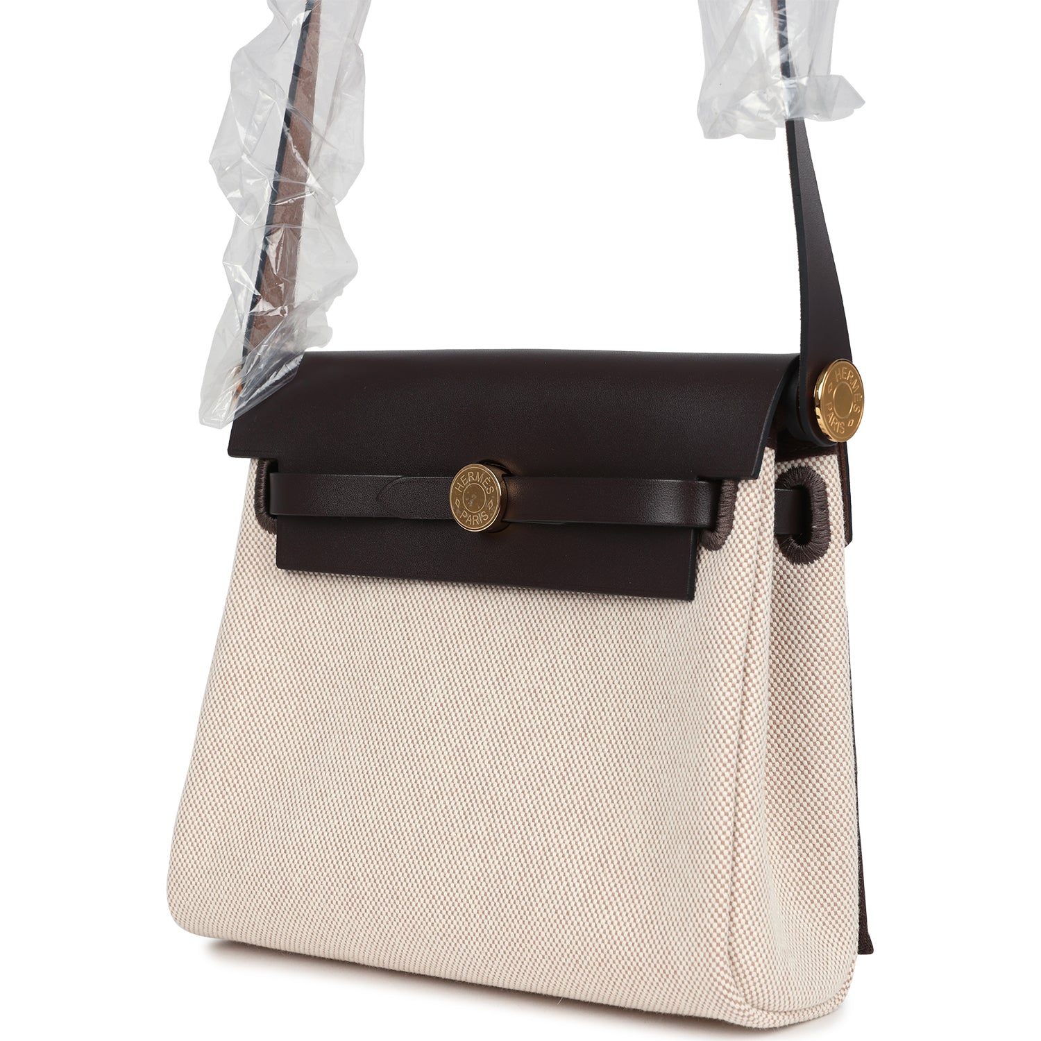 This Hermes Herbag Zip 20 Mini Ecru and Beige Toile H canvas and Ebene Vache Hunter with gold hardware has tonal stitching, front flap, two straps with center clou de selle closure, back zip pocket and Ebene shoulder strap.