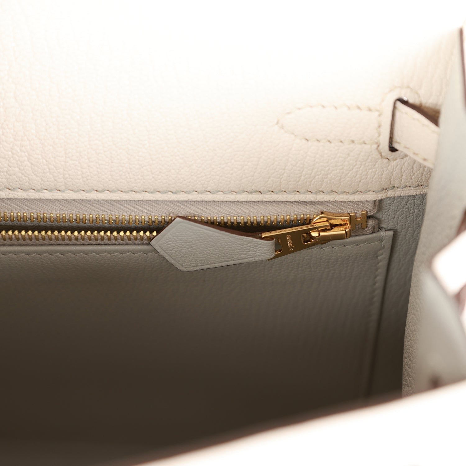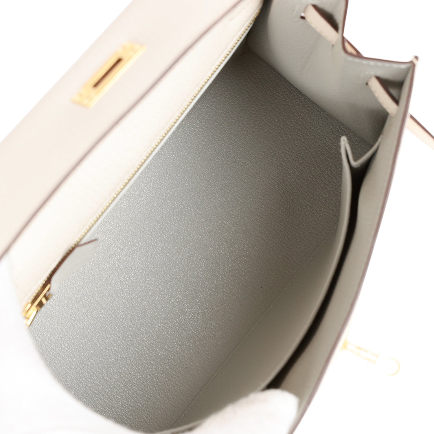 The interior is lined with Gris Perle chevre leather and has one zip pocket with an Hermes engraved pull and one open pocket on the opposite side.