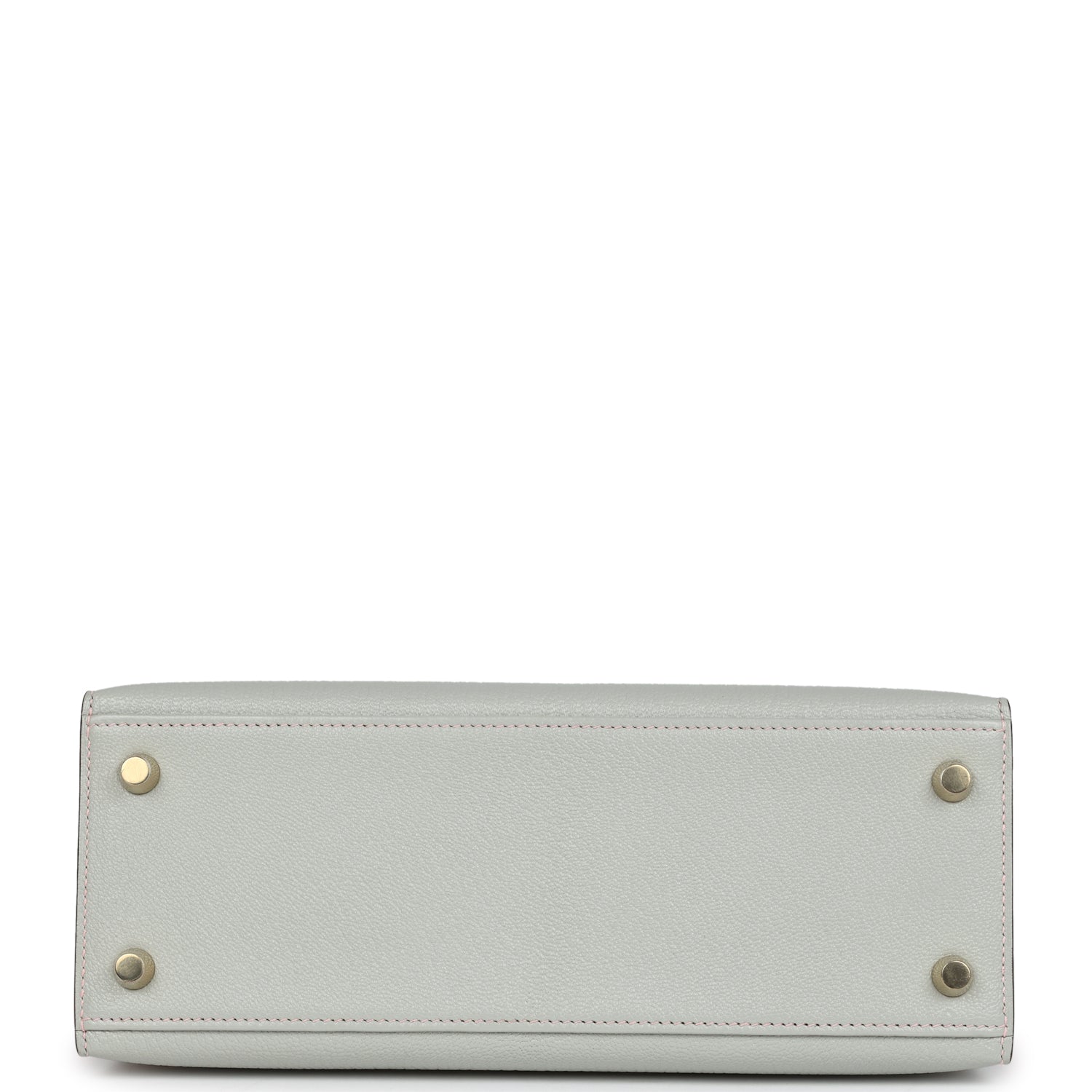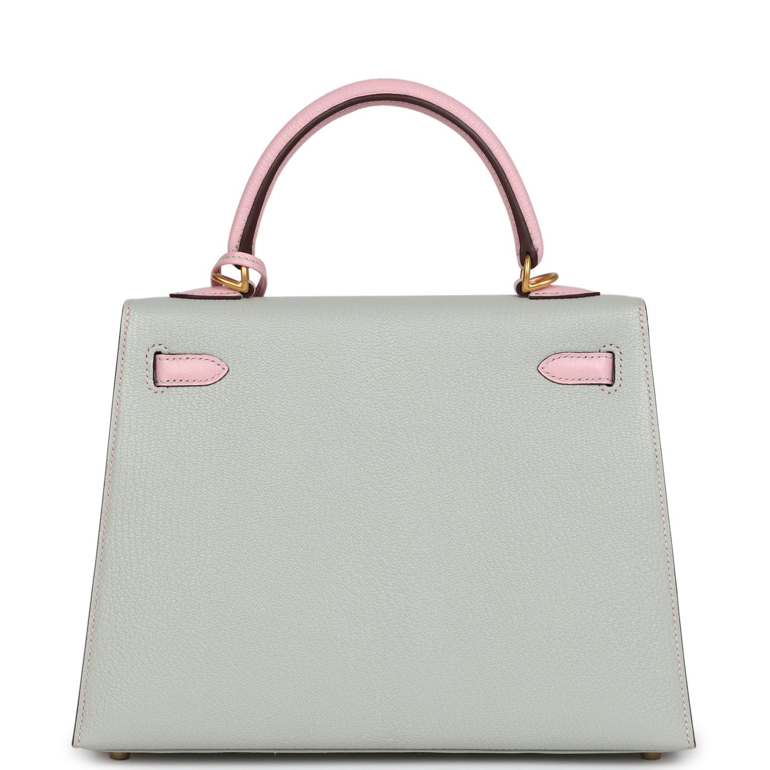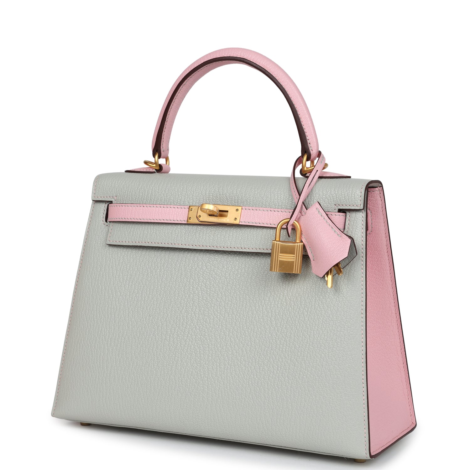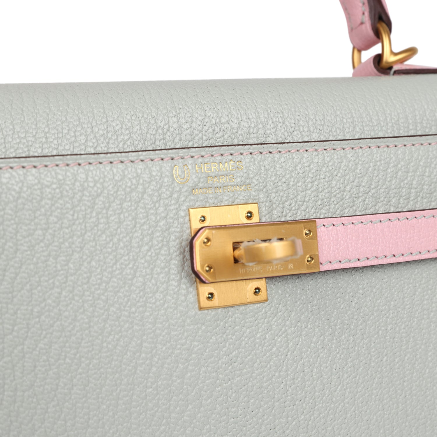 Special Order Kelly, in the Sellier style, is in Gris Perle and Rose Sakura chevre mysore leather with brushed gold hardware and has contrast stitching, two straps with front toggle closure, clochette, with a horse shoe heatstamp, a lock and two keys, single rolled handle and removable shoulder strap.