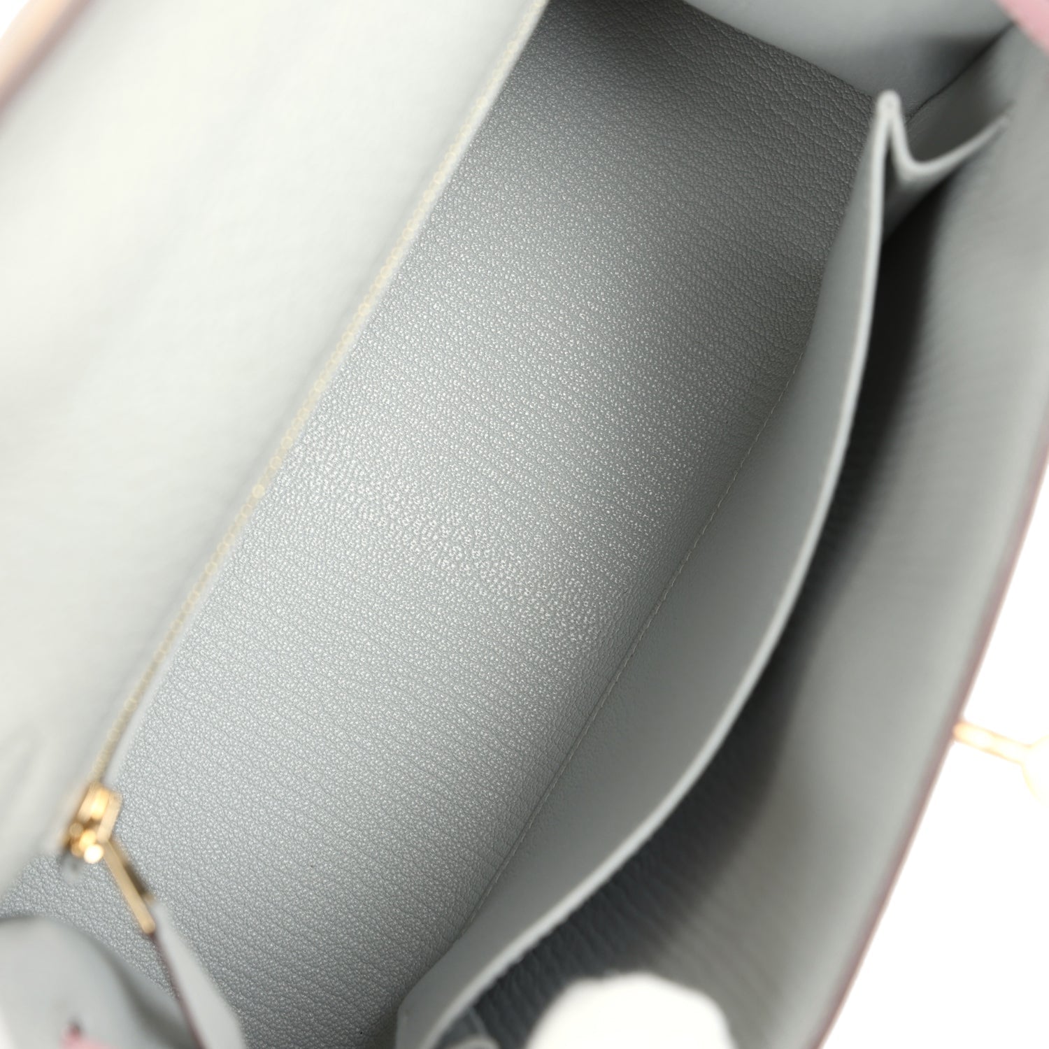The interior is lined with Gris Perle chevre leather and has one zip pocket with an Hermes engraved pull and one open pocket on the opposite side.
