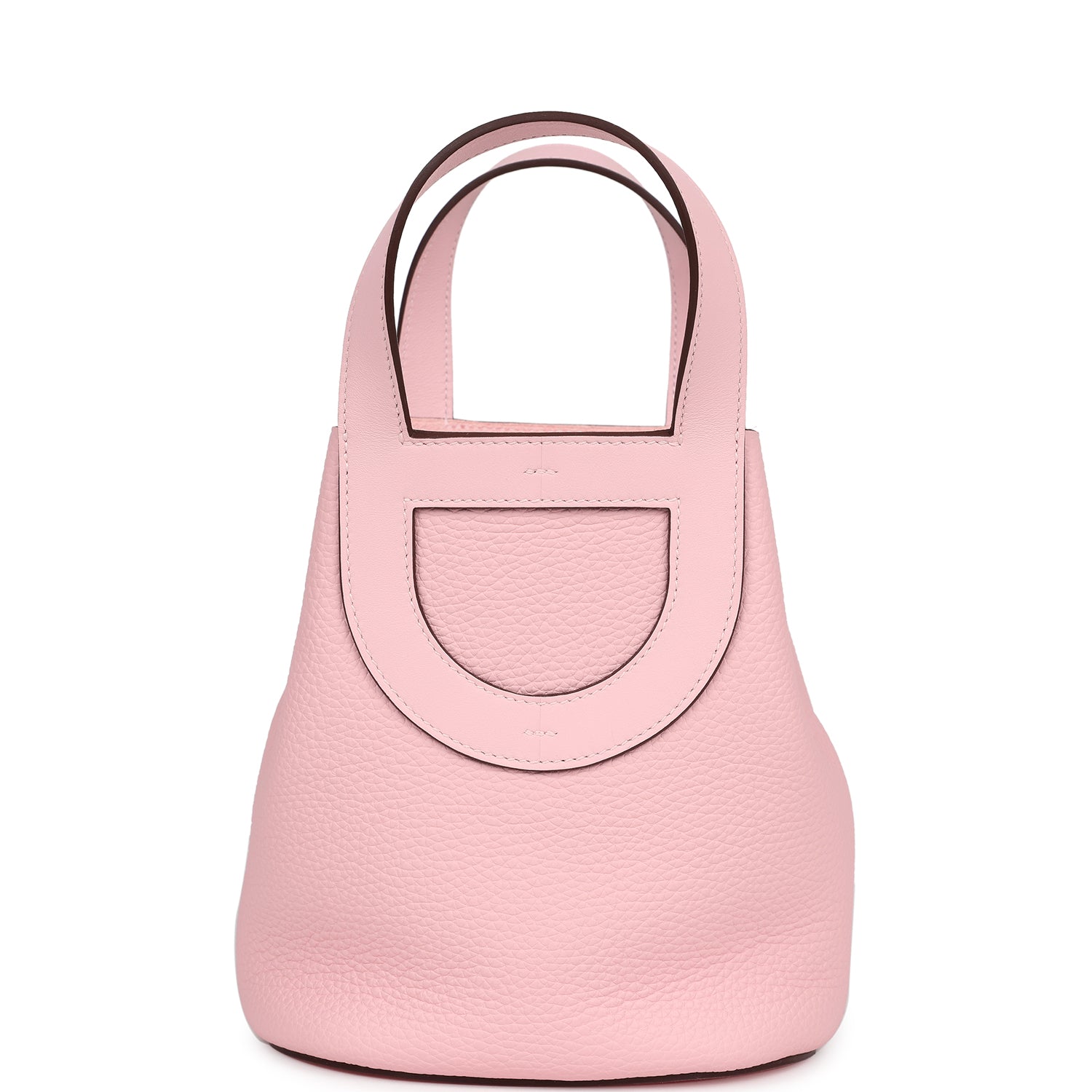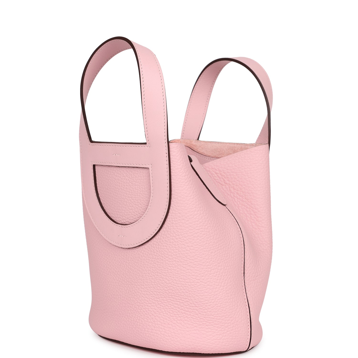 Hermes In-The-Loop 18 in Rose Sakura clemence and swift leather with palladium hardware is a bucket shaped bag with contrast stitching, two Chaine d'Ancre shaped handles, single interior pocket and a Chaine d'Ancre shaped hook closure.