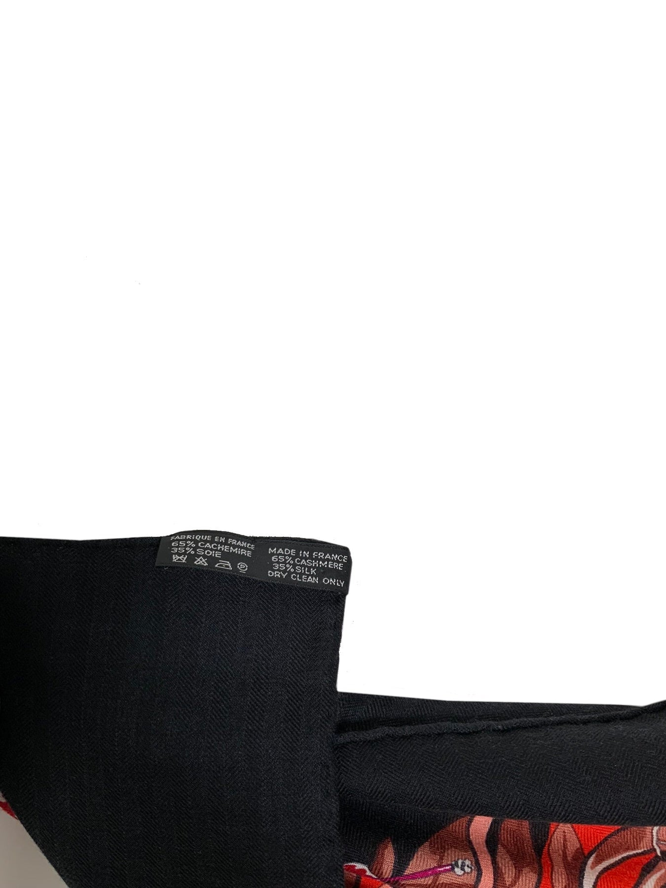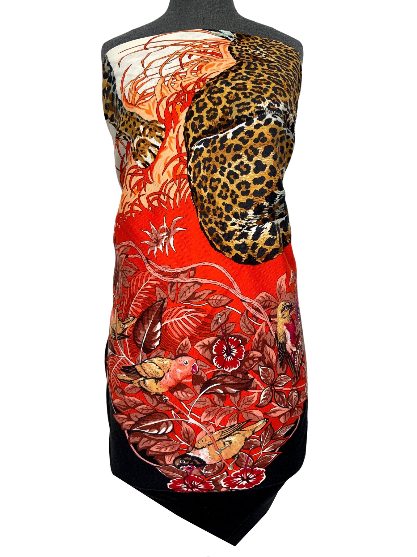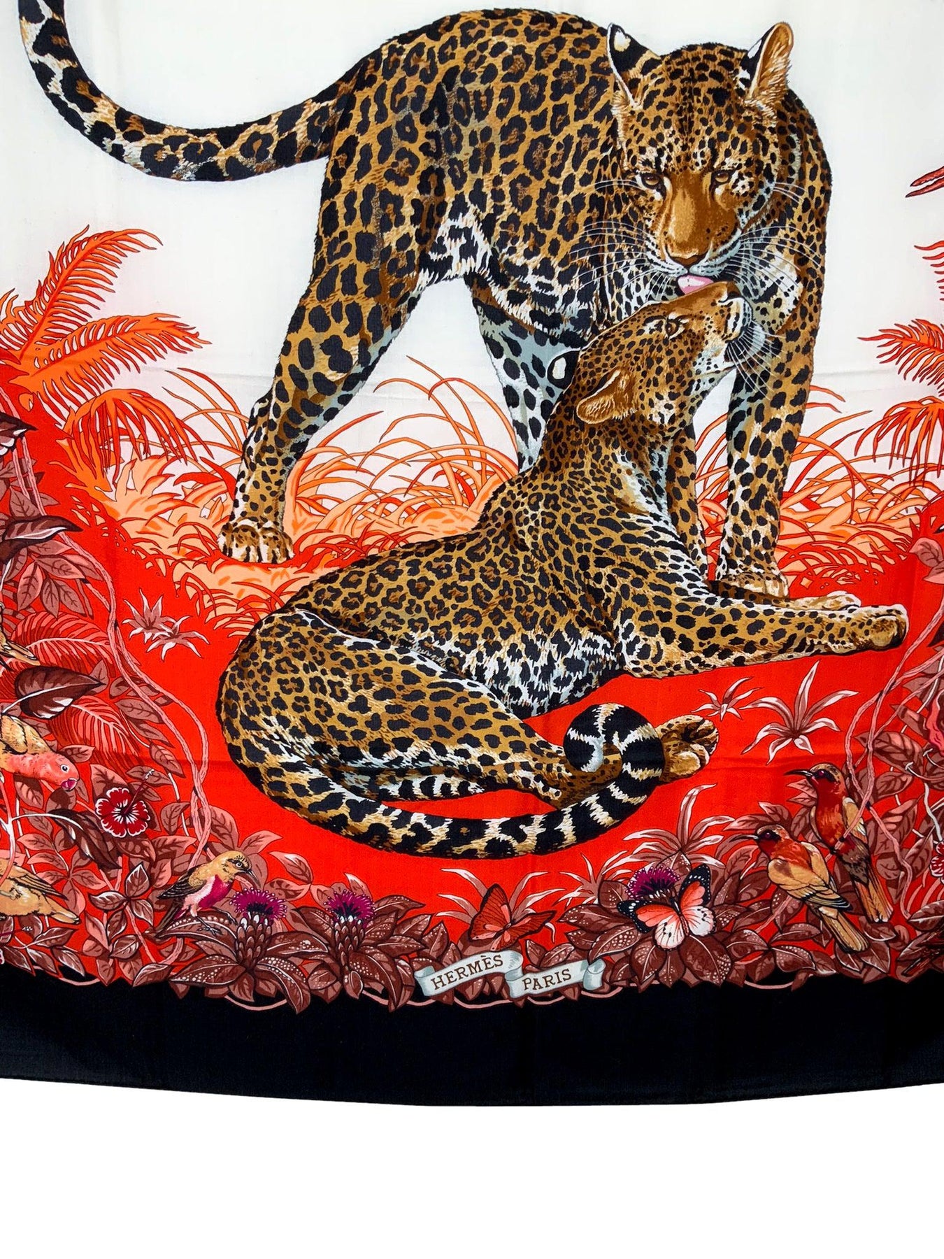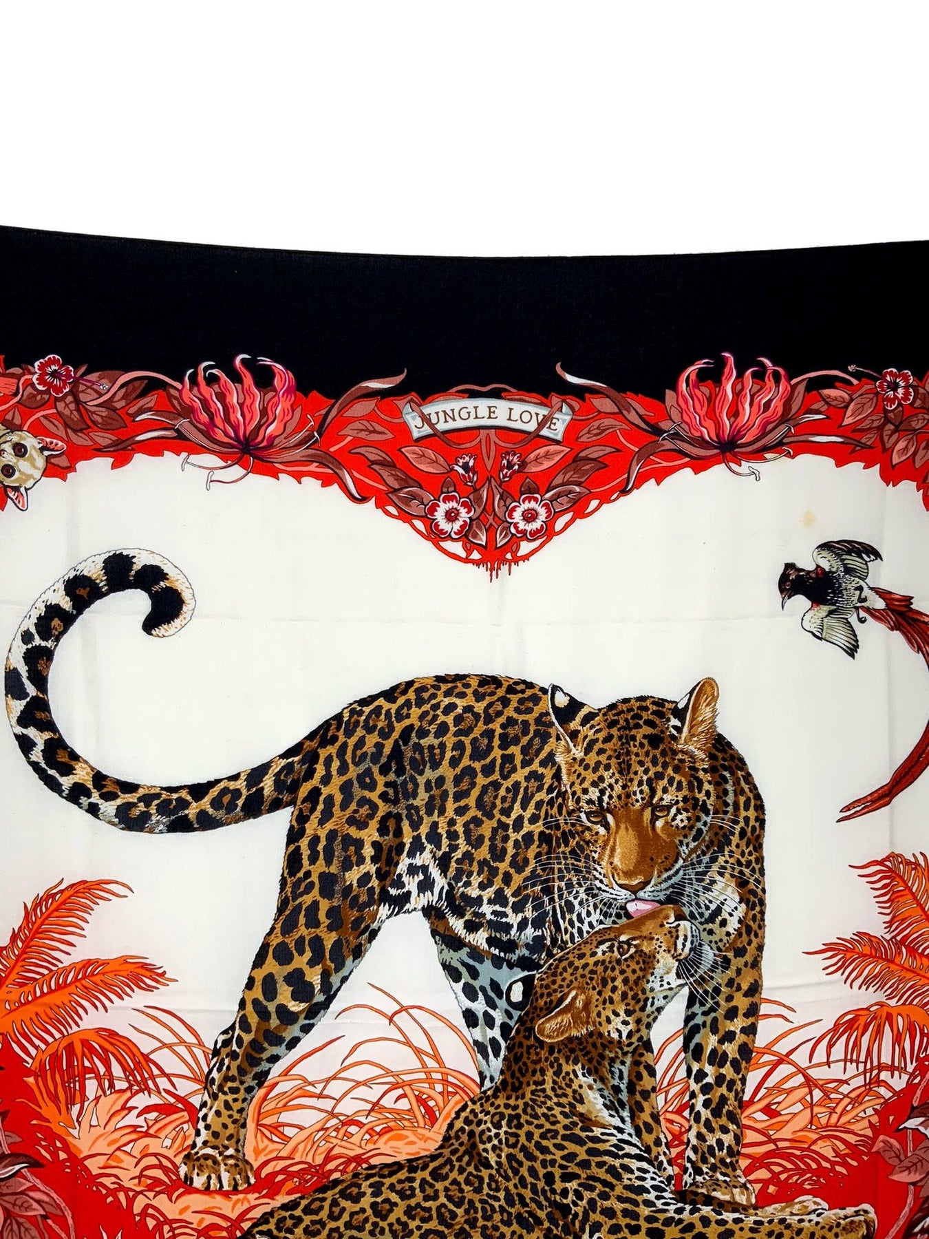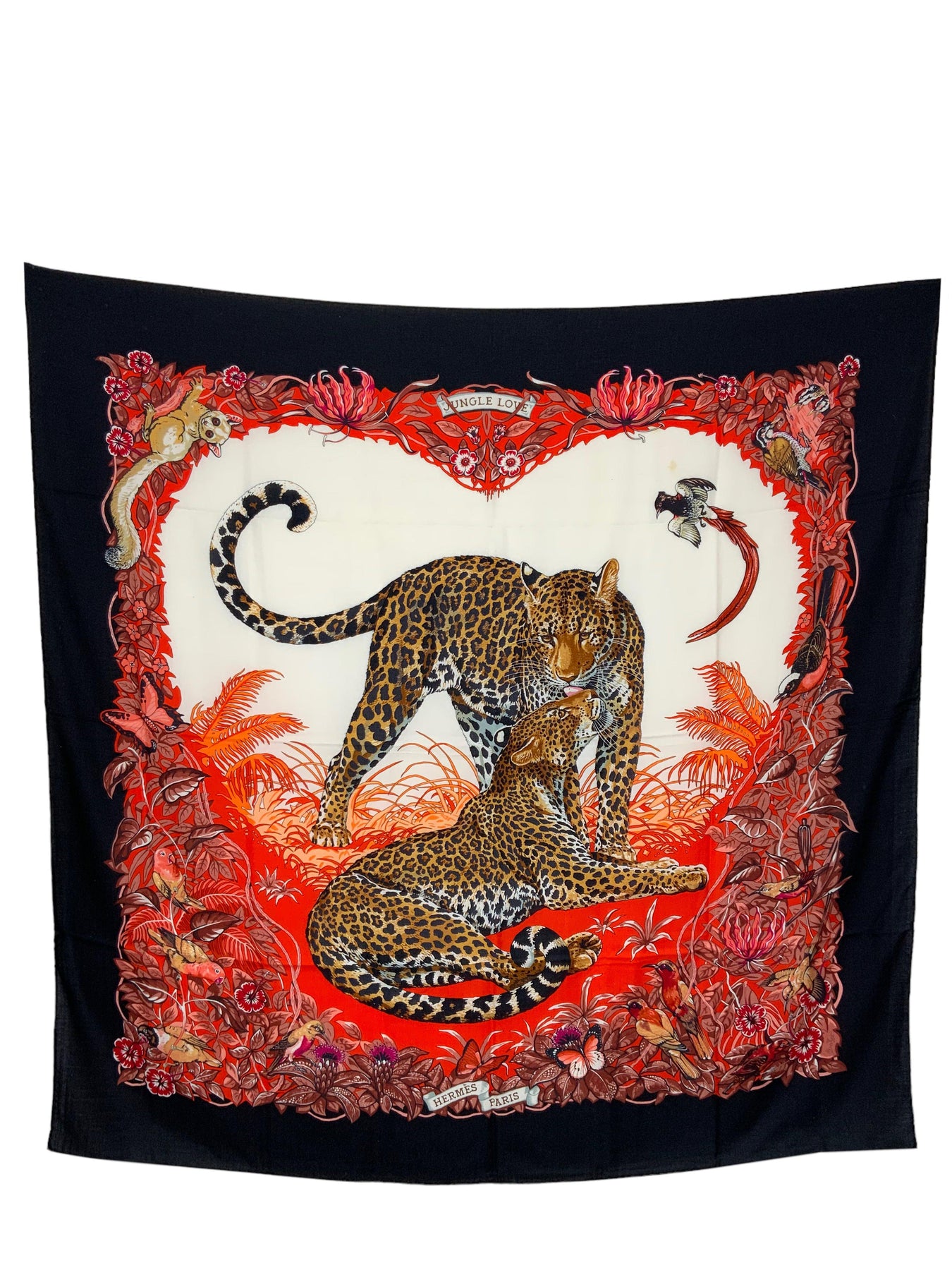 We the ity of this absolutely stunning and bursting with color Hermes Jungle Love Cashmere Shawl Scarf 140 designed by Robert Dallet which was first issued in 2014. This gorgeous scarf features depicts a male and a female feline in vibrant red, black and orange hues.