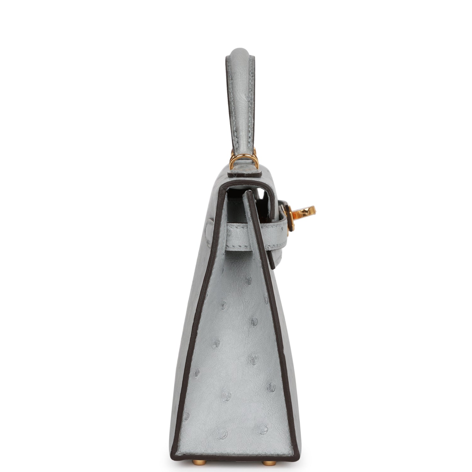 This Kelly is in Bleu Glacier Ostrich with gold hardware and has tonal stitching, two front straps with front toggle closure, single rolled handle and removable shoulder strap.