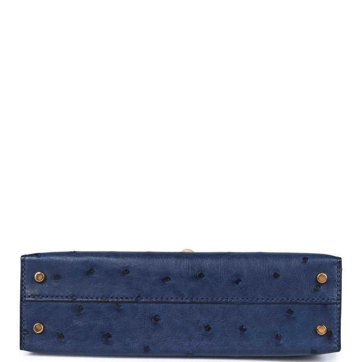 This tiny Kelly, in the Sellier style, is in Bleu Saphir ostrich leather with gold hardware and has tonal stitching, two front straps with front toggle closure, single rolled handle and removable shoulder strap.