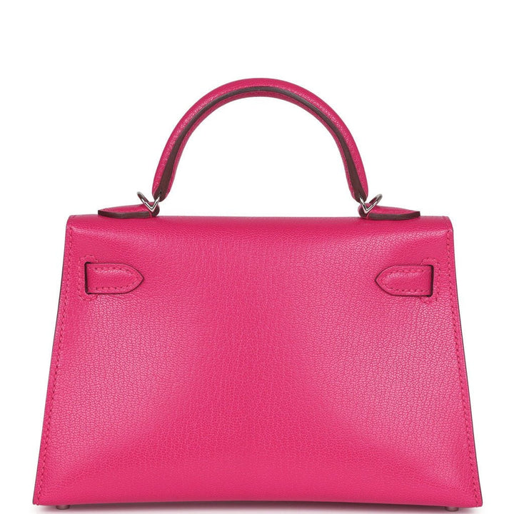 This tiny Kelly is in Rose Extreme Chevre Chamkila with palladium hardware and has tonal stitching, front toggle closure, single rolled handle, removable strap.
