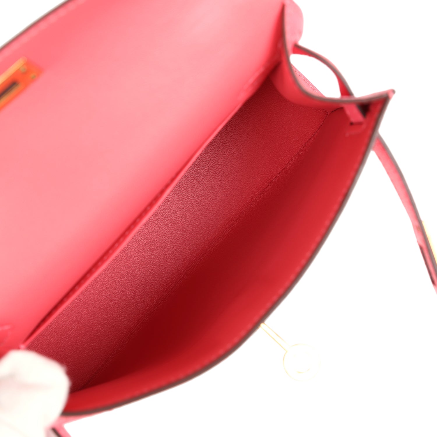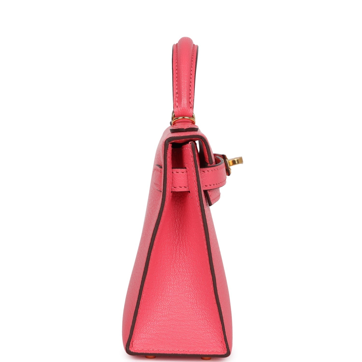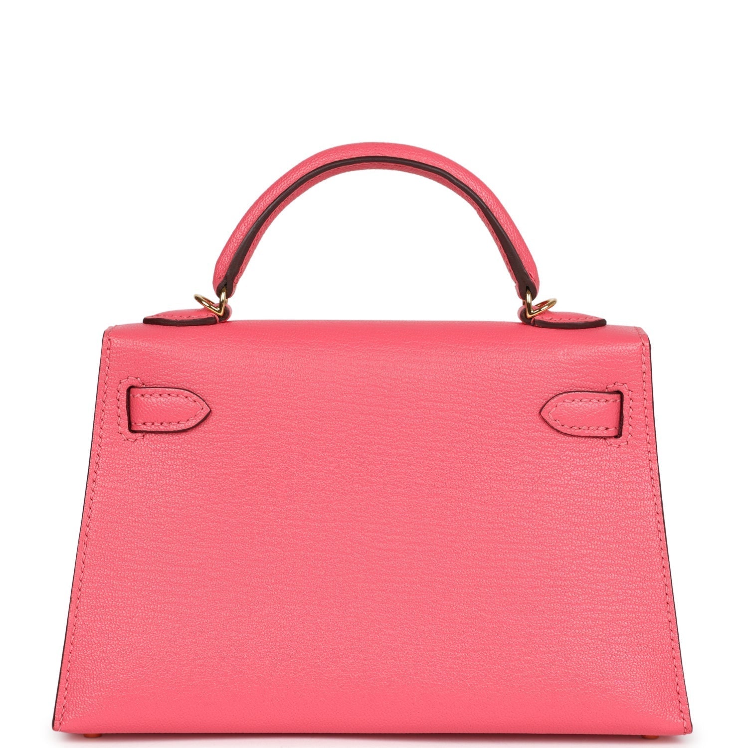 Kelly, in the Sellier style, is in Rose Azalee chevre mysore leather with gold hardware and has tonal stitching, two straps with front toggle closure, single rolled handle and removable shoulder strap.