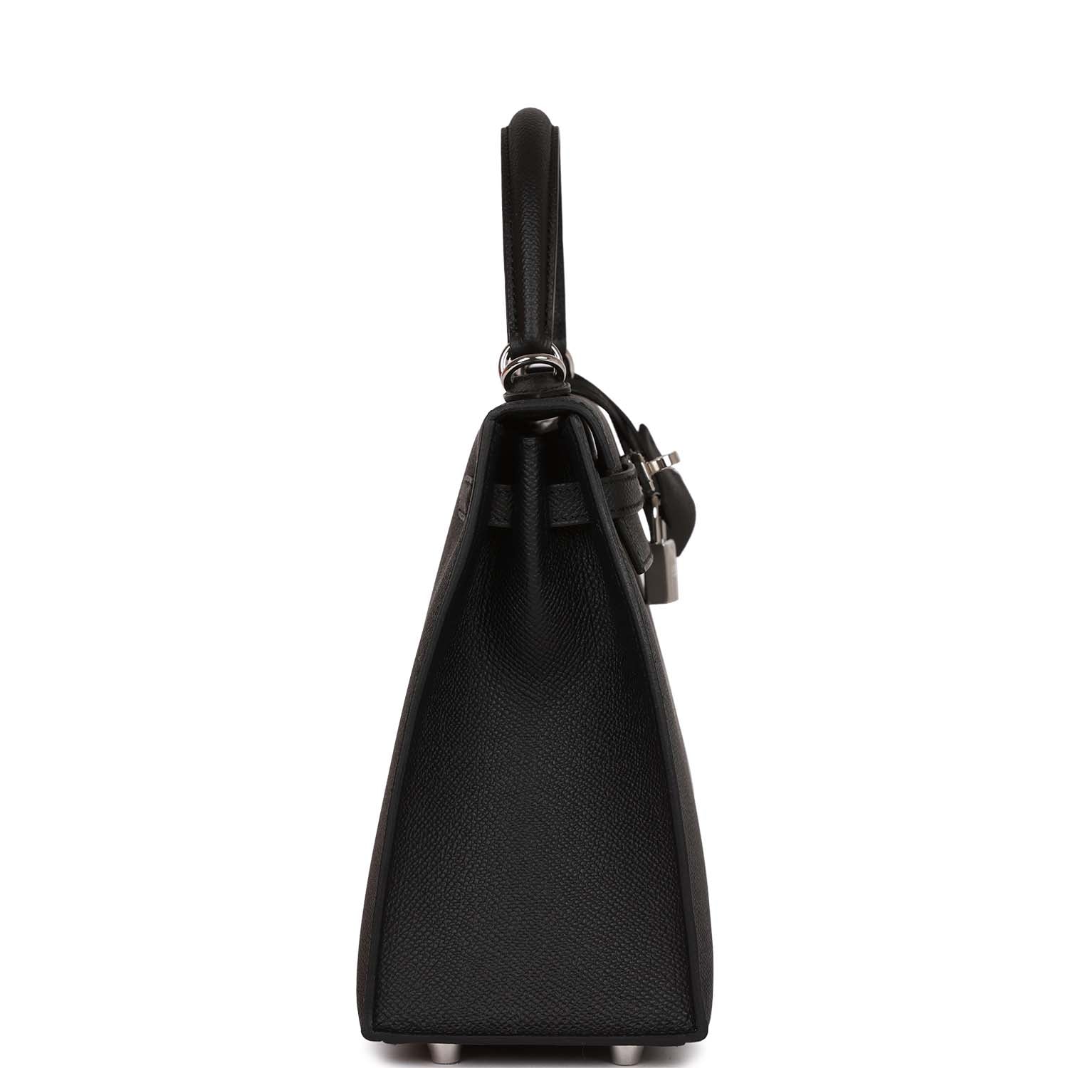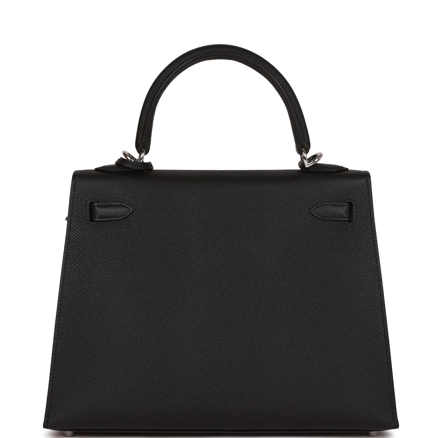 This Hermes Kelly 25, in the Sellier style, is in Black epsom leather with palladium hardware, tonal stitching, front flap with two straps, front toggle closure, clochette with lock and two keys, and single rolled handle.
