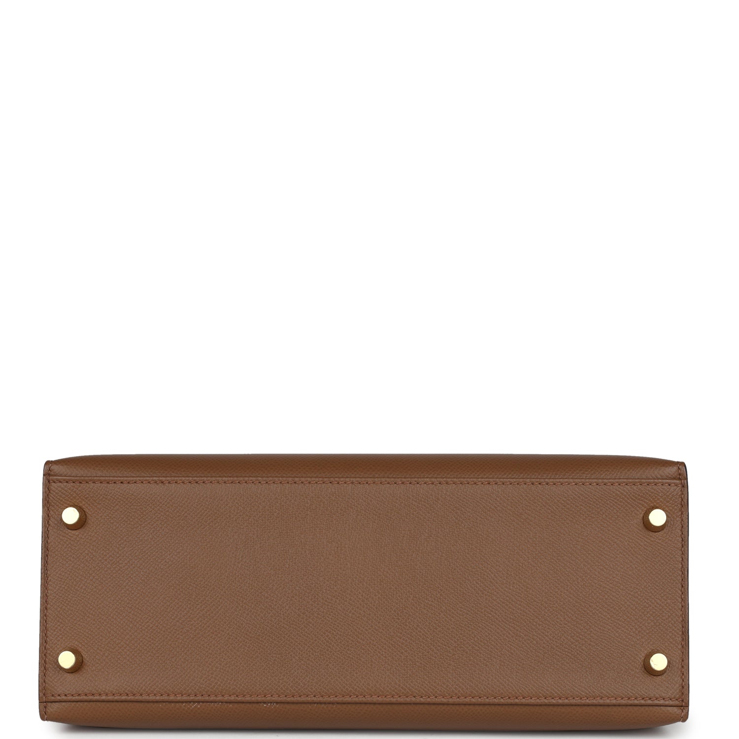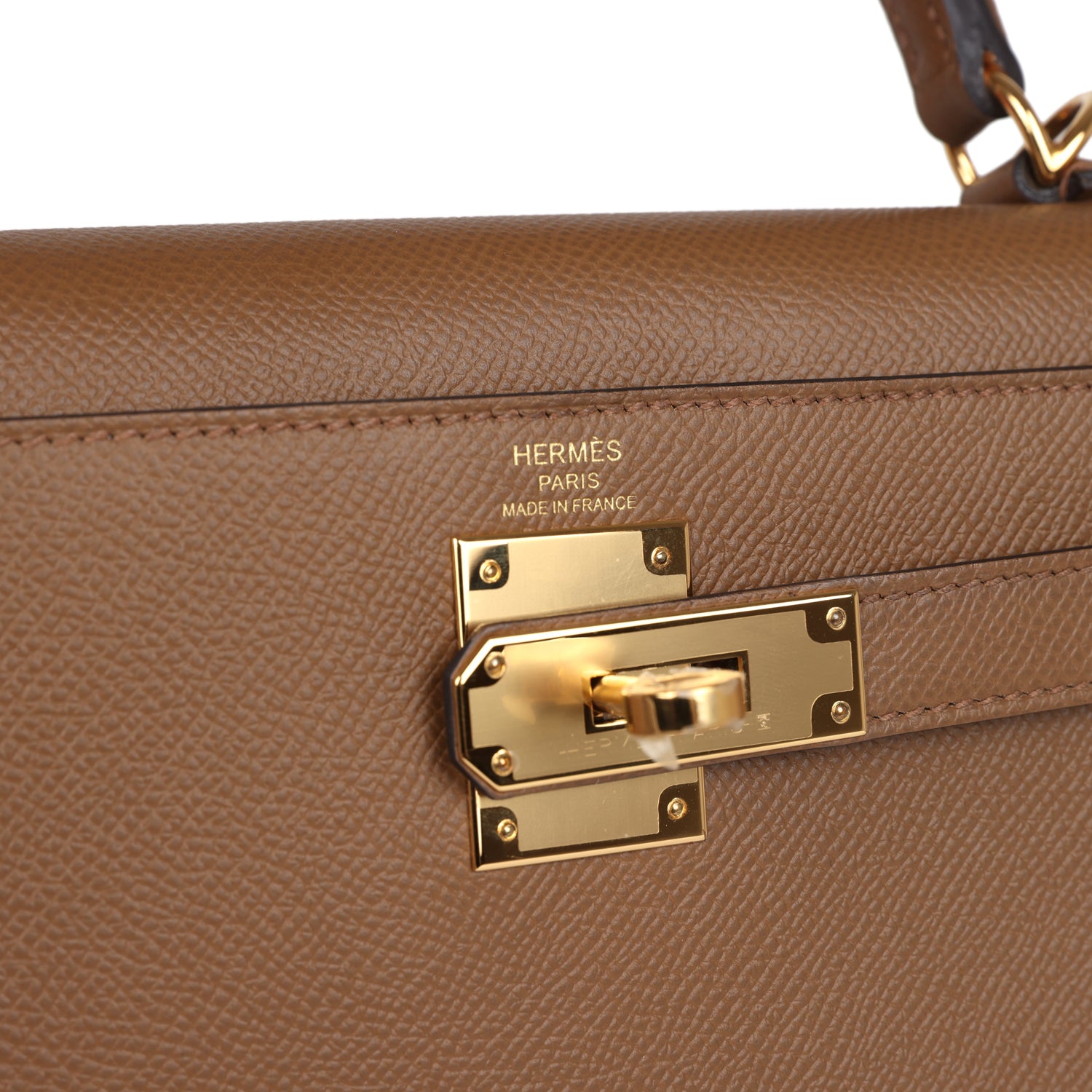 Kelly, in the Sellier style, is in Alezan epsom leather with gold hardware and has tonal stitching, front flap, two straps with center toggle closure, clochette with lock and two keys a single rolled handle and removable shoulder strap.