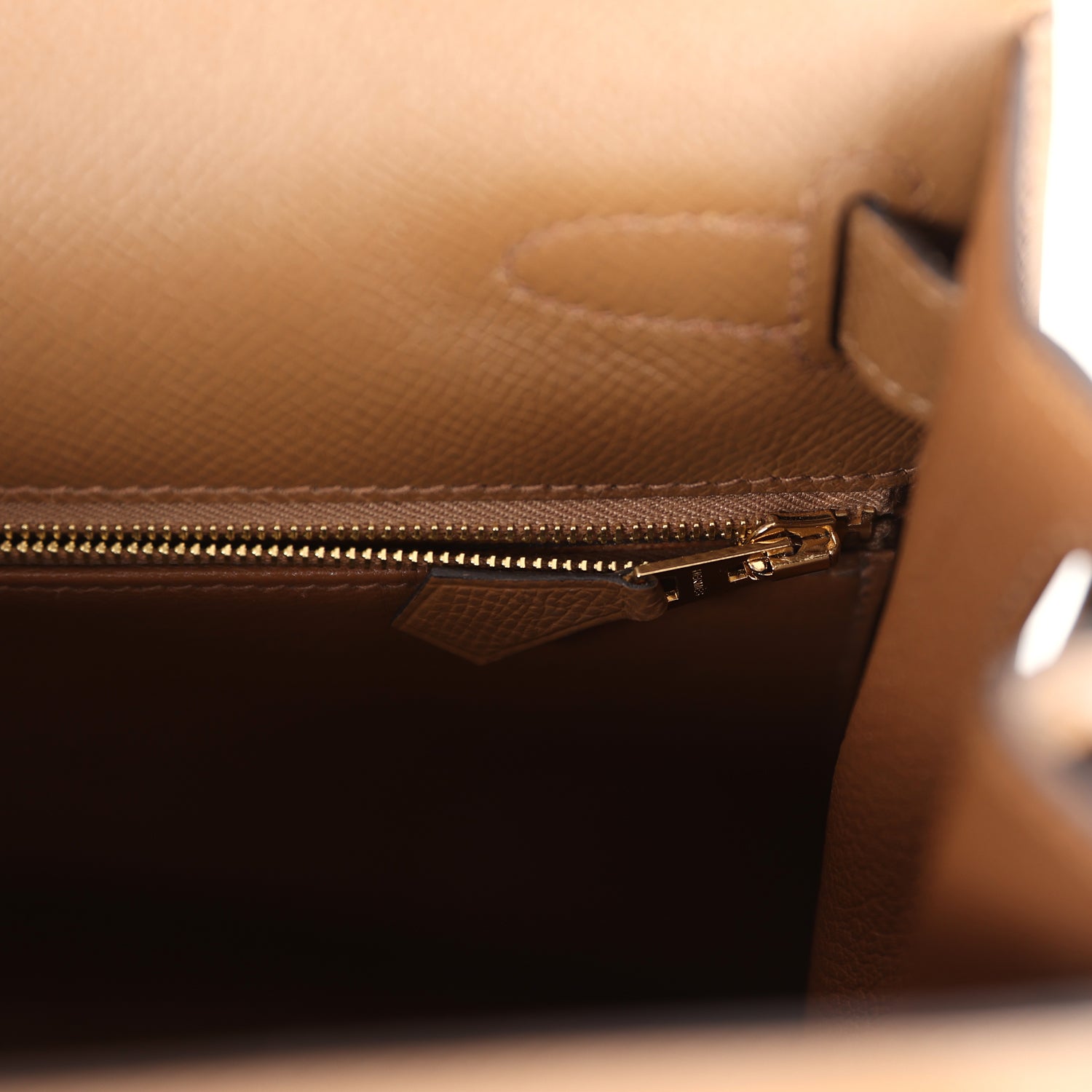 The interior is lined with Alezan chevre leather and has one zip pocket with an Hermes engraved pull and two open pockets on the opposite side.
