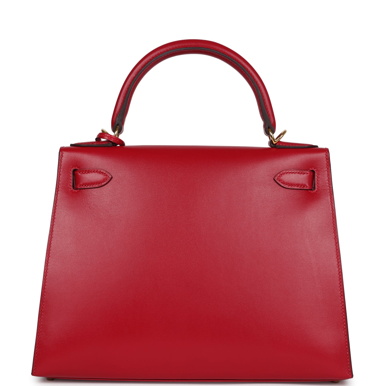 Kelly, in the Sellier style, is of Rouge Vif tadelakt leather with gold hardware, features tonal stitching, a front toggle closure, a clochette with lock and two keys and a single rolled handle.