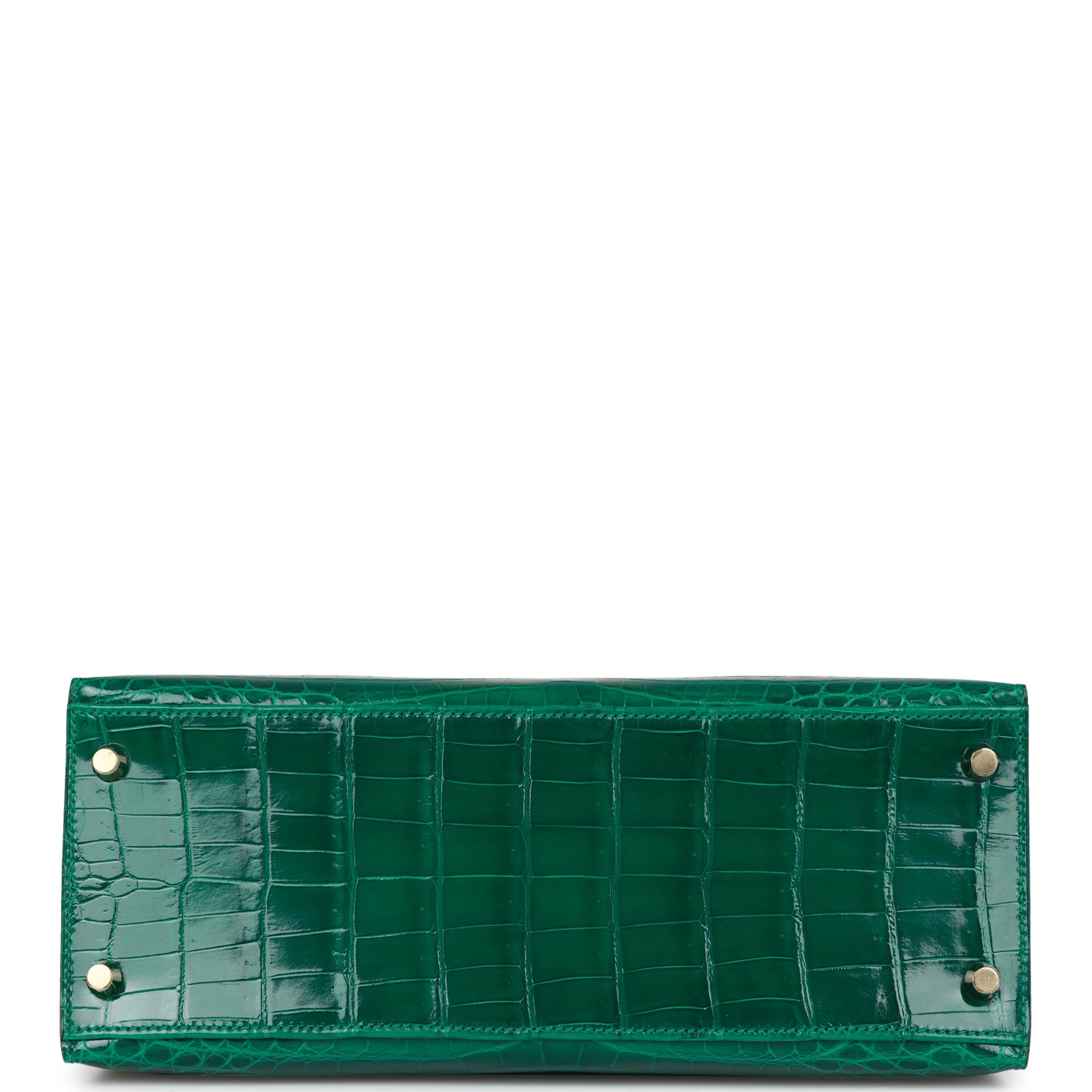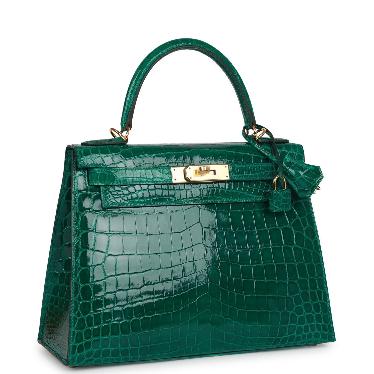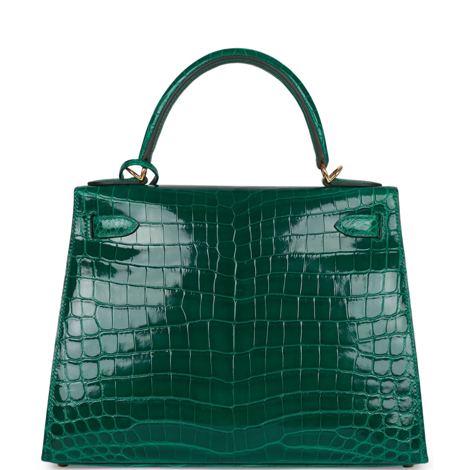 This Special Order Kelly 28cm, in the Sellier style, is of Vert Emeraude (Emerald) shiny niloticus crocodile with gold hardware and features tonal stitching, a front toggle closure, a clochette with lock and two keys and a single rolled handle.