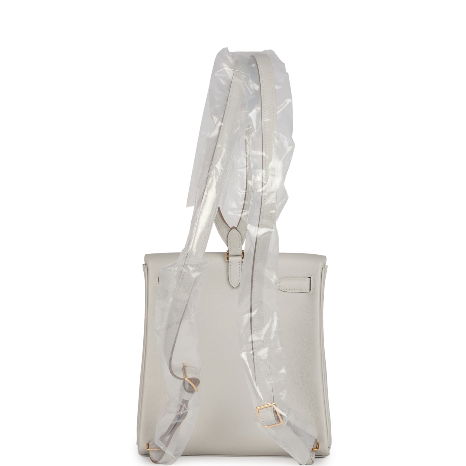 Kelly Ado II Backpack is in Gris Perle evercolor leather with gold hardware and has tonal stitching, two straps with front toggle closure, and two adjustable shoulder straps.