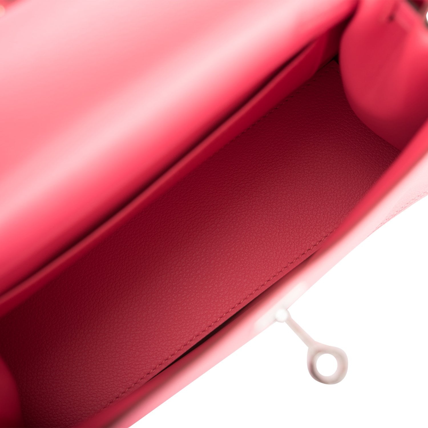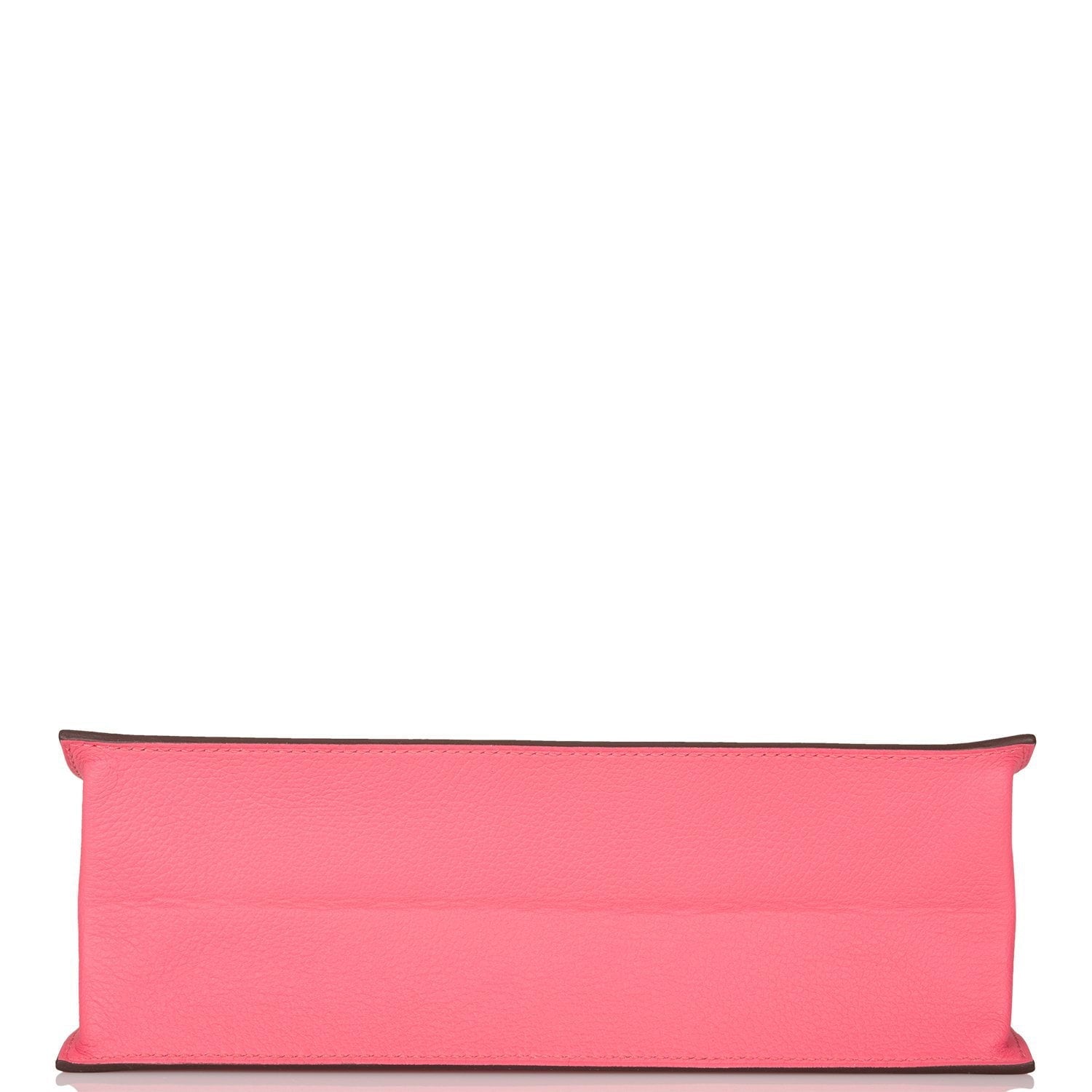 The interior is lined with Rose Azalee lambskin and has a removable Hermes stamped base and an open wall pocket.