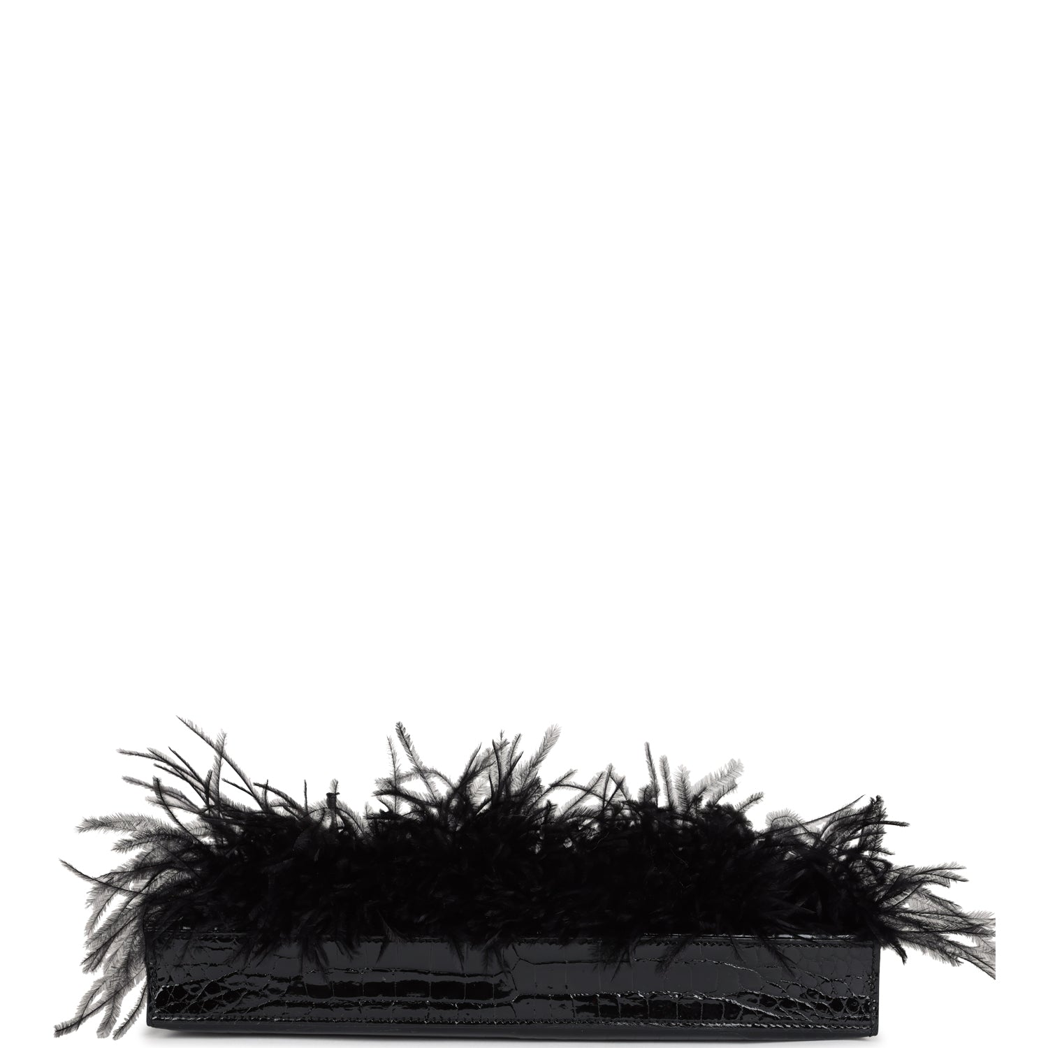 This Kelly Elan Foile is in Black shiny porosus crocodile leather and ostrich feathers with gold Hardware, two pull straps that attach to a toggle, ostrich feathers on front of bag, and an interior that has snaps for detachable shoulder strap.
