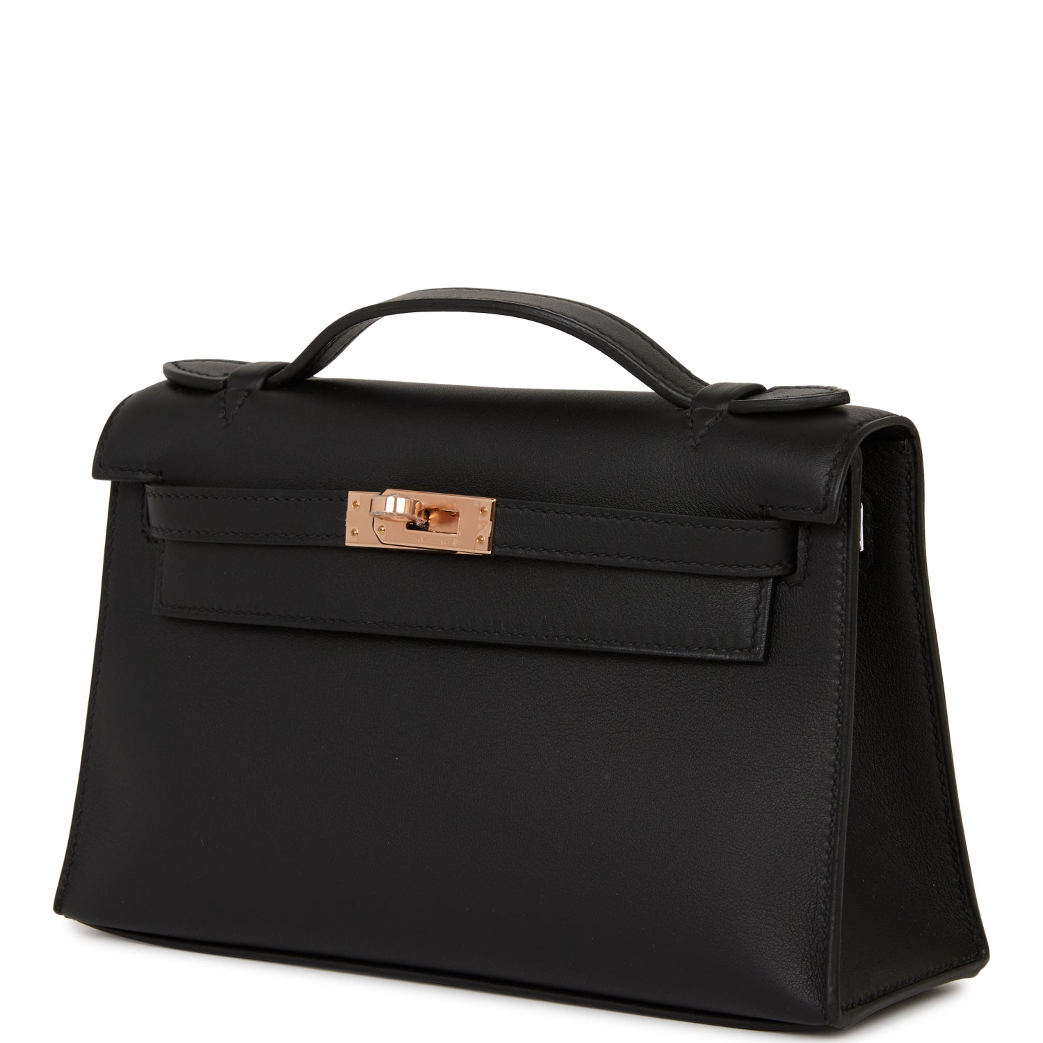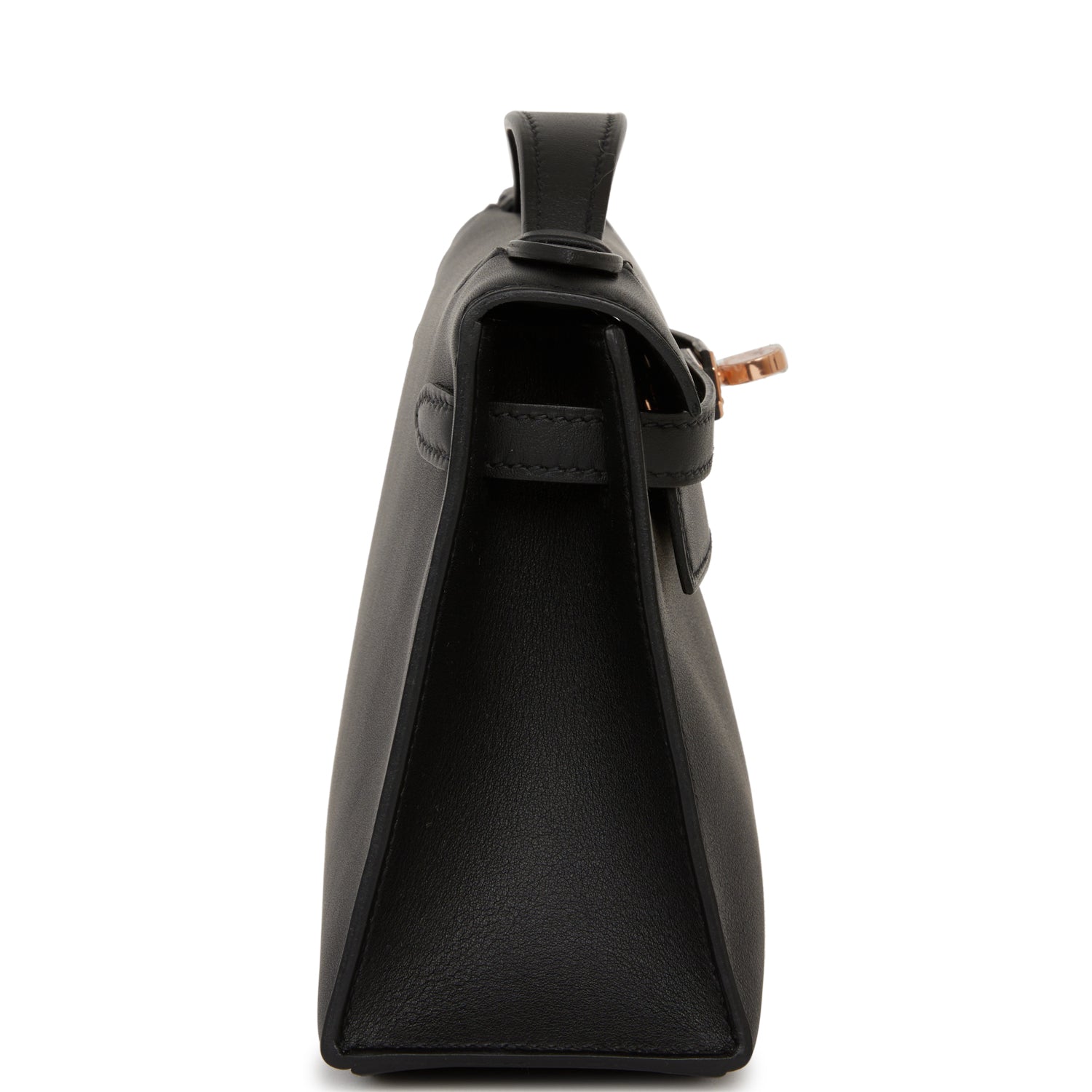 This Mini Kelly Pochette is in Black swift leather with rose gold hardware and has tonal stitching, front flap, two straps with center toggle closure and a top flat handle.