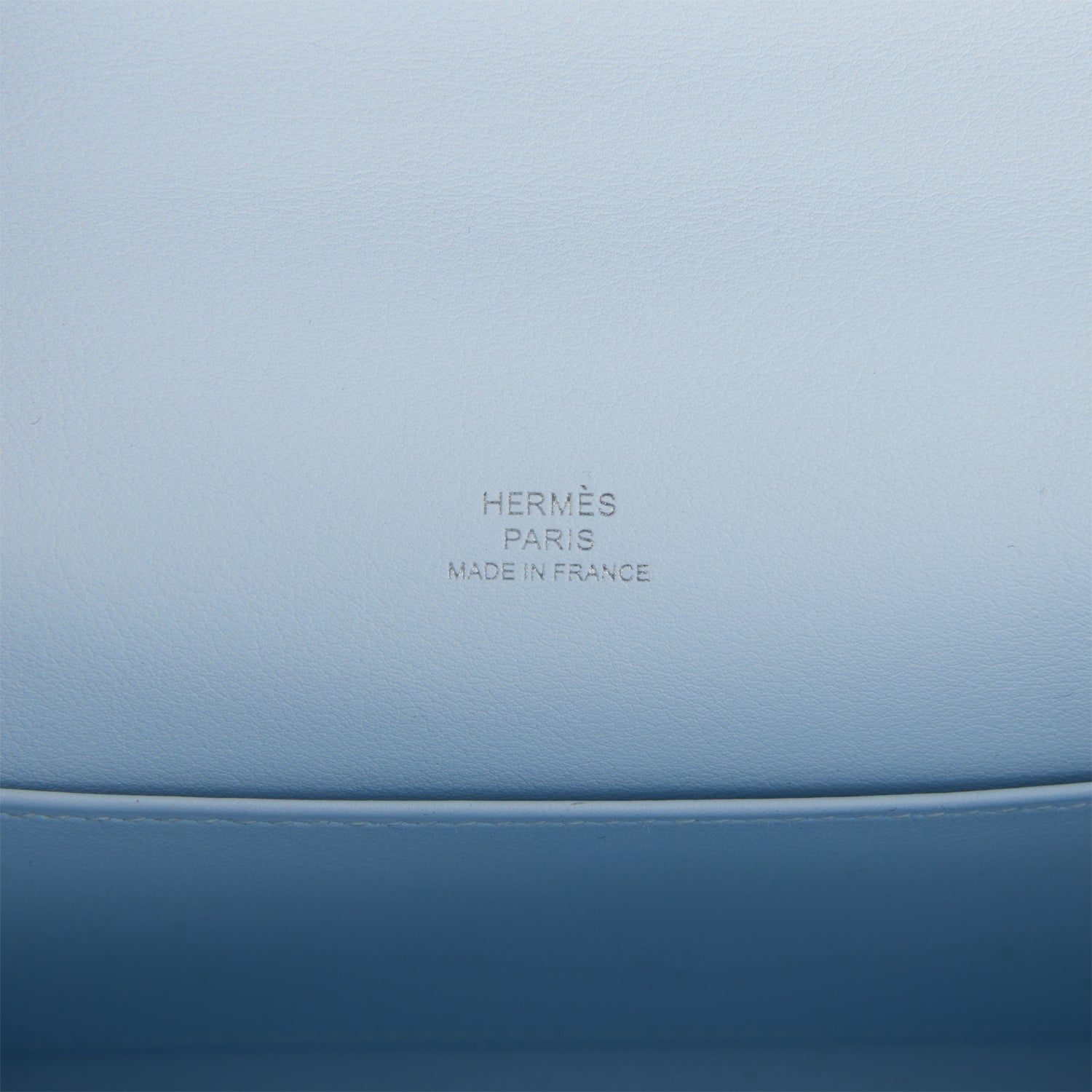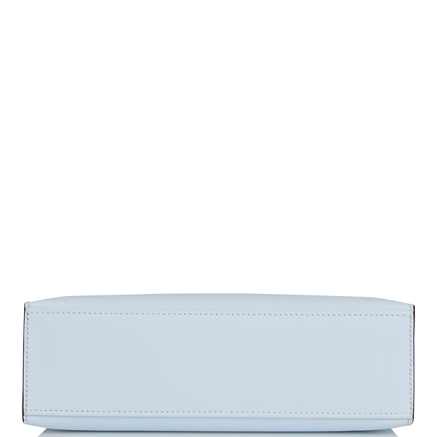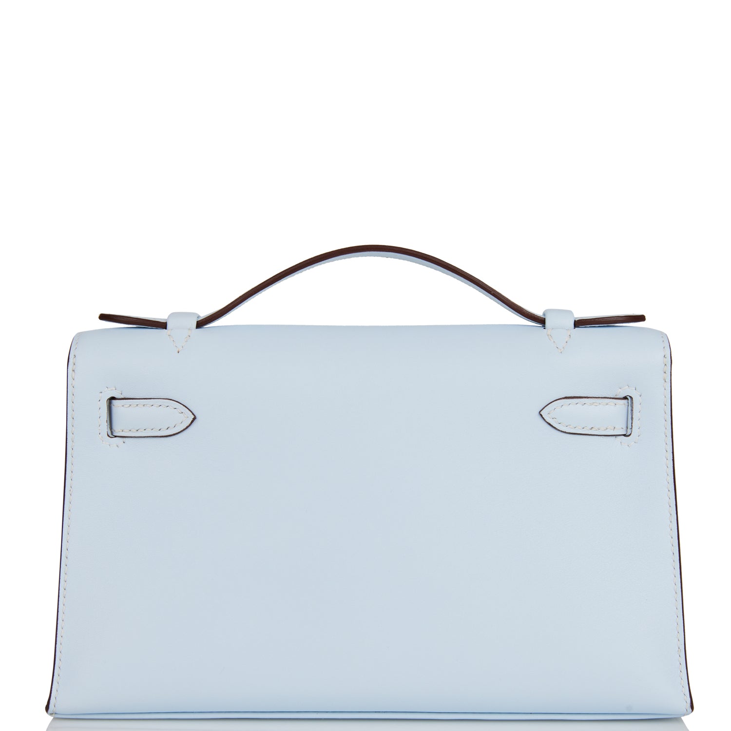 This Mini Kelly Pochette is in Bleu Brume swift leather with palladium hardware and has tonal stitching, front flap, two straps with center toggle closure and a top flat handle.