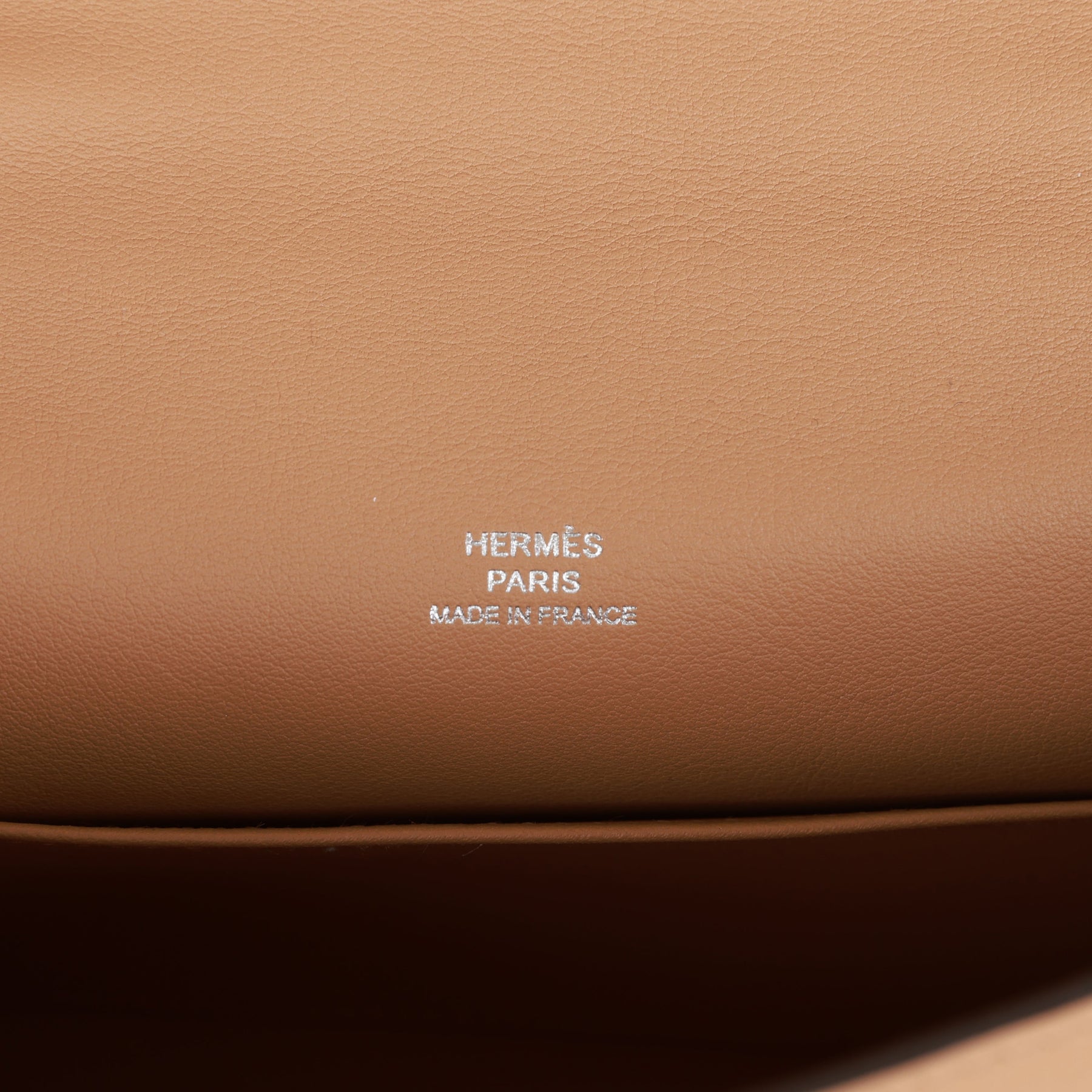 This Mini Kelly Pochette is in Chai swift leather with palladium hardware and has tonal stitching, front flap, two straps with center toggle closure and a top flat handle.