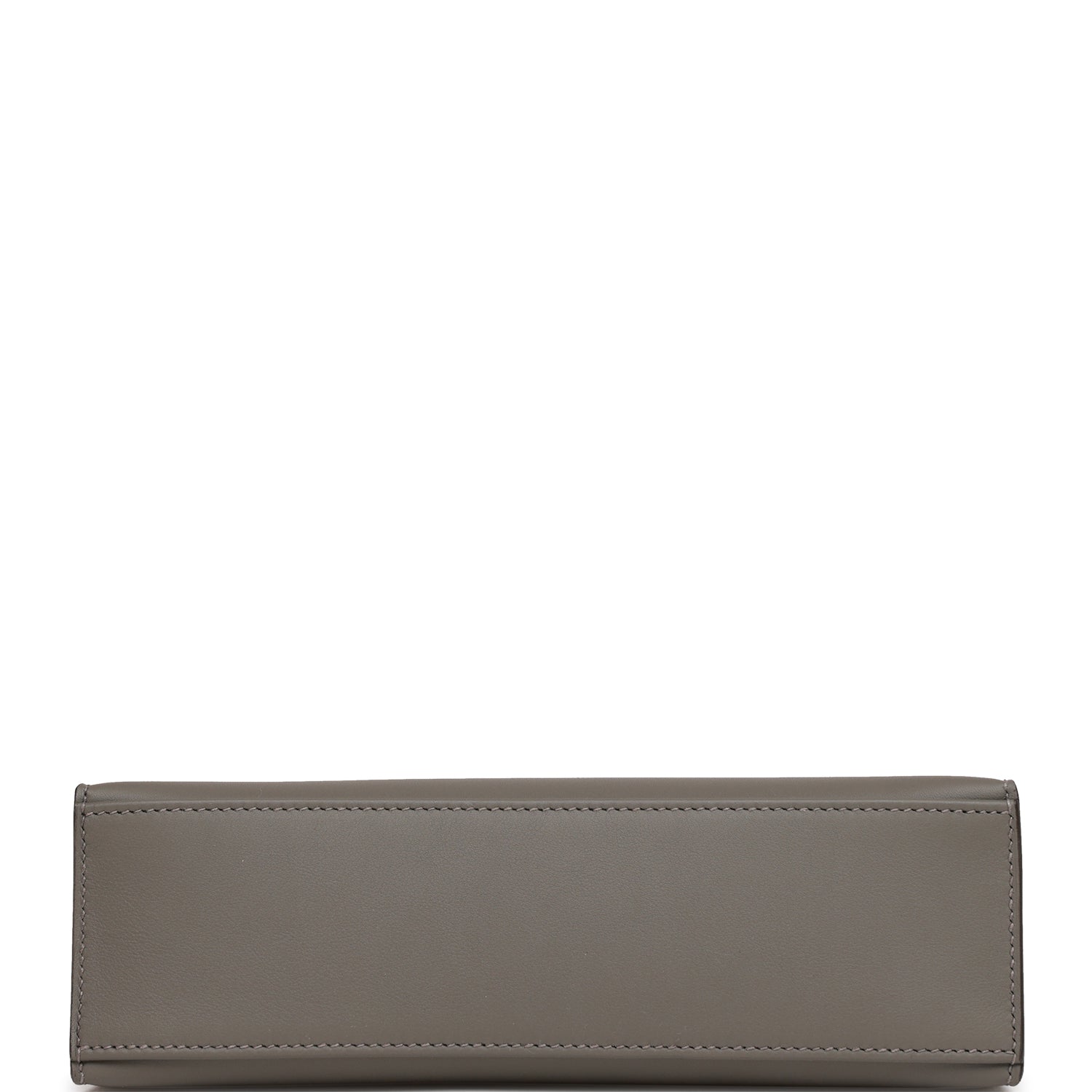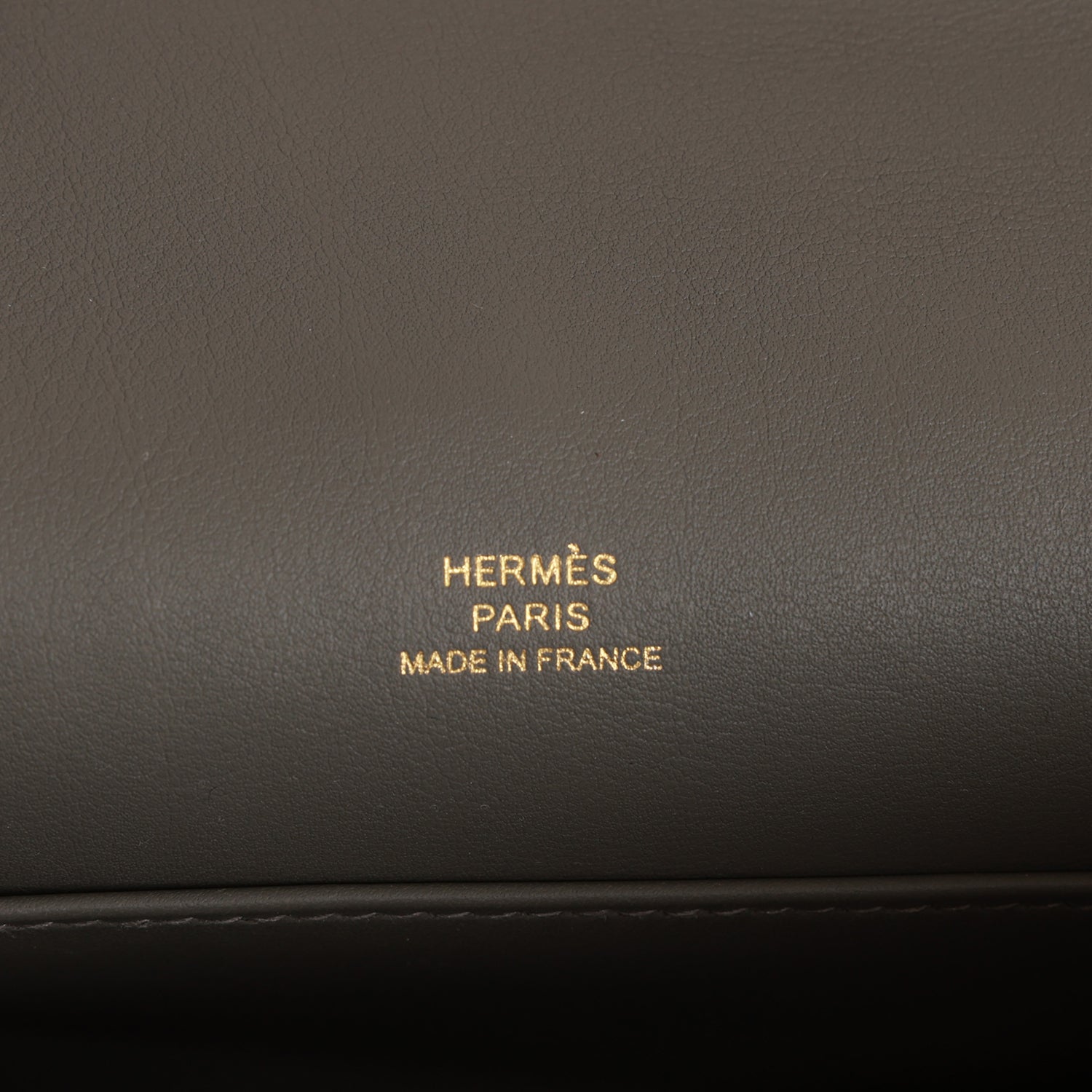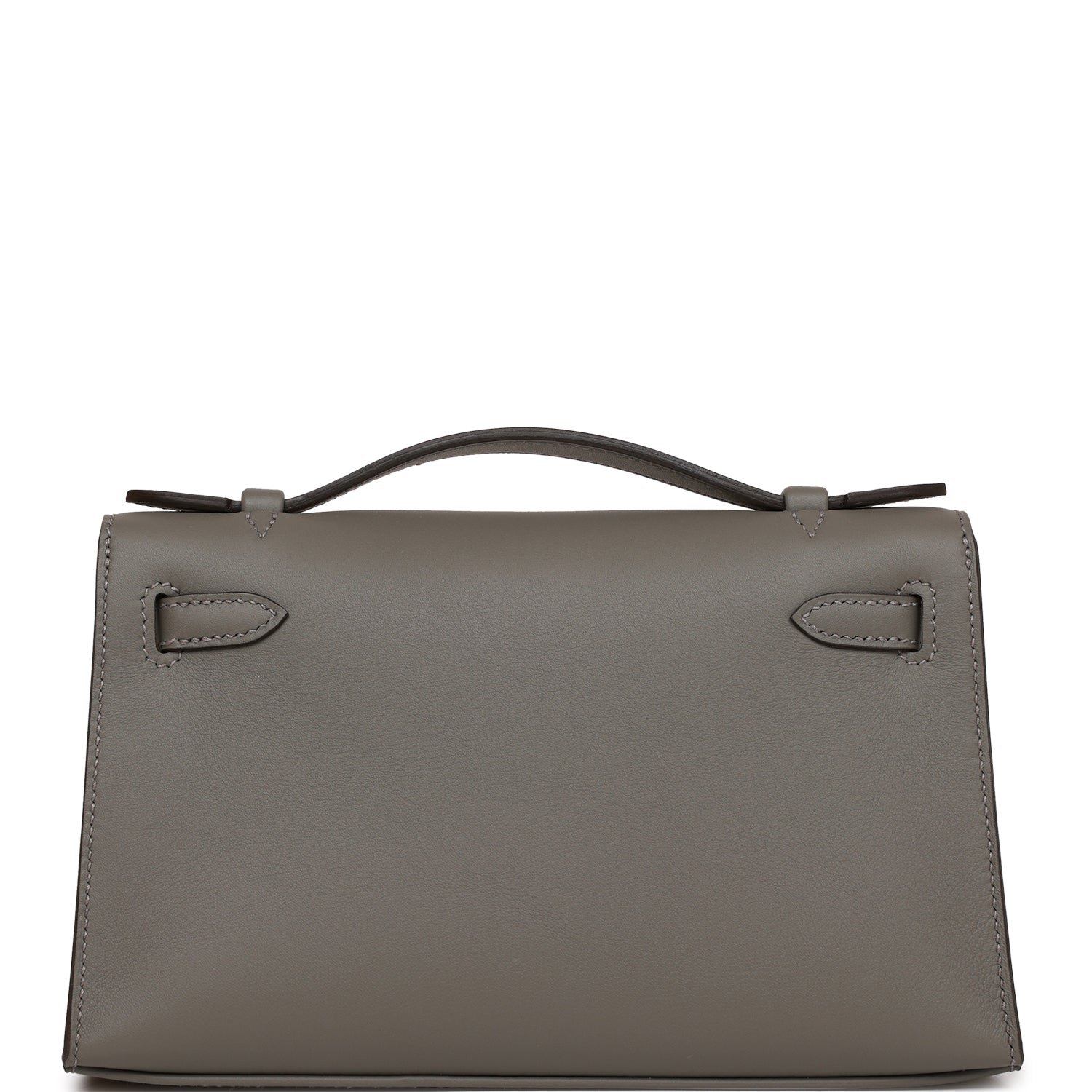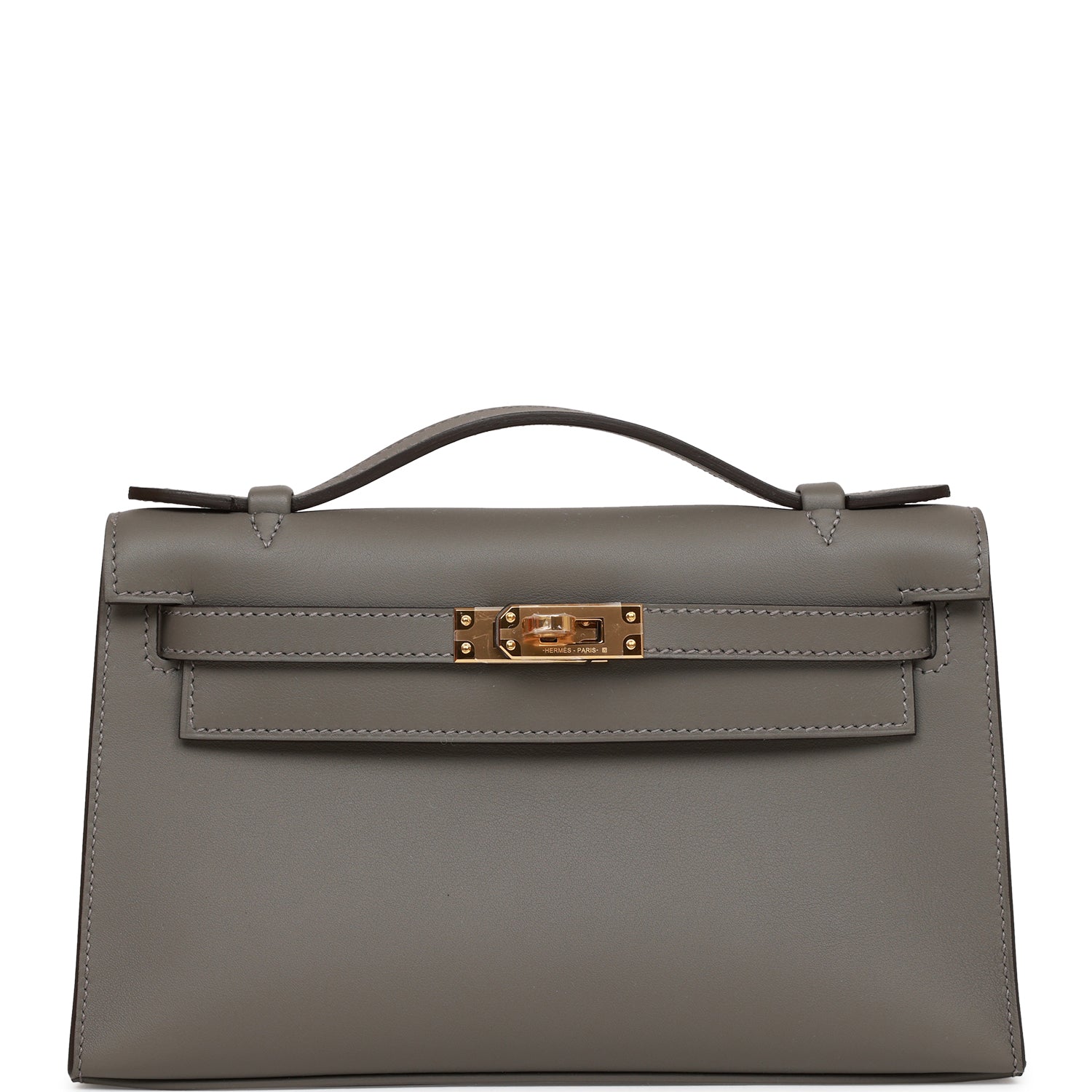 This Mini Kelly Pochette is in Gris Meyer swift leather with gold hardware and has tonal stitching, front flap, two straps with center toggle closure and a top flat handle.