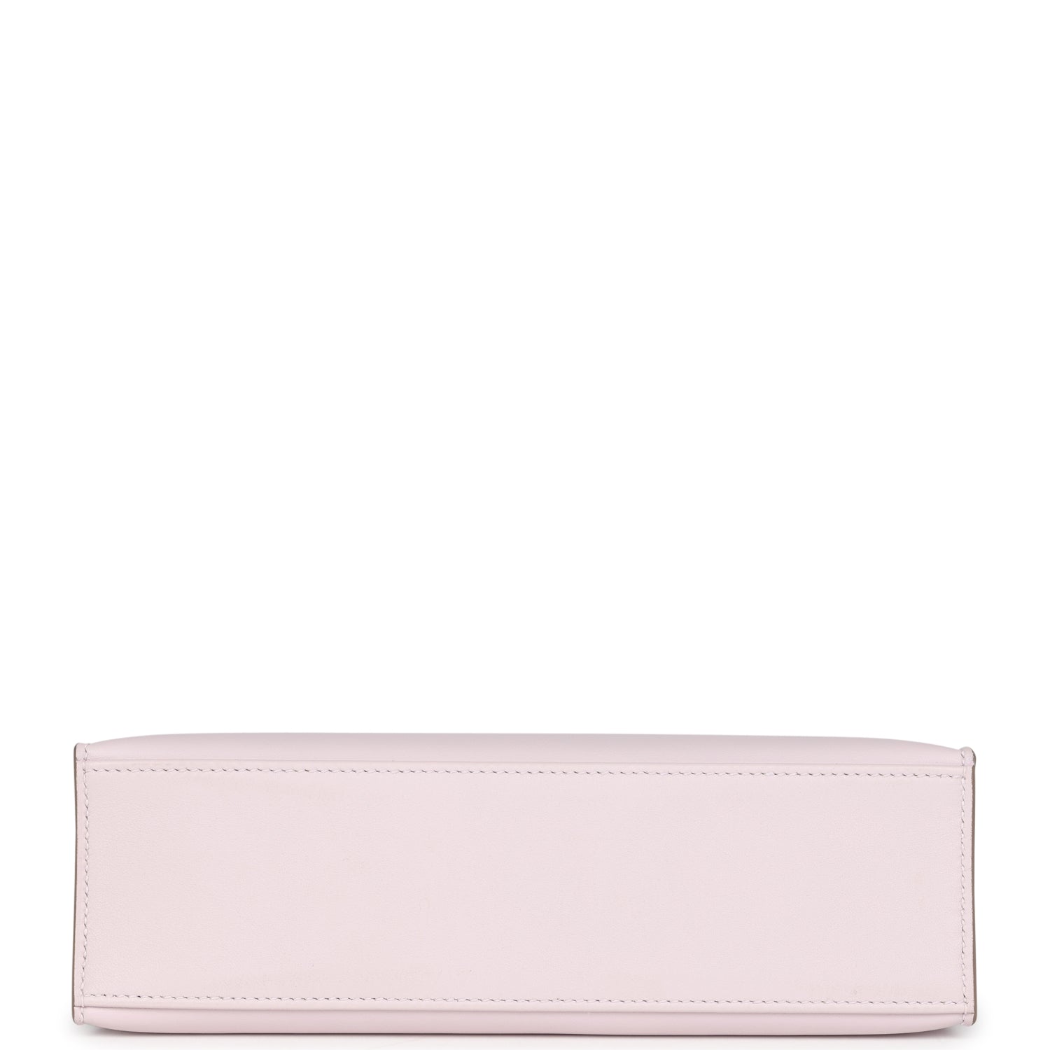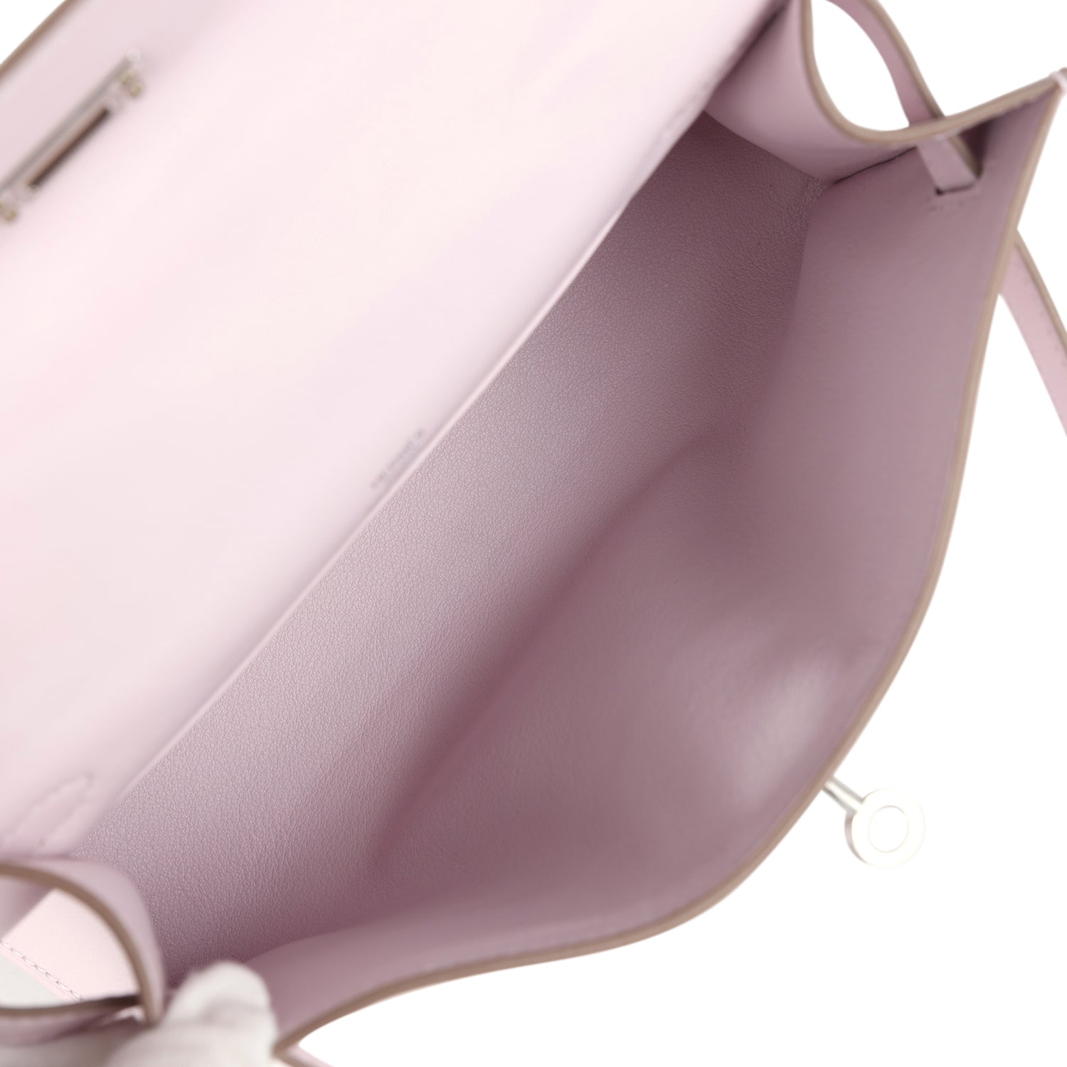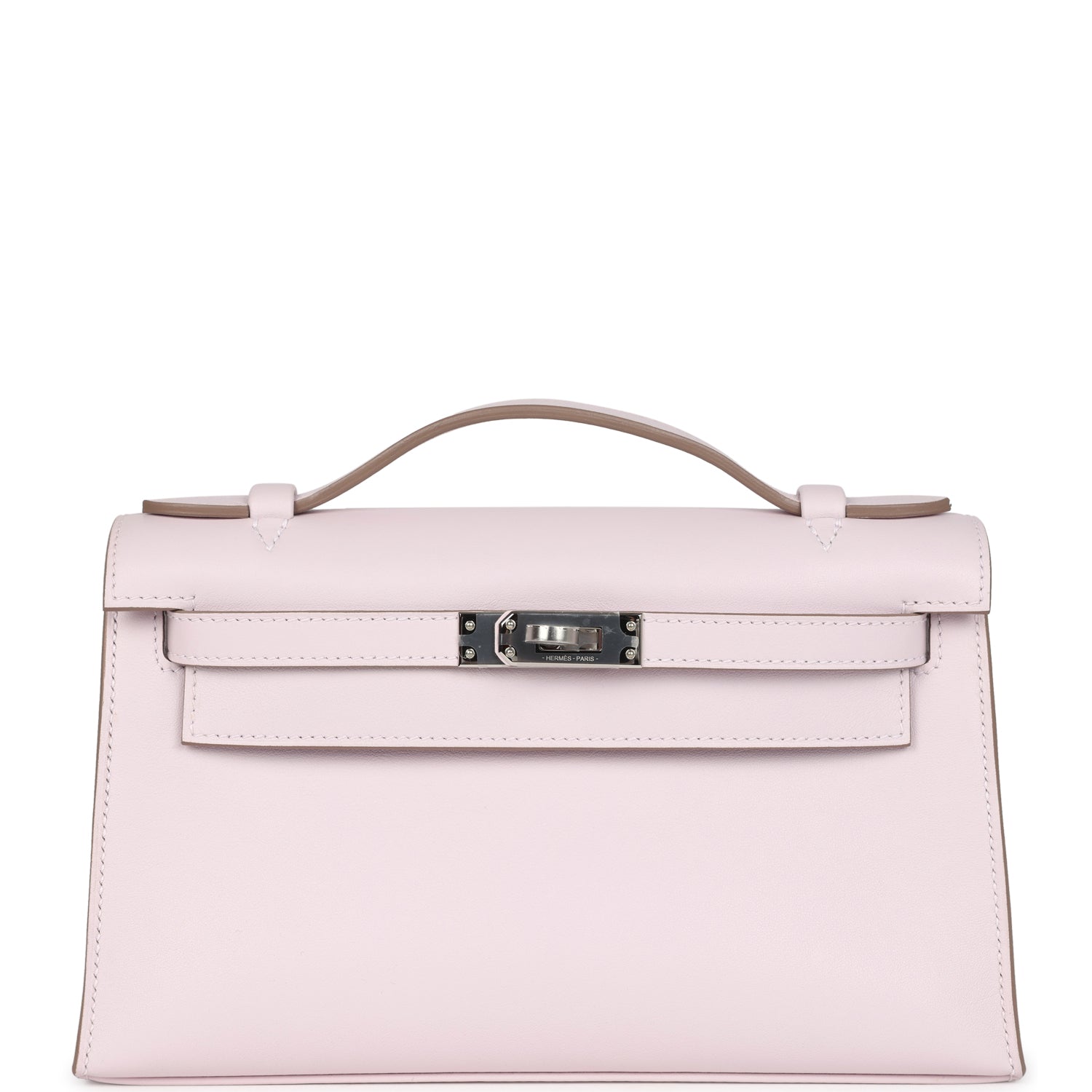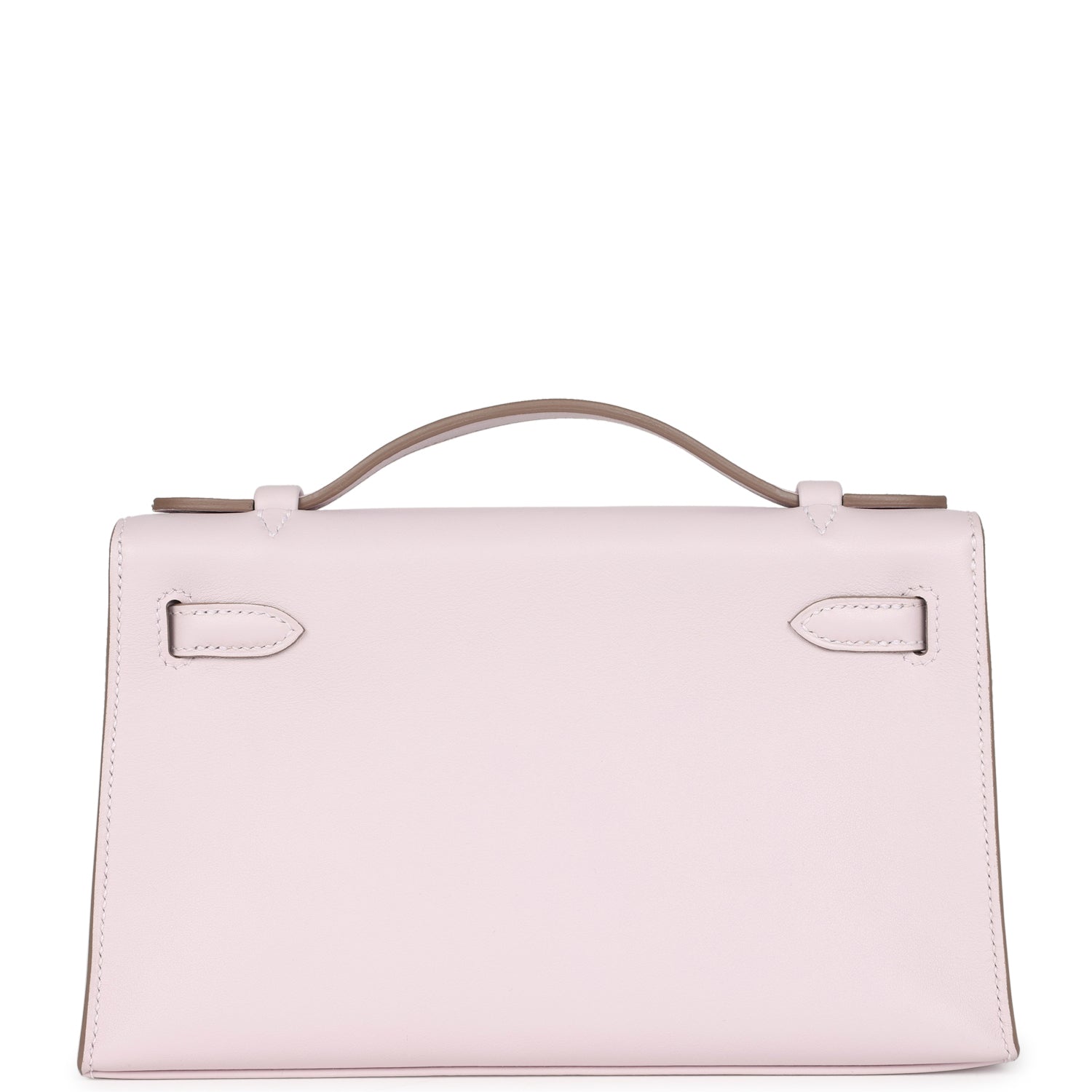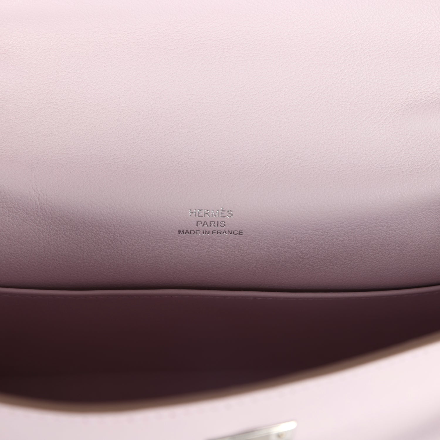 Kelly Pochette is in Mauve Pale swift leather with palladium hardware and has tonal stitching, front flap, two straps with center toggle closure and a top flat handle.
