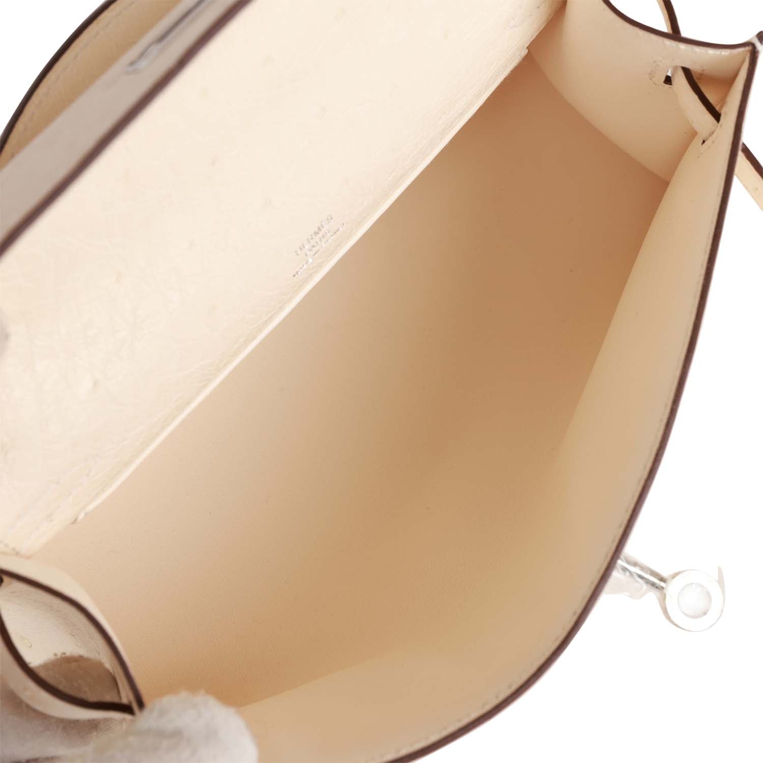 This Mini Kelly Pochette is in Nata ostrich with palladium hardware and has tonal stitching, front flap, two straps with center toggle closure and a top flat handle.