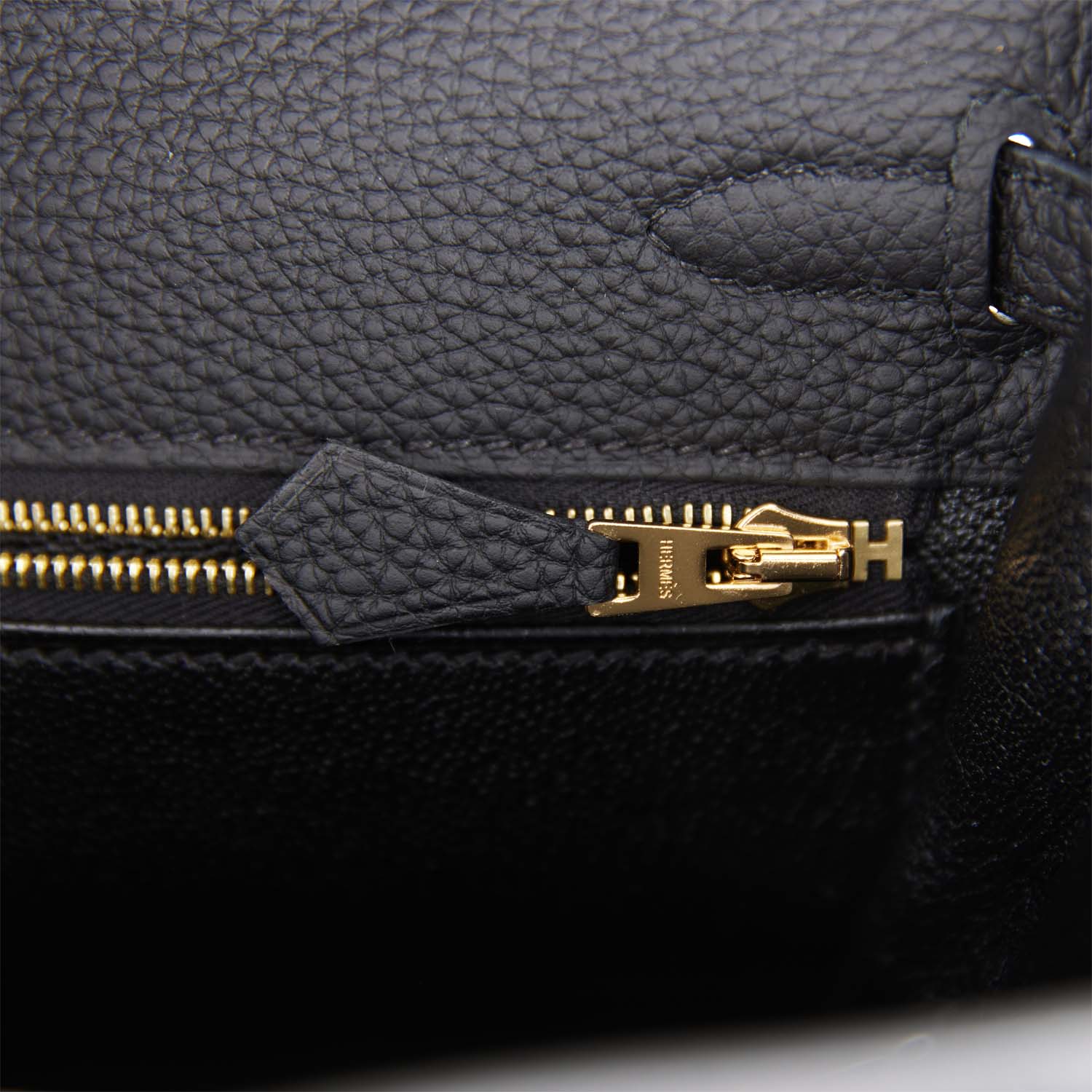 The interior is lined with black chevre leather and has one zip pocket with an Hermes engraved pull and one open pocket on the opposite side.