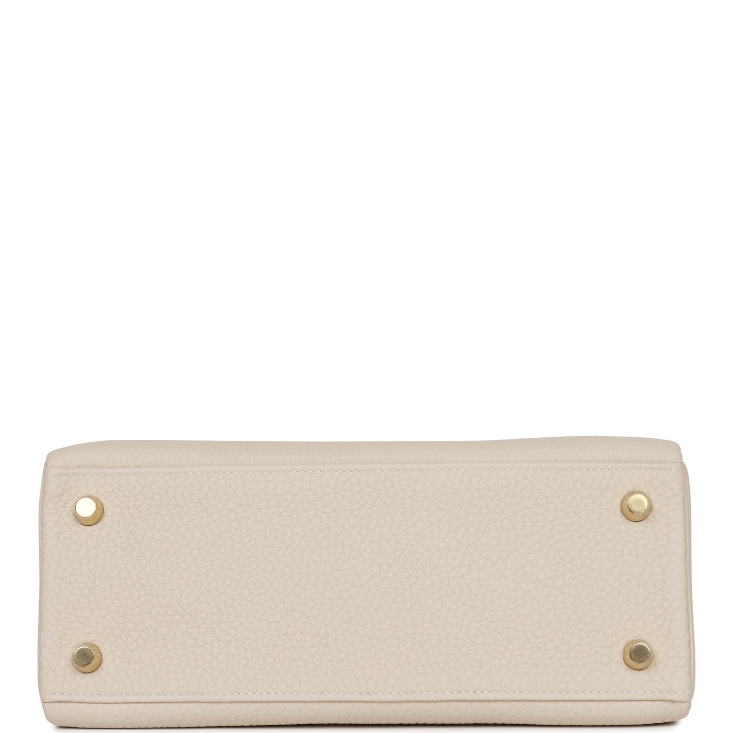 This Kelly, in the Retourne style, is in Craie togo leather with gold hardware and has tonal stitching,front flap, two straps with center toggle closure, clochette with lock and two keys, single rolled handle and removable shoulder strap.