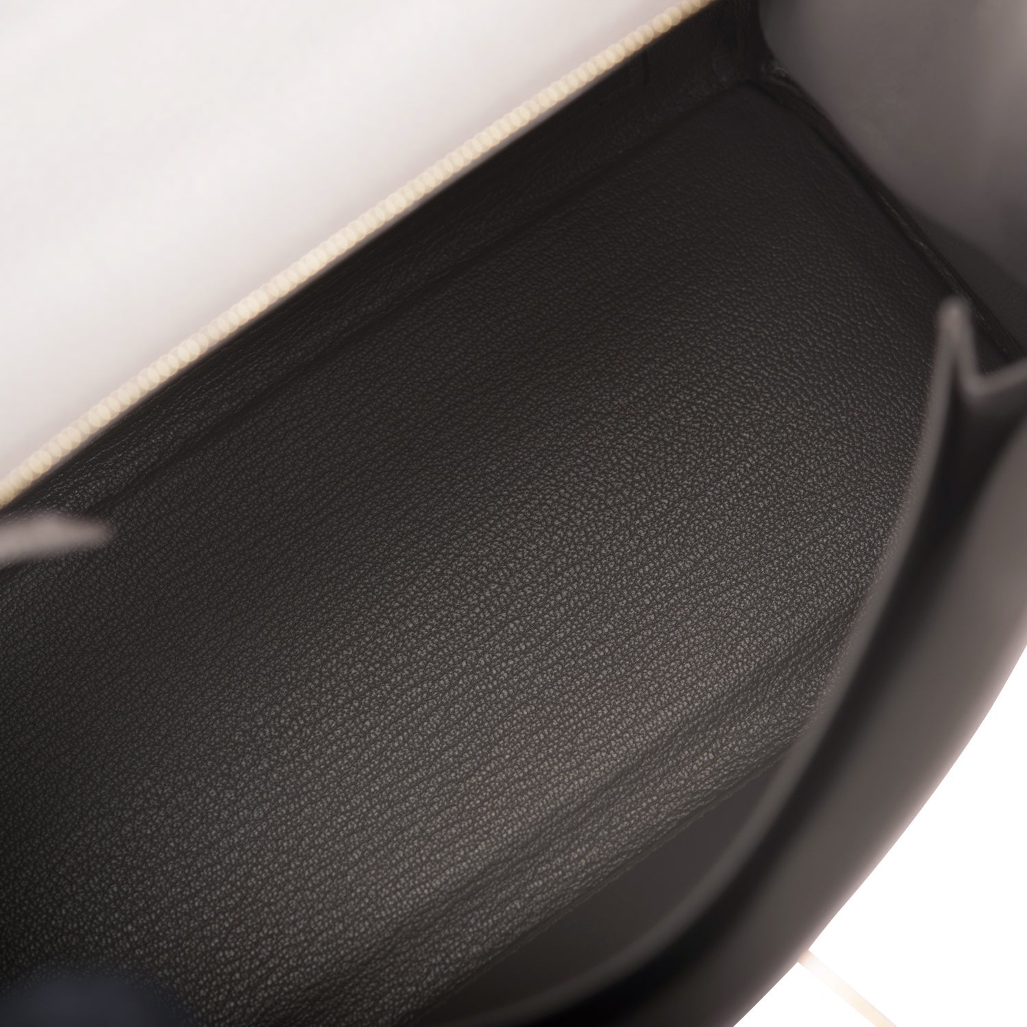 The interior is lined with Etain chevre leather and has one zip pocket with an Hermes engraved pull and one open pocket on the opposite side.