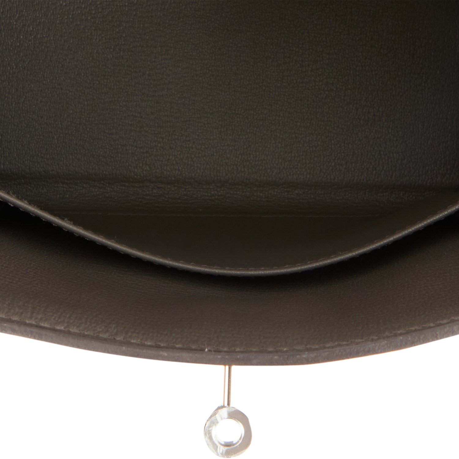The interior is lined in Etain chevre and has one zip pocket with Hermes engraved pull and two open pockets on the opposite side.