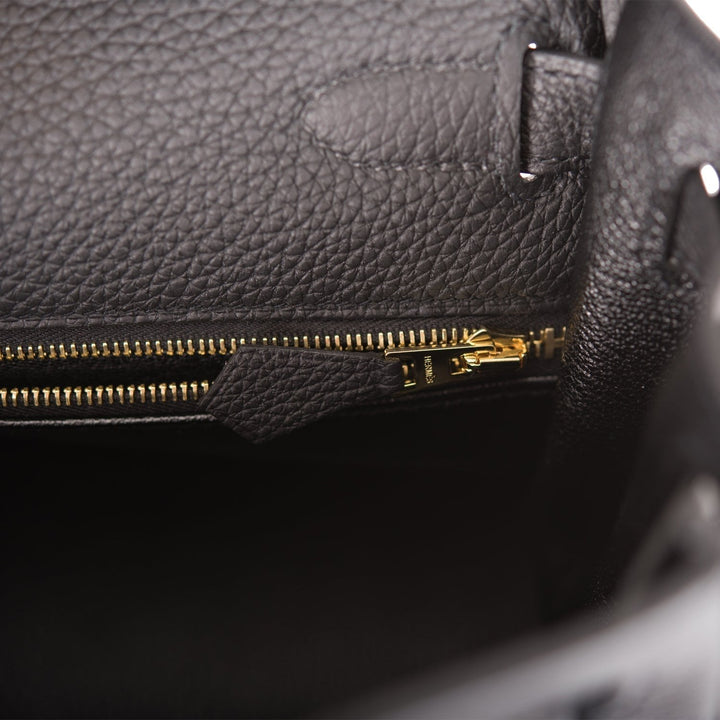 The interior is lined in black chevre and has one zip pocket with Hermes engraved pull and two open pockets on the opposite side.