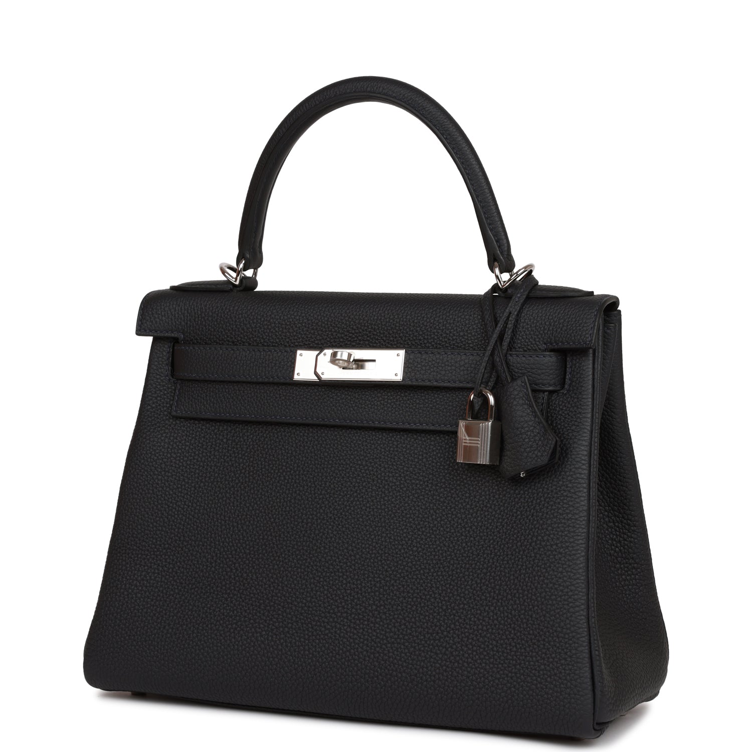 This Kelly, in the Retourne style, is in Caban togo leather with palladium hardware and has tonal stitching, two strap with front toggle closure, clochette with lock and two keys, single rolled handle and removable shoulder strap.
