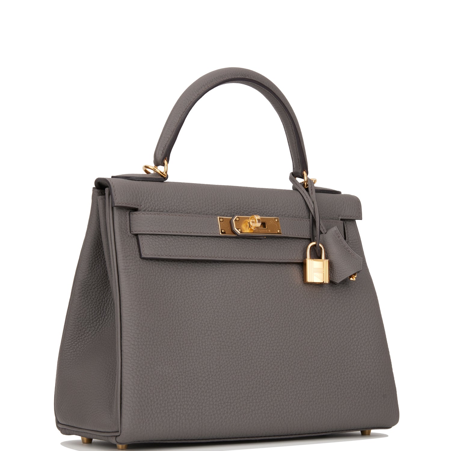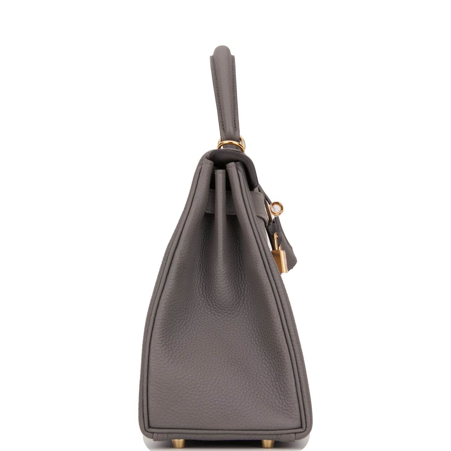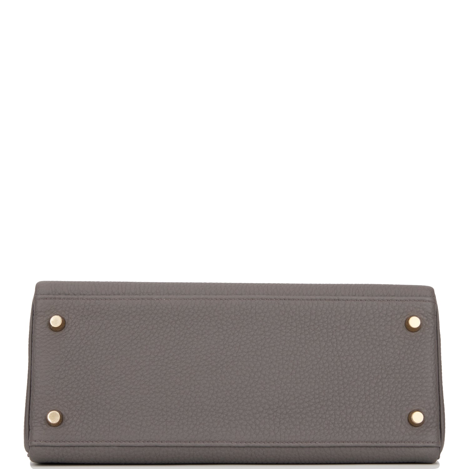 This Kelly, in the Retourne style, is in Etain togo leather with gold hardware and has tonal stitching,front flap, two straps with center toggle closure, clochette with lock and two keys, single rolled handle and removable shoulder strap.